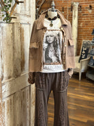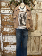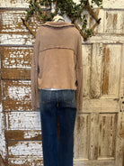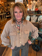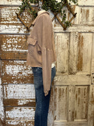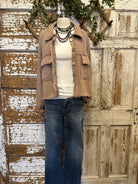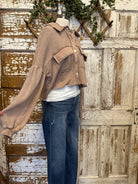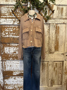 Layer up in effortless style with this tan cropped waffle shacket. Designed in a textured waffle knit for cozy comfort, it features a button-front closure and classic collar for that laid-back yet polished vibe. The cropped cut makes it perfect for pairing with high-rise jeans, barrel pants and Lu Leisure—your go-to lightweight layer for every season.