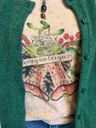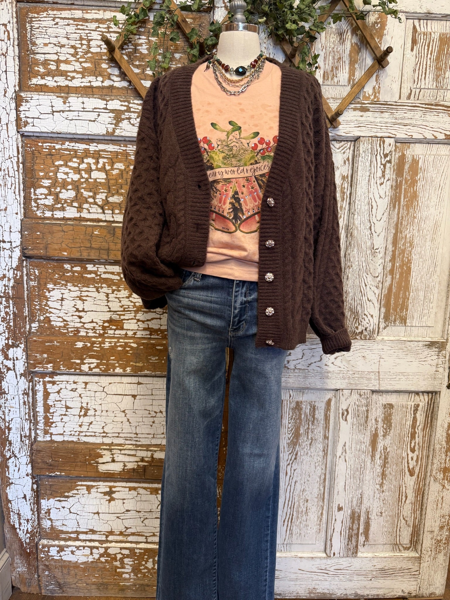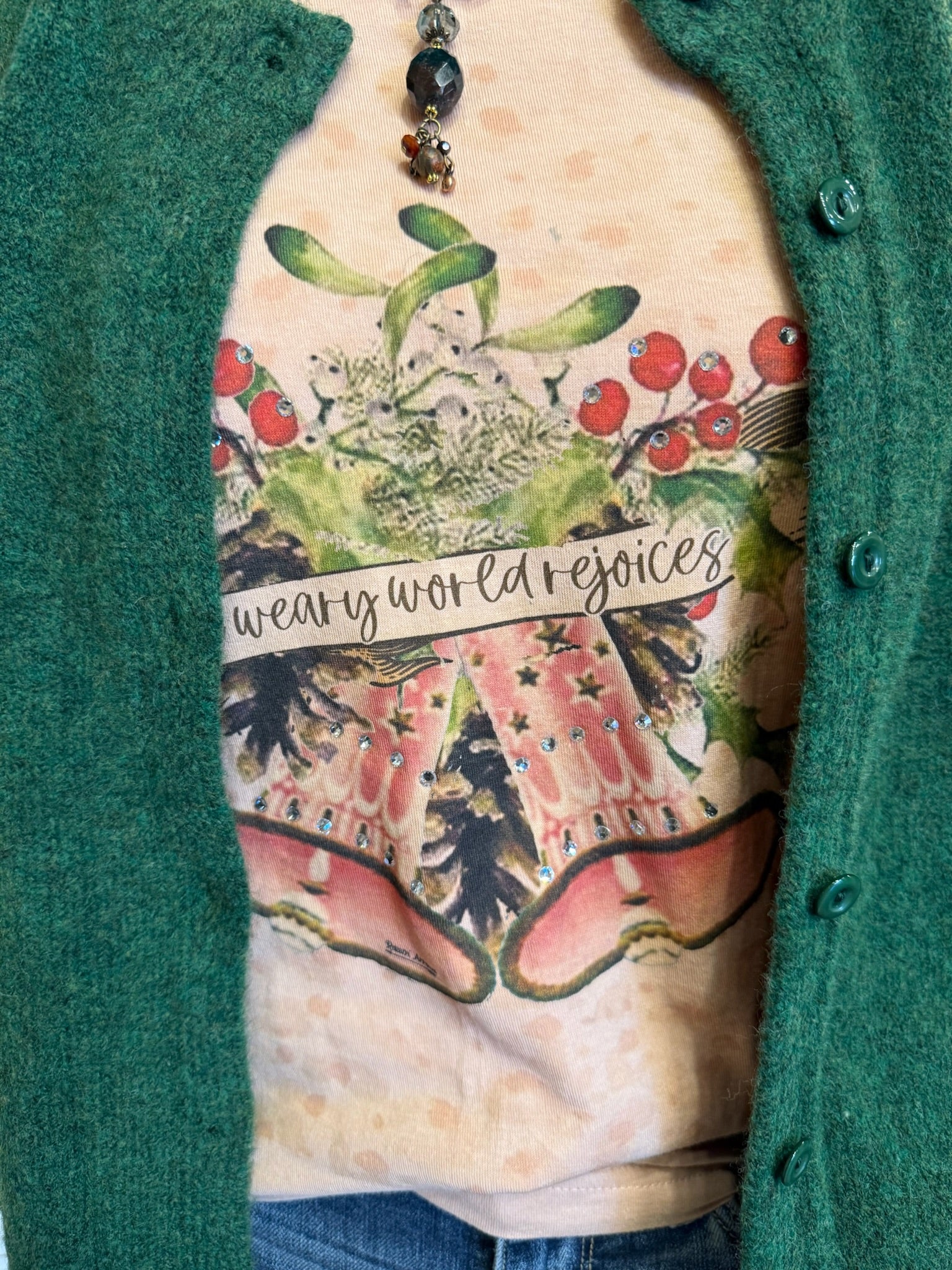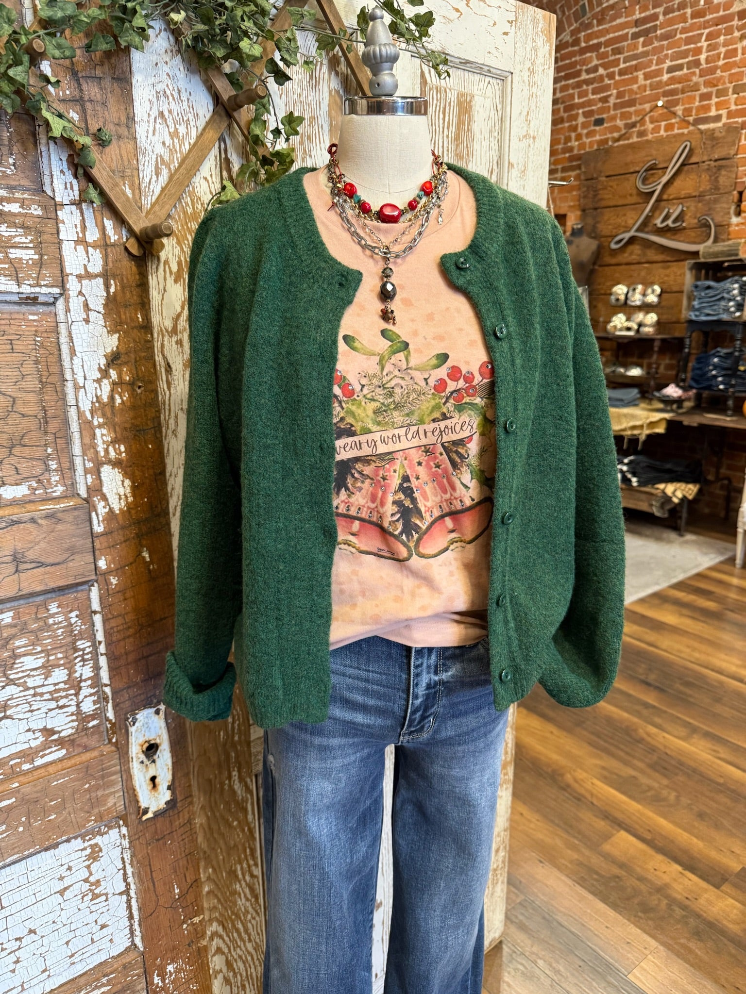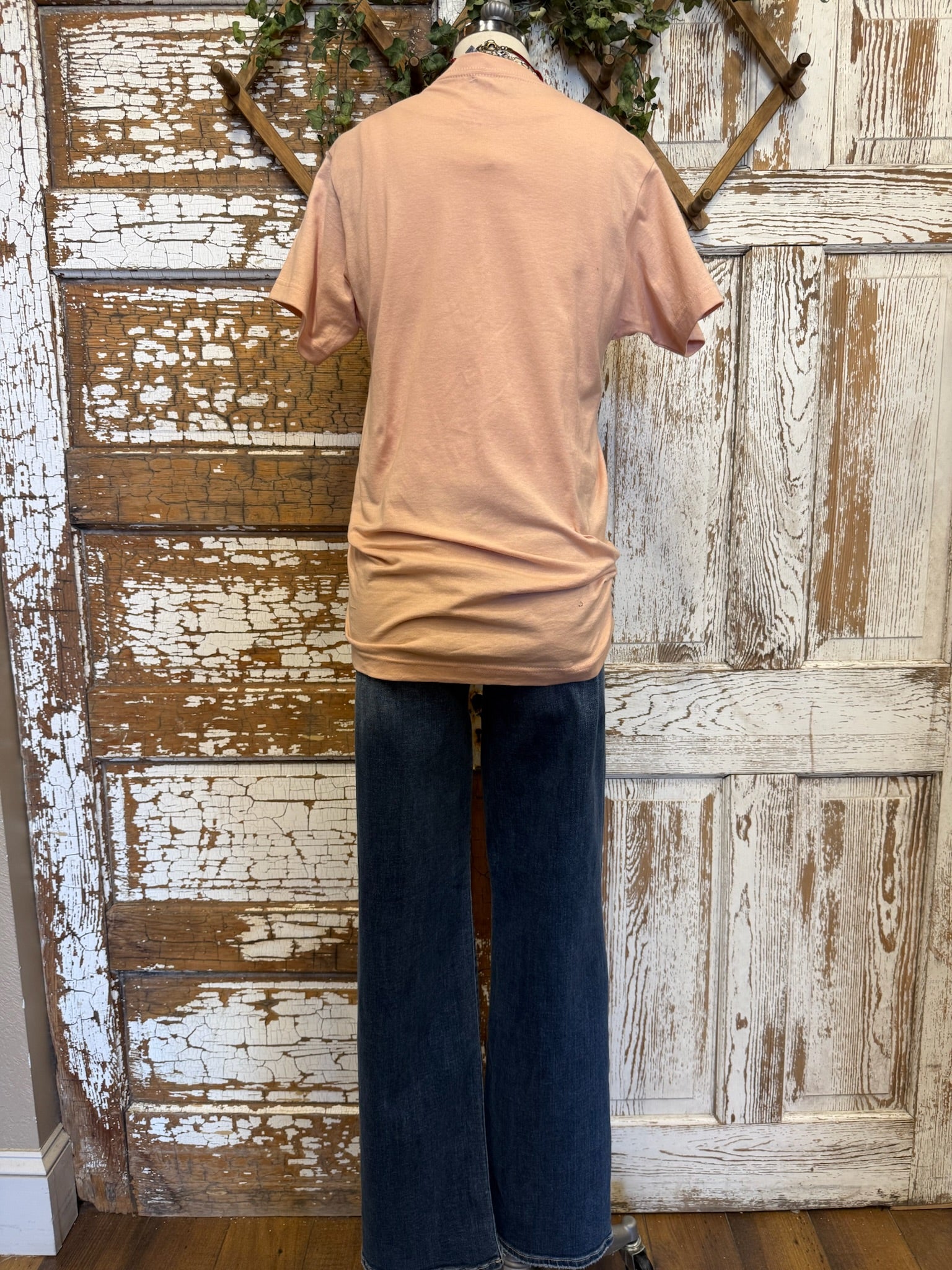 Celebrate the true heart of the season in this sweet peach graphic tee. Vintage-style bells, berries, and greenery frame the message “The weary world rejoices” for a soft and meaningful Christmas look.