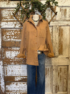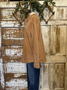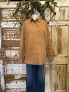 Classic with a touch of rustic charm, this lightweight button-up adds warmth and versatility to your closet. The soft whiskey hue pairs beautifully with denim for an effortlessly chic boutique look.
