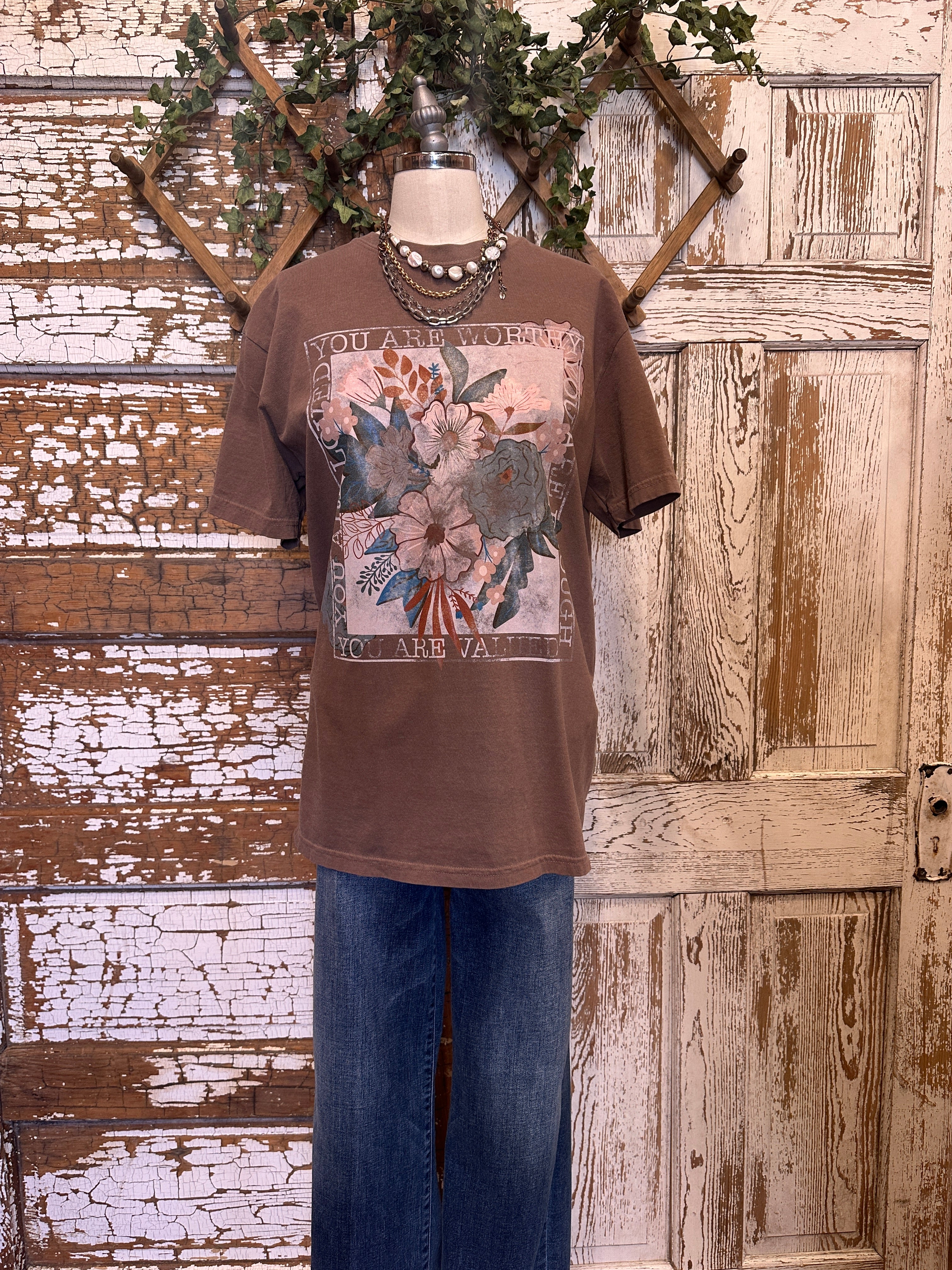 You Are Worthy Valued Brown Floral Graphic T-Shirt: Medium- 2X