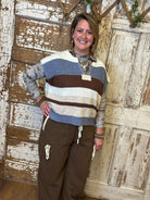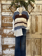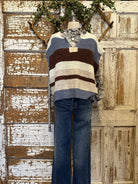 Add boutique charm to your layering game with this blue & brown color black striped knit sweater vest. Featuring neutral blue, brown, and cream tones, it’s the perfect artistic piece to pair with handmade artisan jewelry and seasonal essentials.
