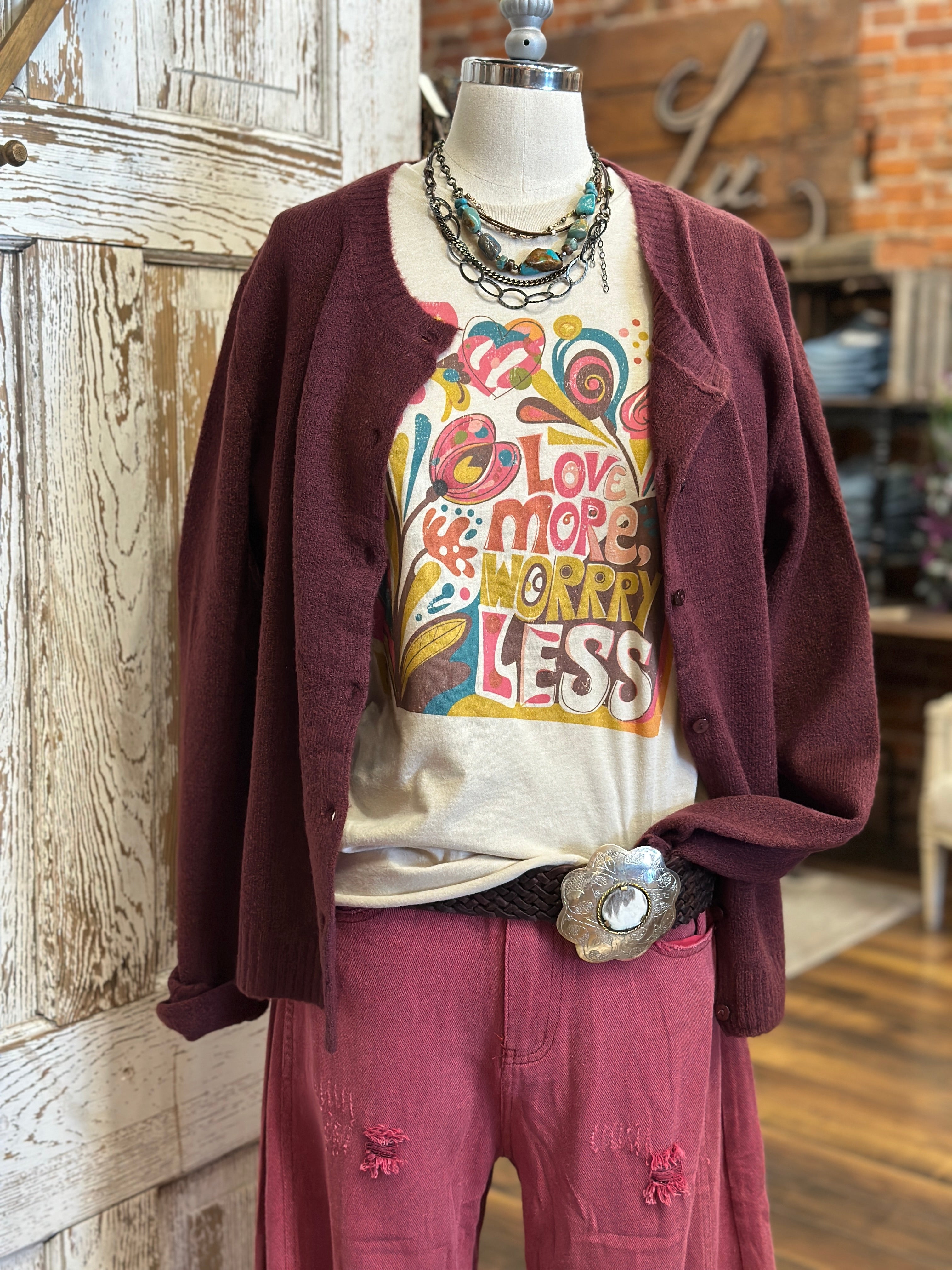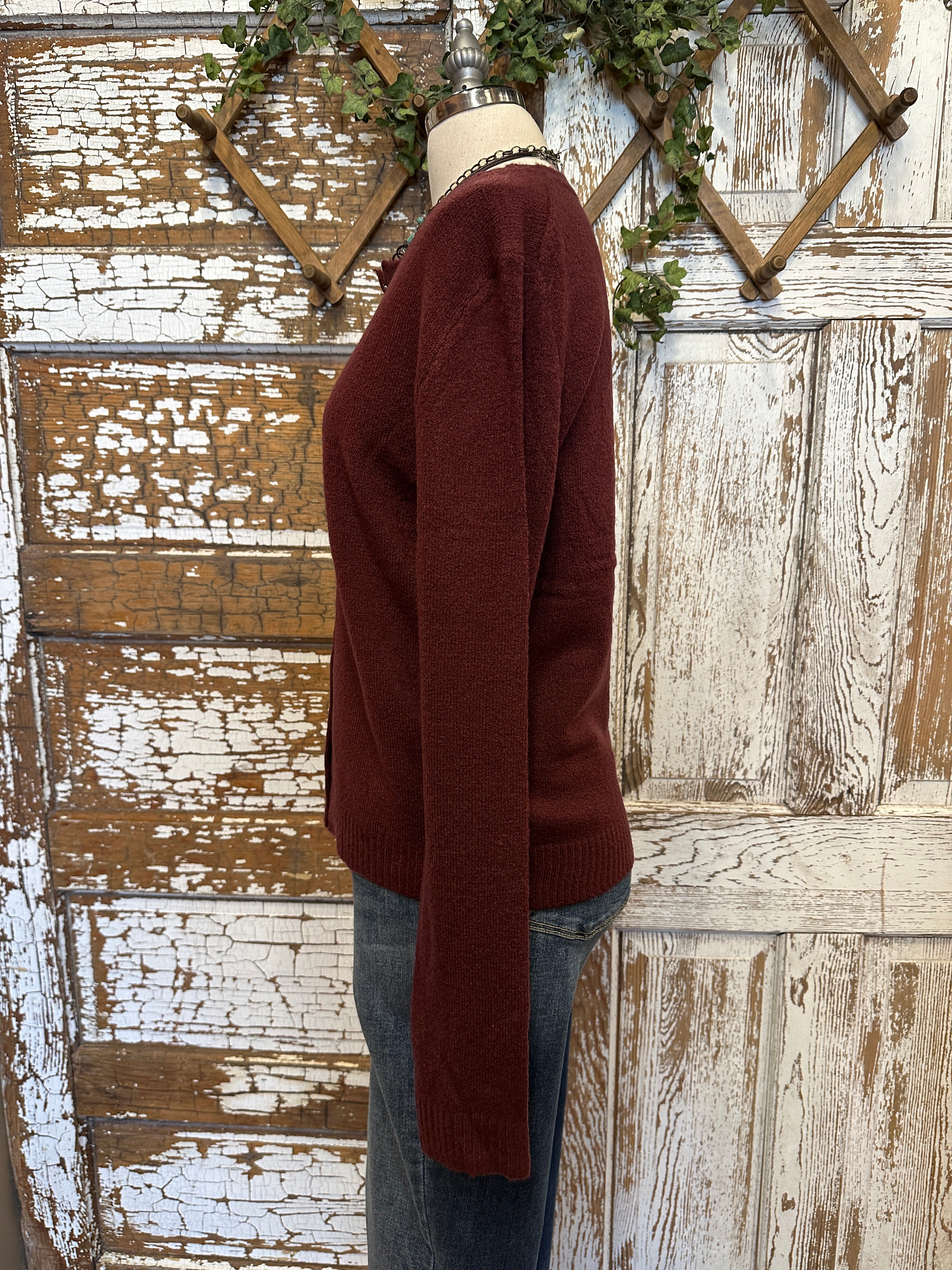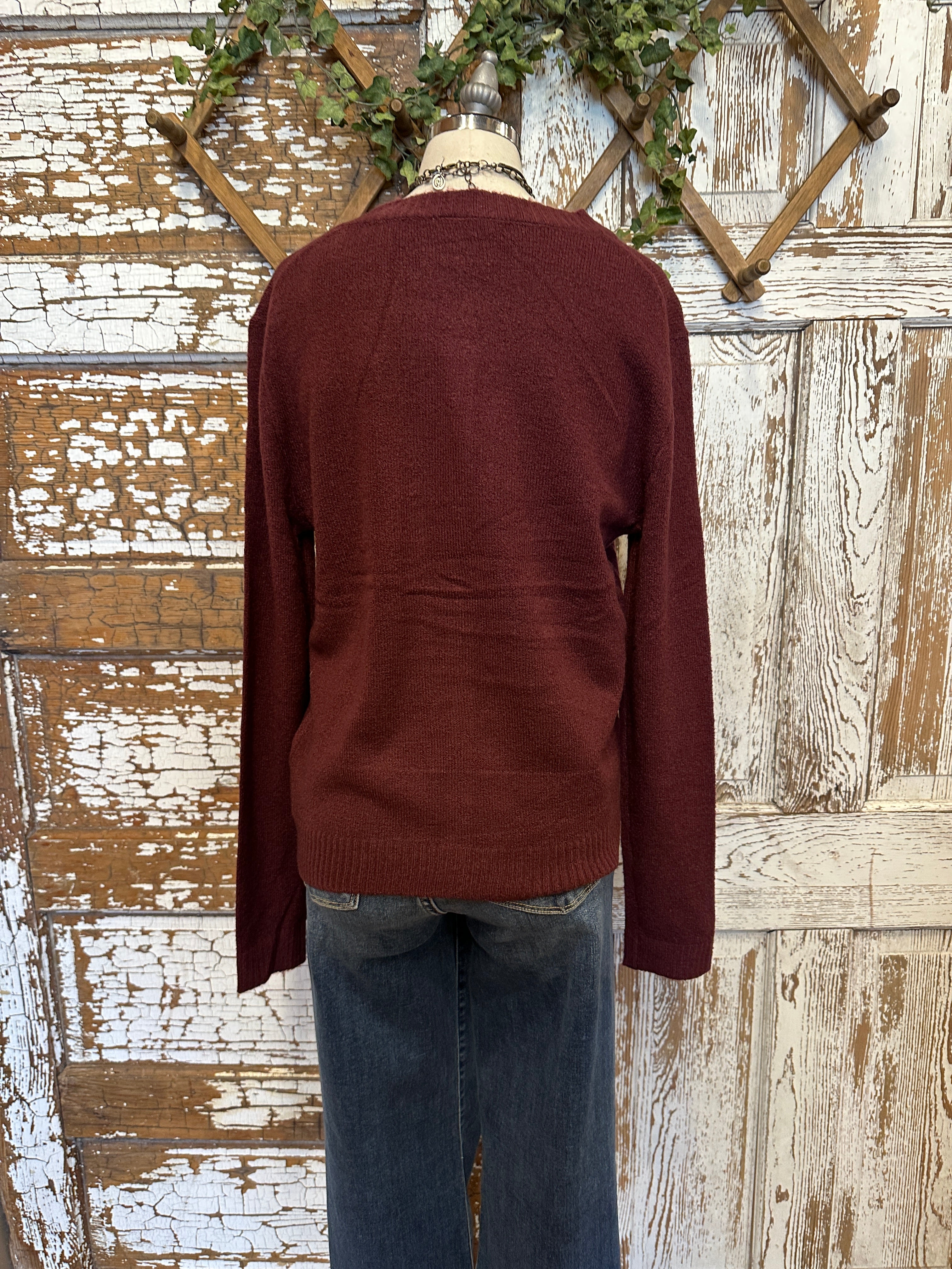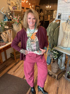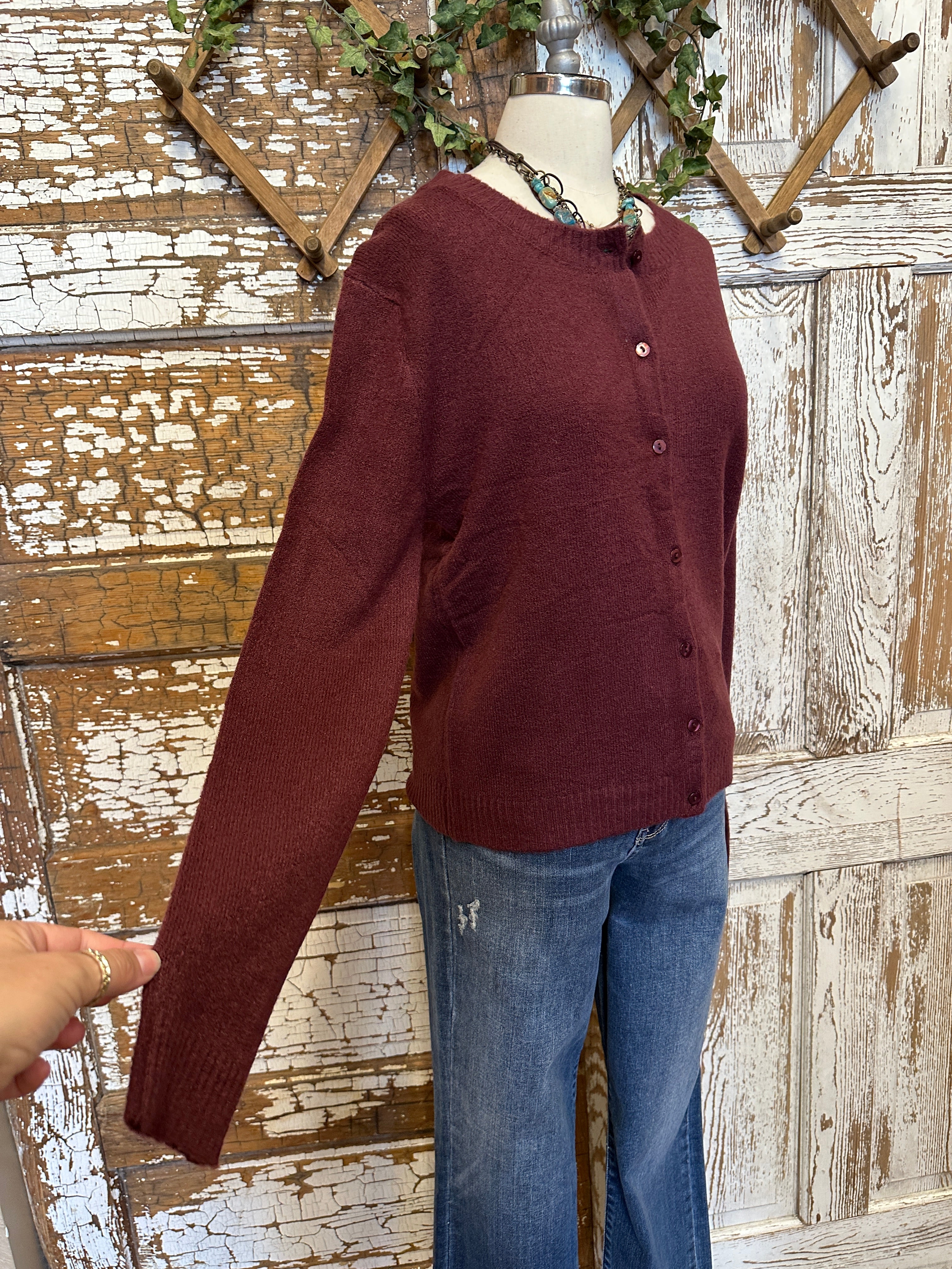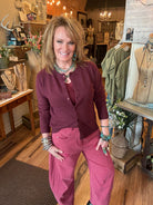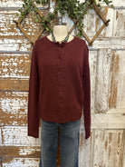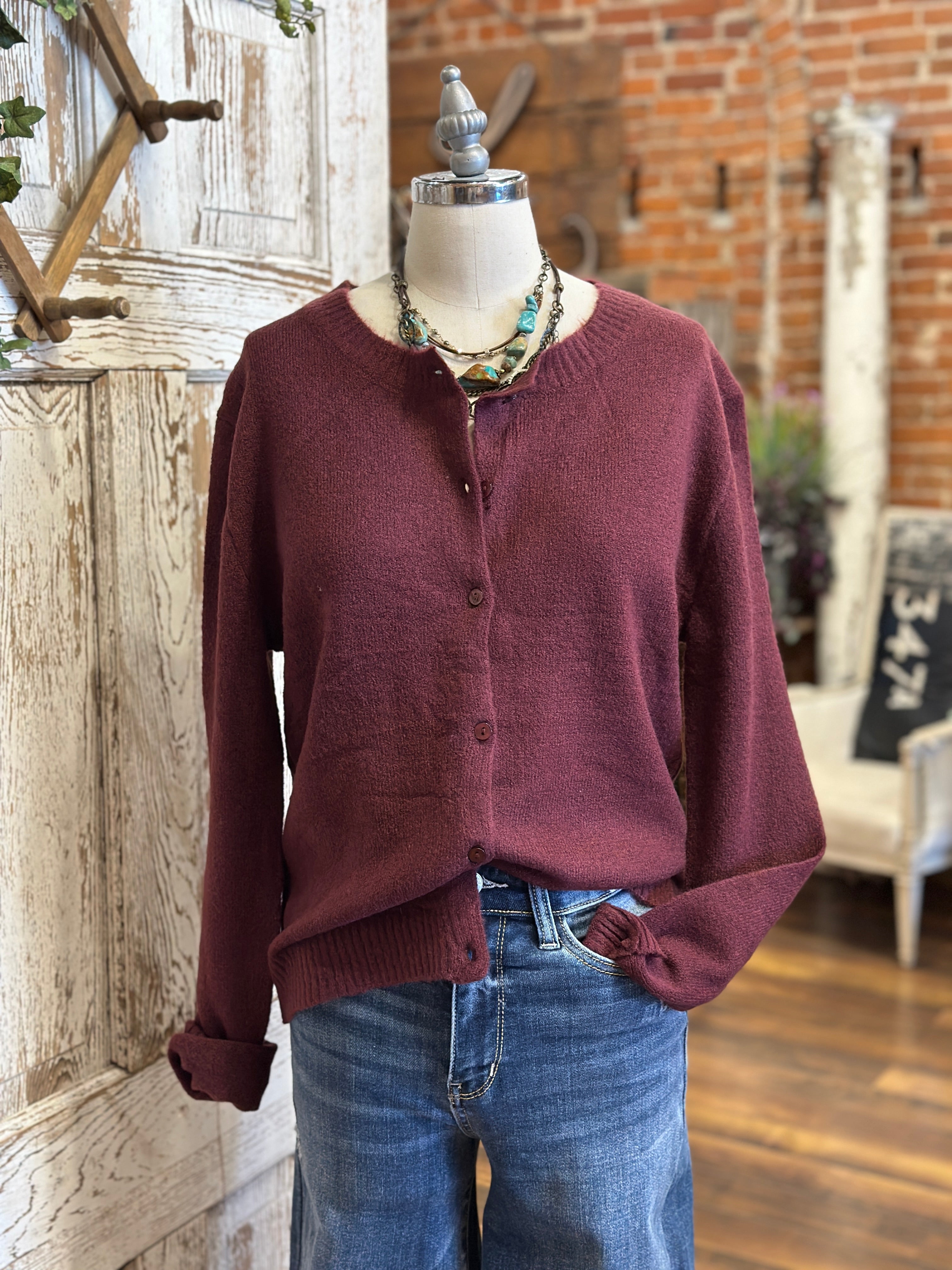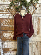 Wrap yourself in timeless style with our Cabernet Cozy Button-Front Cardigan. This cozy essential features a rich, deep burgundy hue that adds a touch of sophistication to any look. Designed with a classic button-down front, it’s perfect for wearing open over a tee or buttoned up for a polished finish. The soft knit fabric offers warmth without bulk, while ribbed cuffs and hem provide a snug, flattering fit.