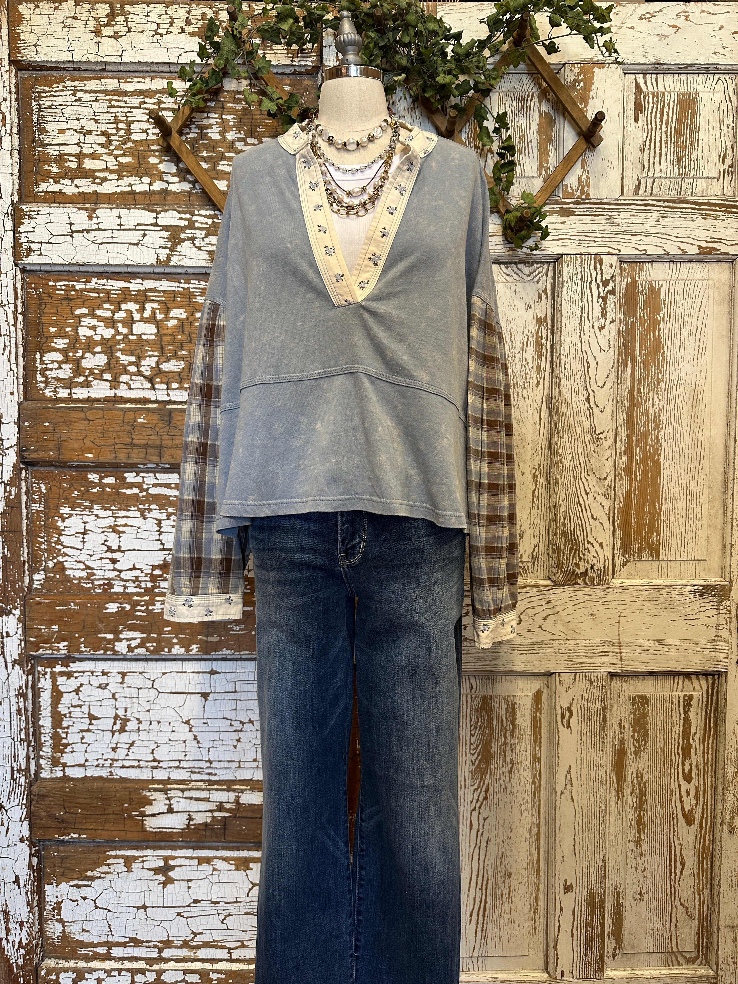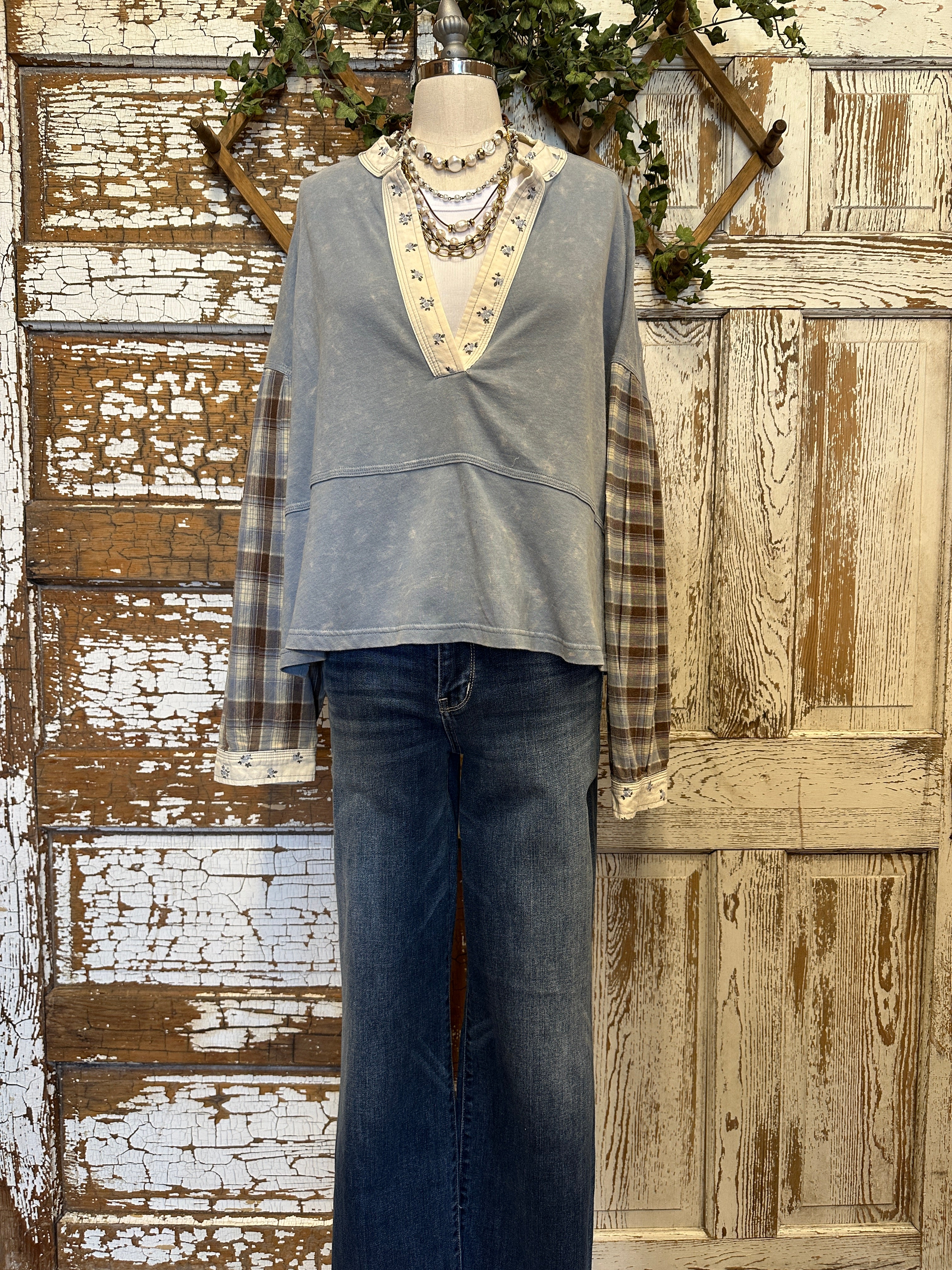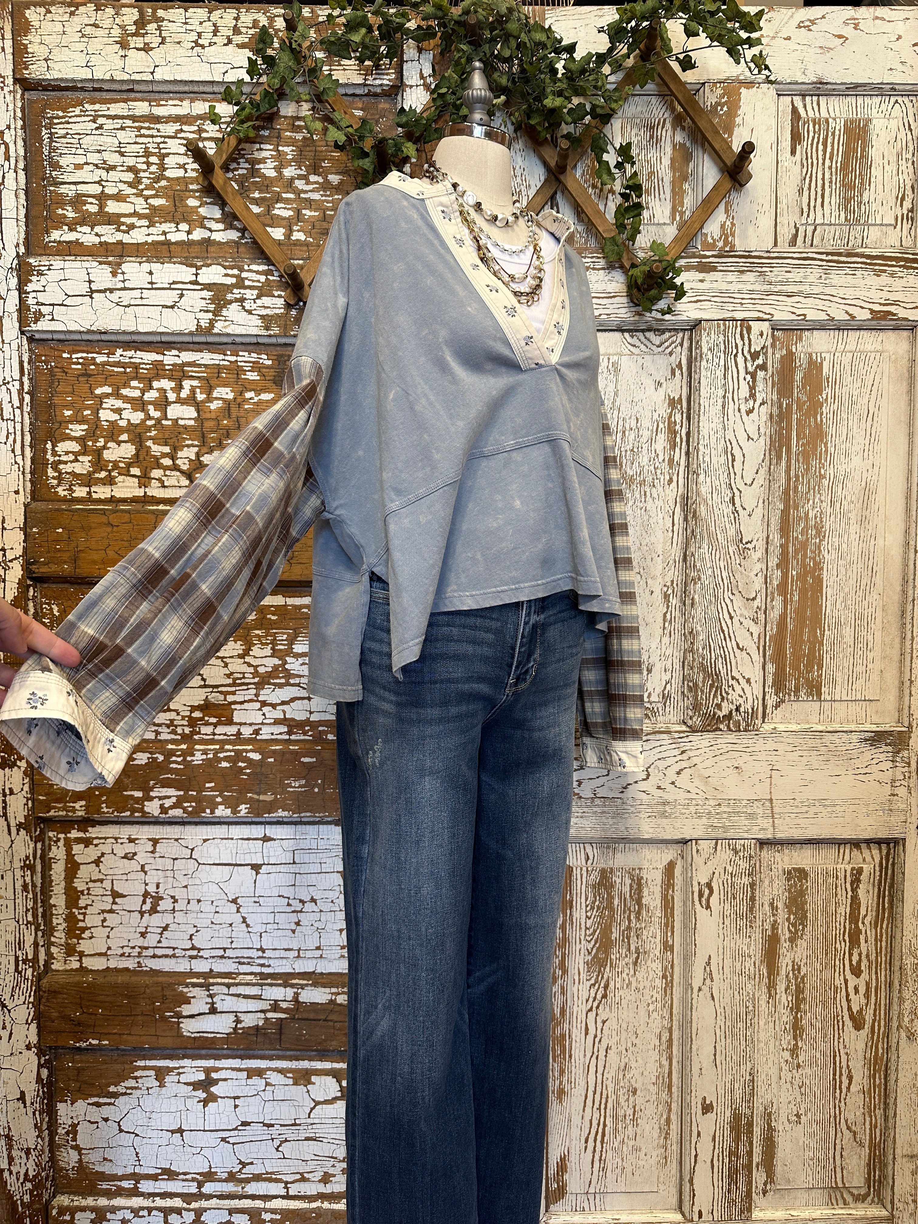 This Athena blue mixed media popover top blends modern minimalism with boutique artistry. Featuring plaid sleeves, a soft washed-blue bodice, and floral trim, it’s styled perfectly with layered handmade artisan jewelry for an effortlessly chic finish.