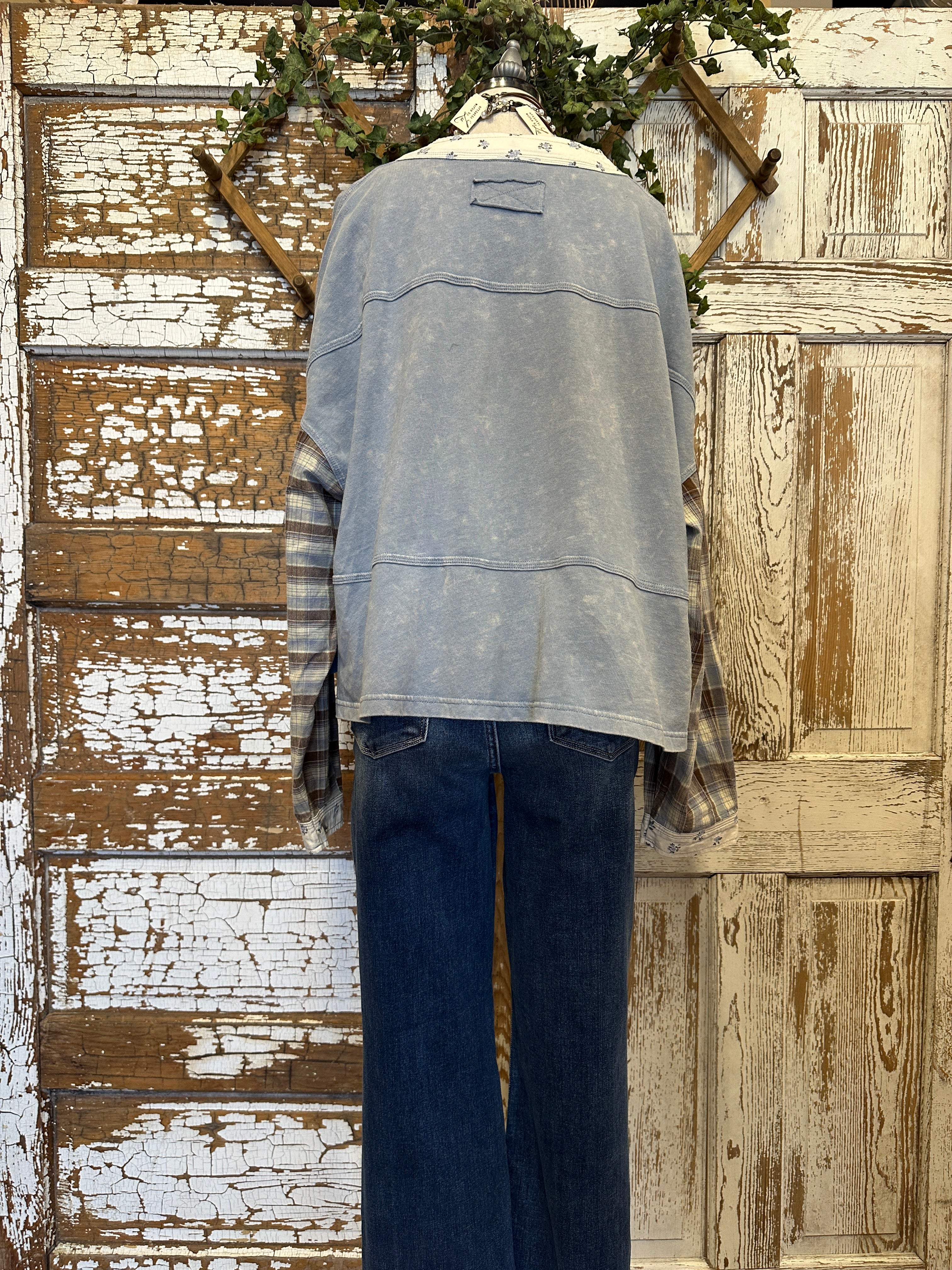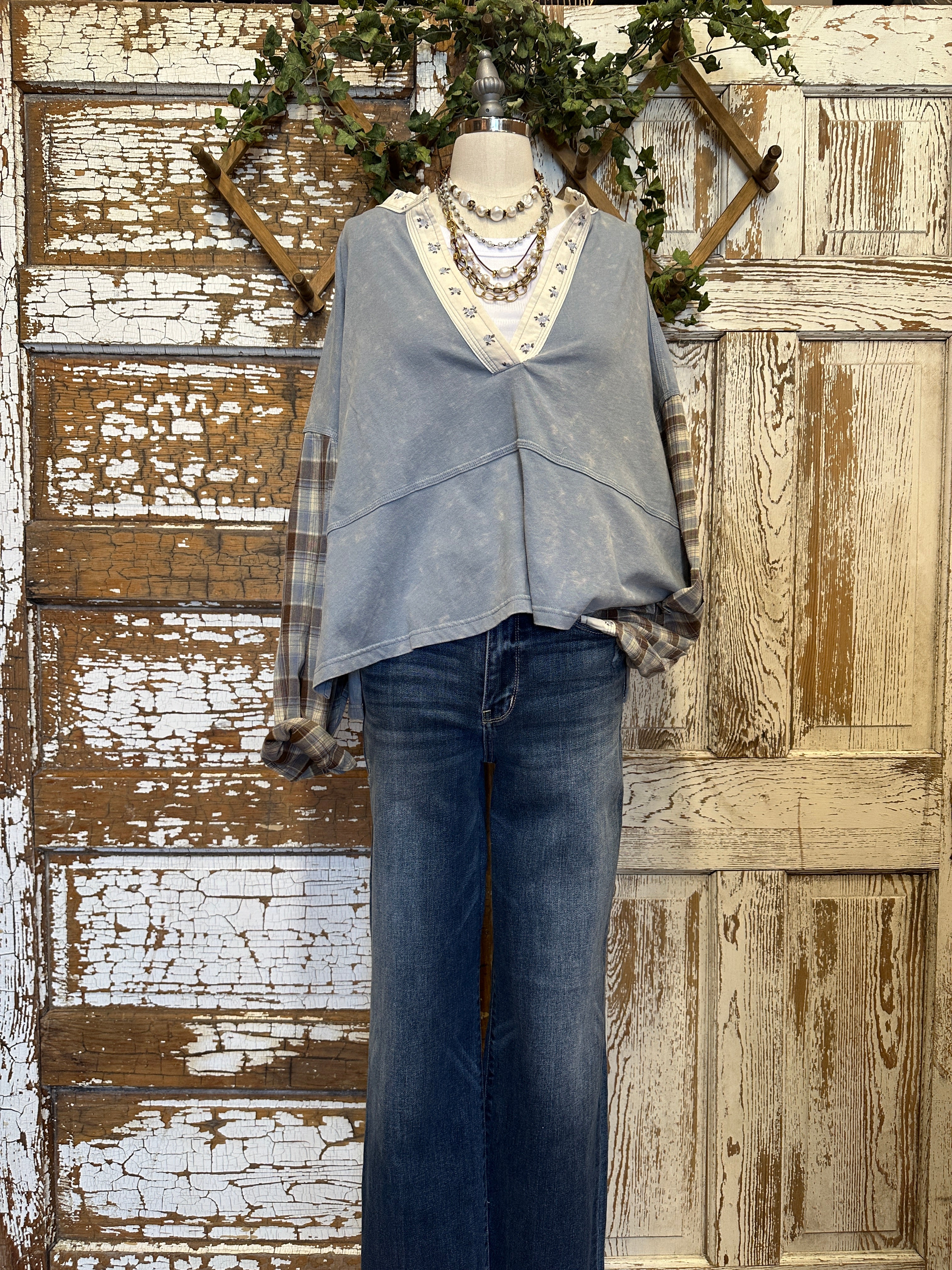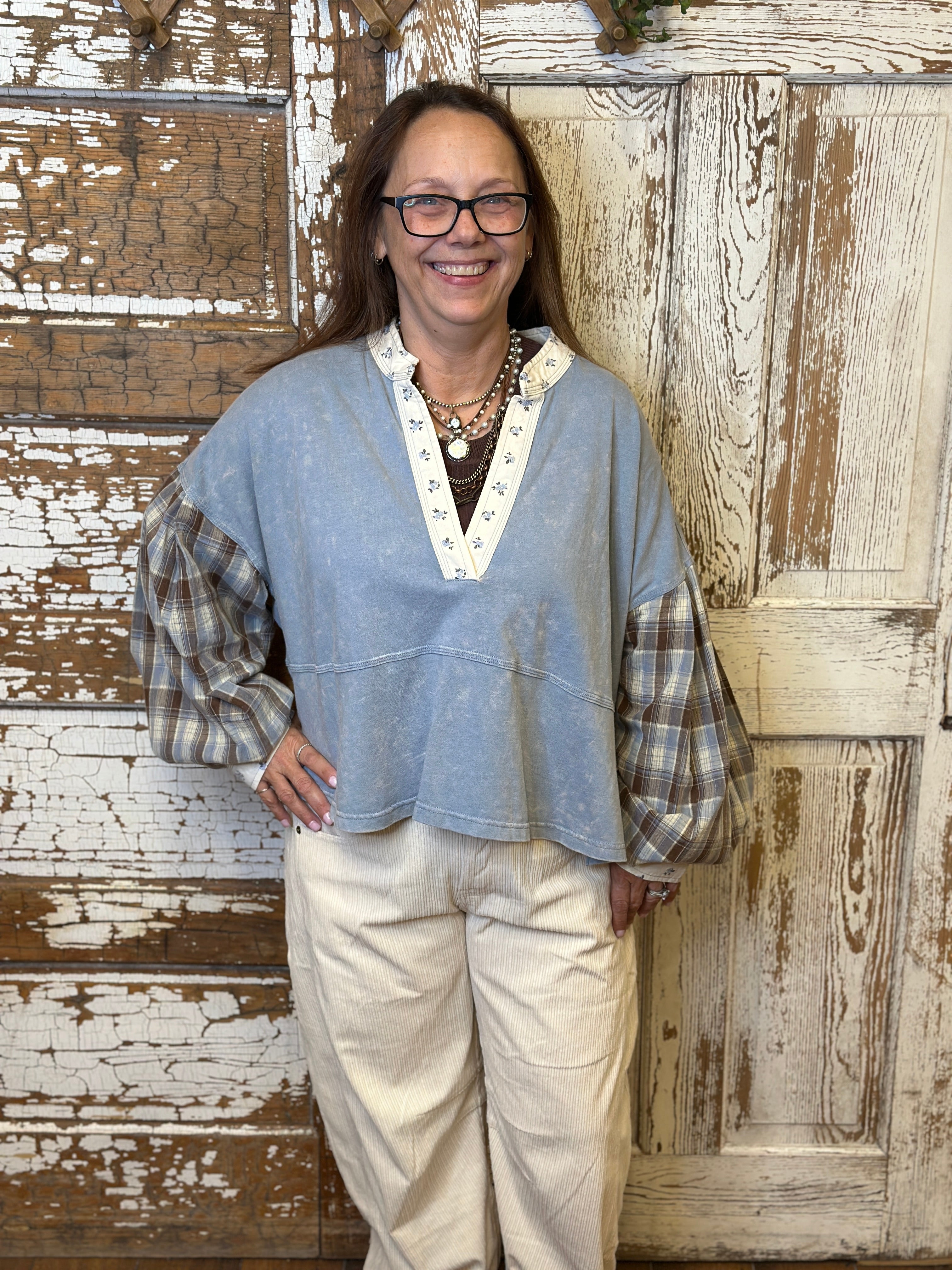 This Athena blue mixed media popover top blends modern minimalism with boutique artistry. Featuring plaid sleeves, a soft washed-blue bodice, and floral trim, it’s styled perfectly with layered handmade artisan jewelry for an effortlessly chic finish.