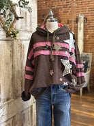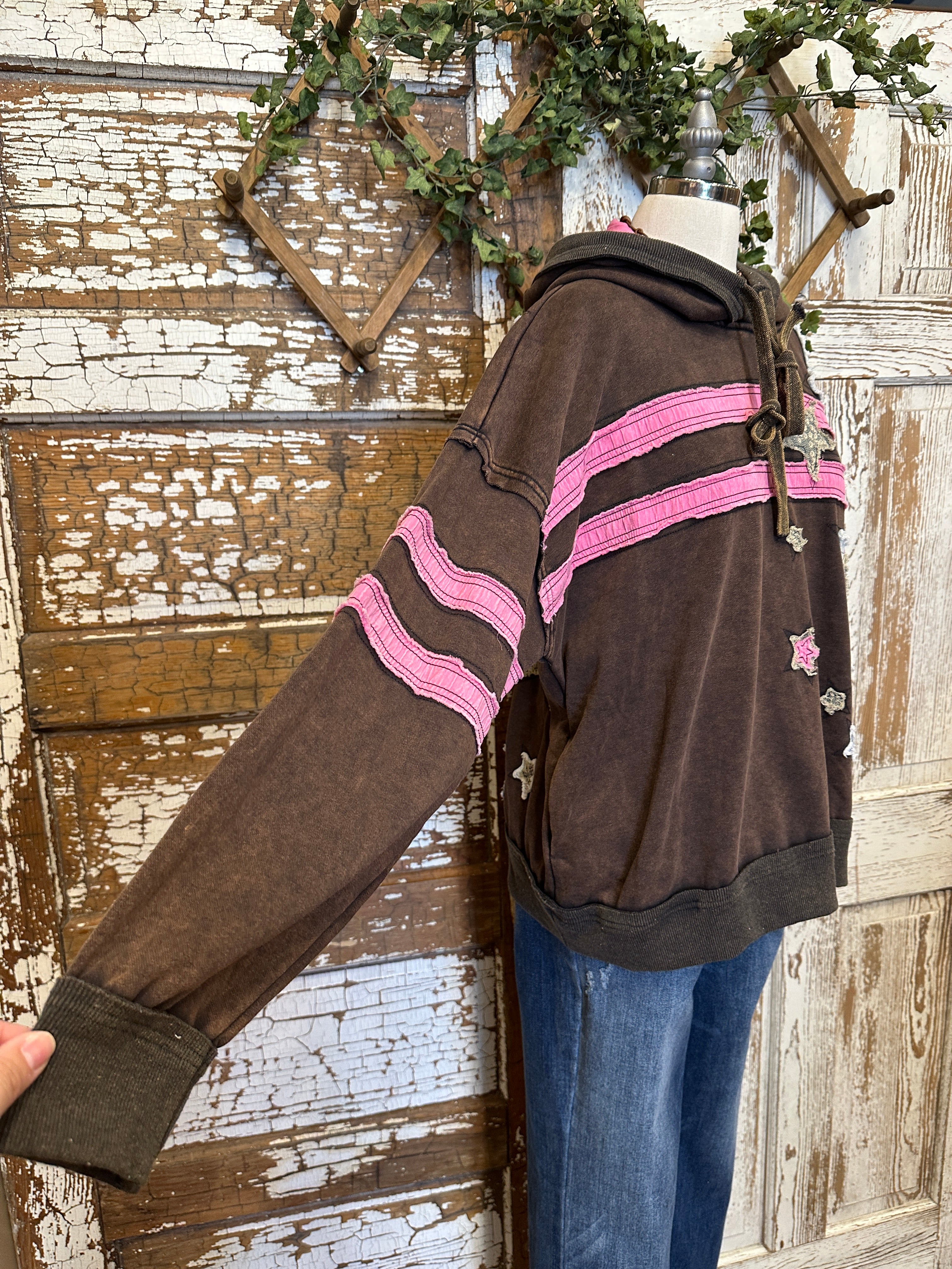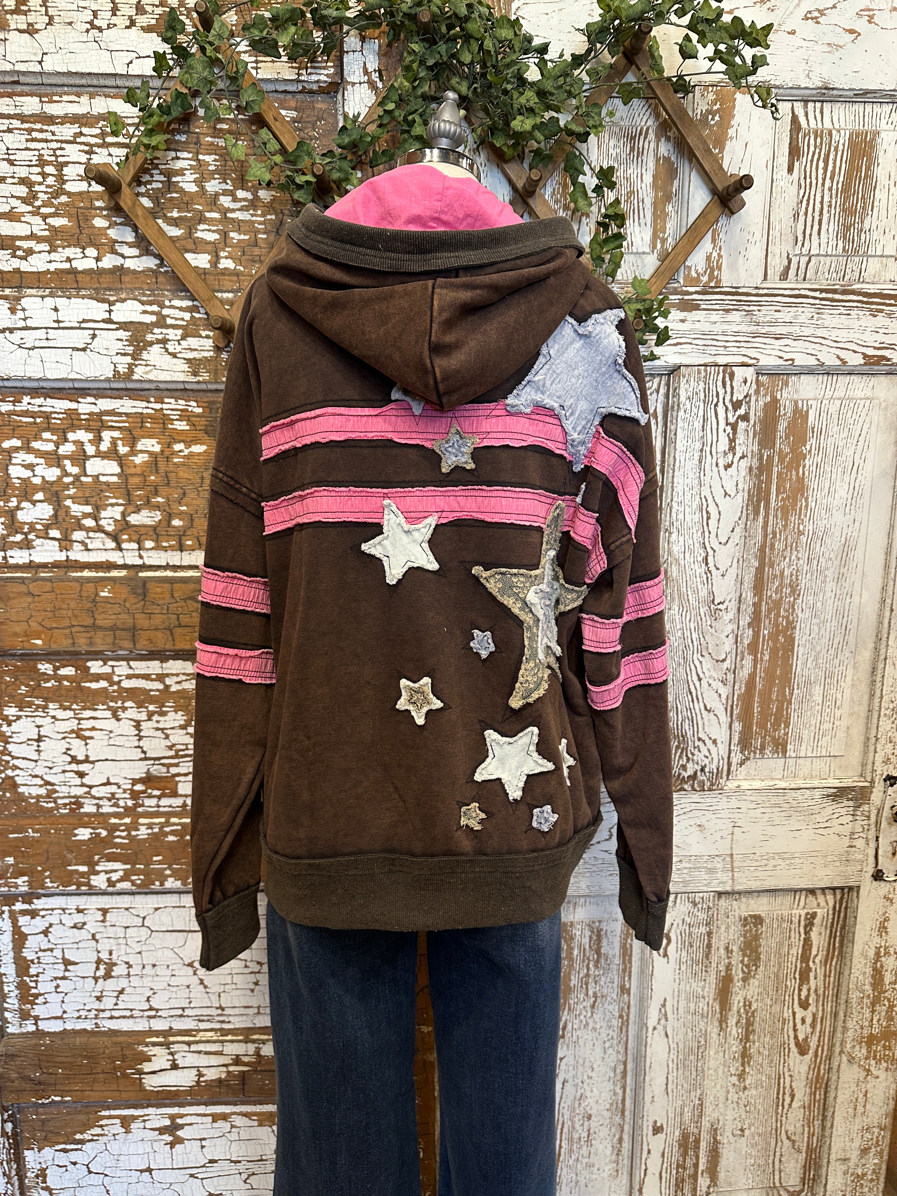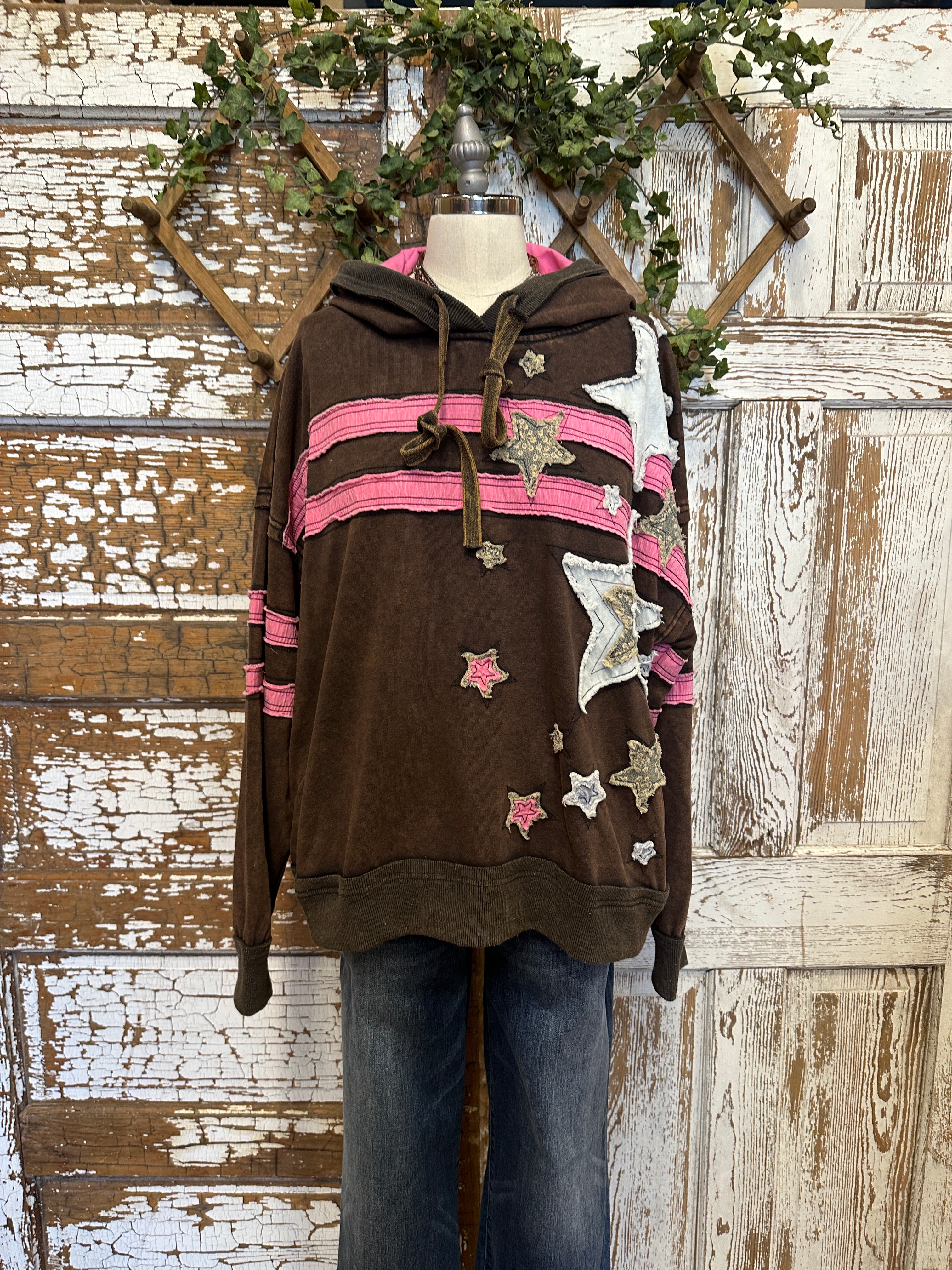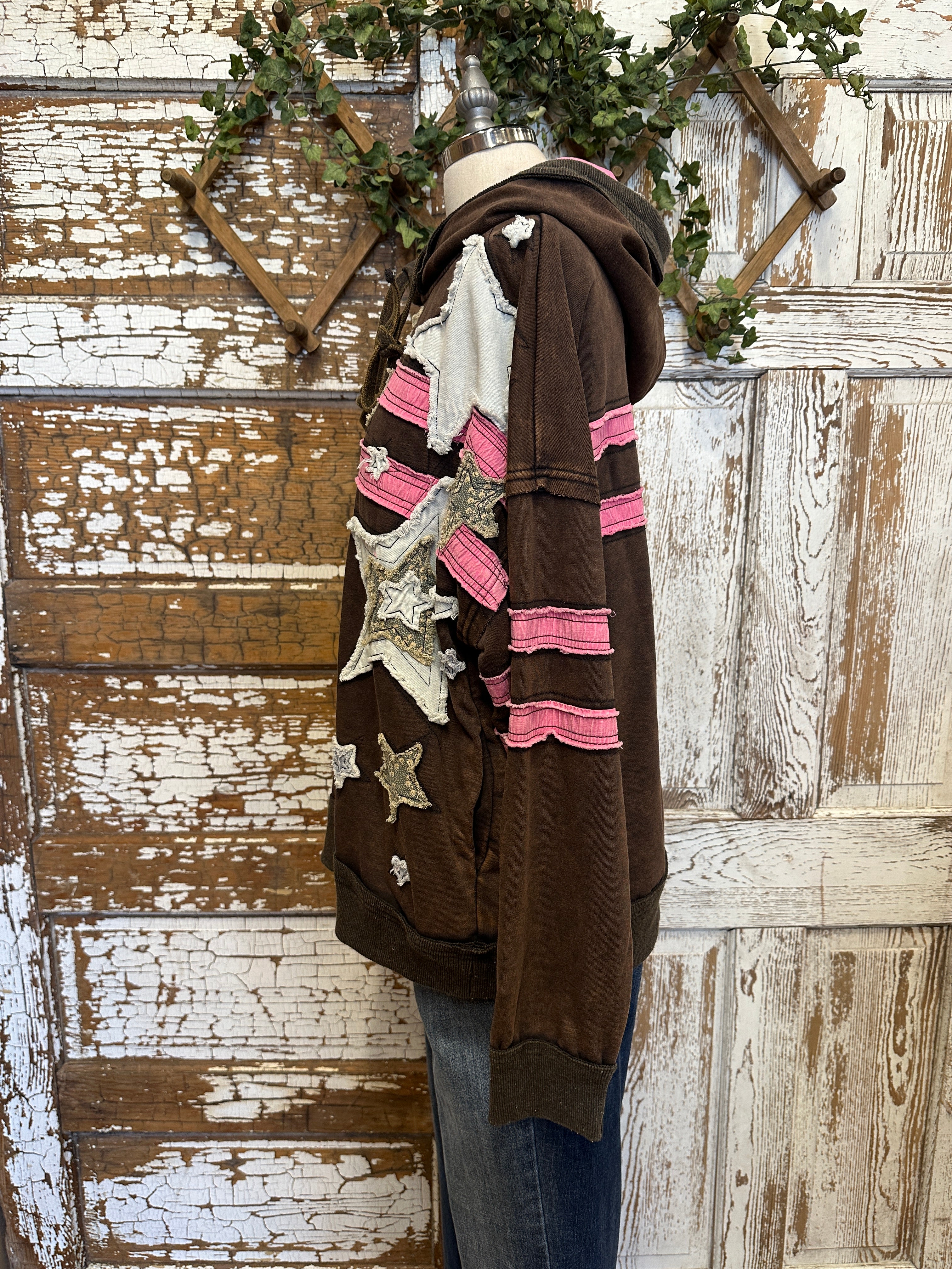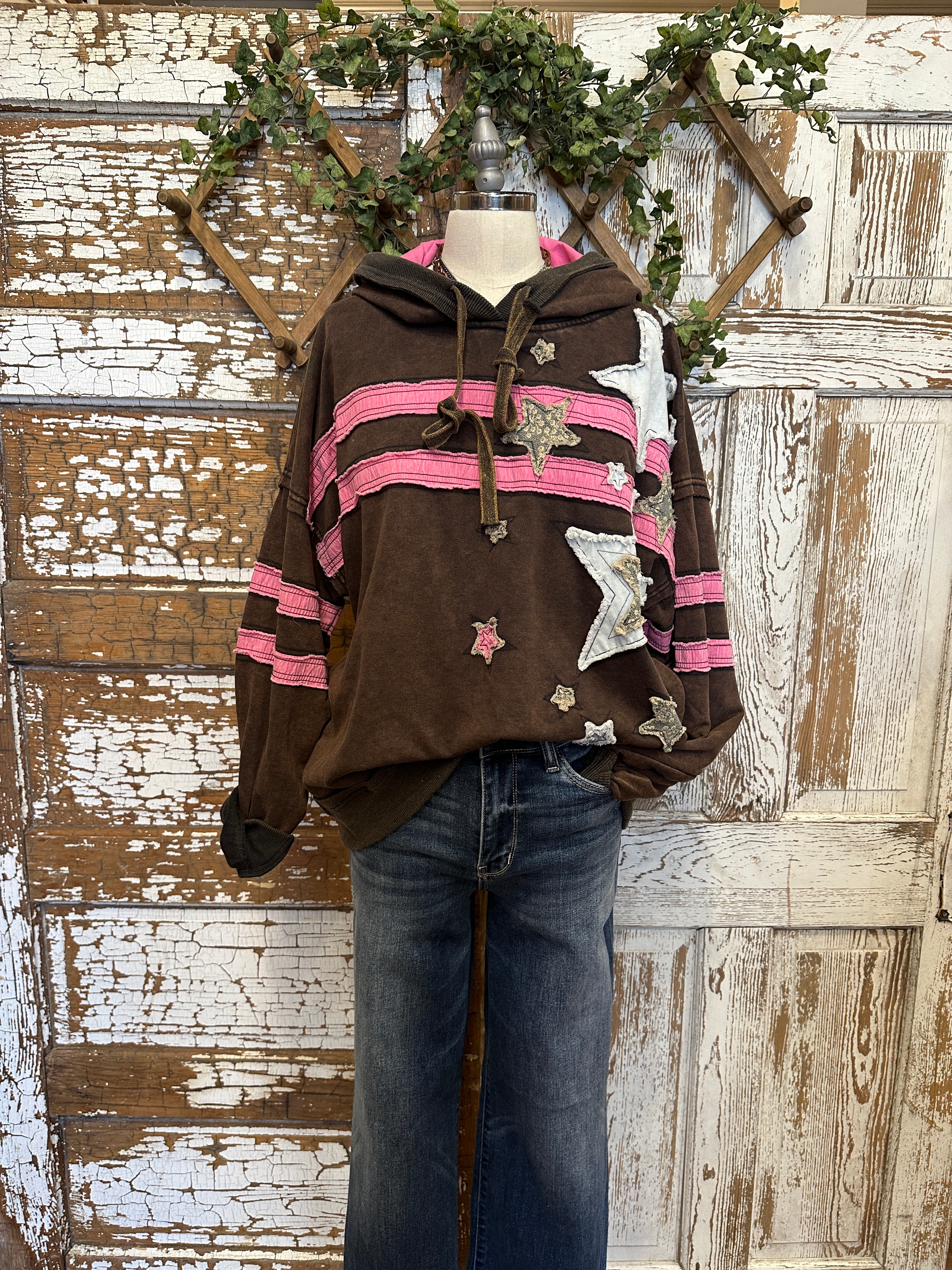 Chocolate Hoodie with Pink Stars & Stripes: Small - XL