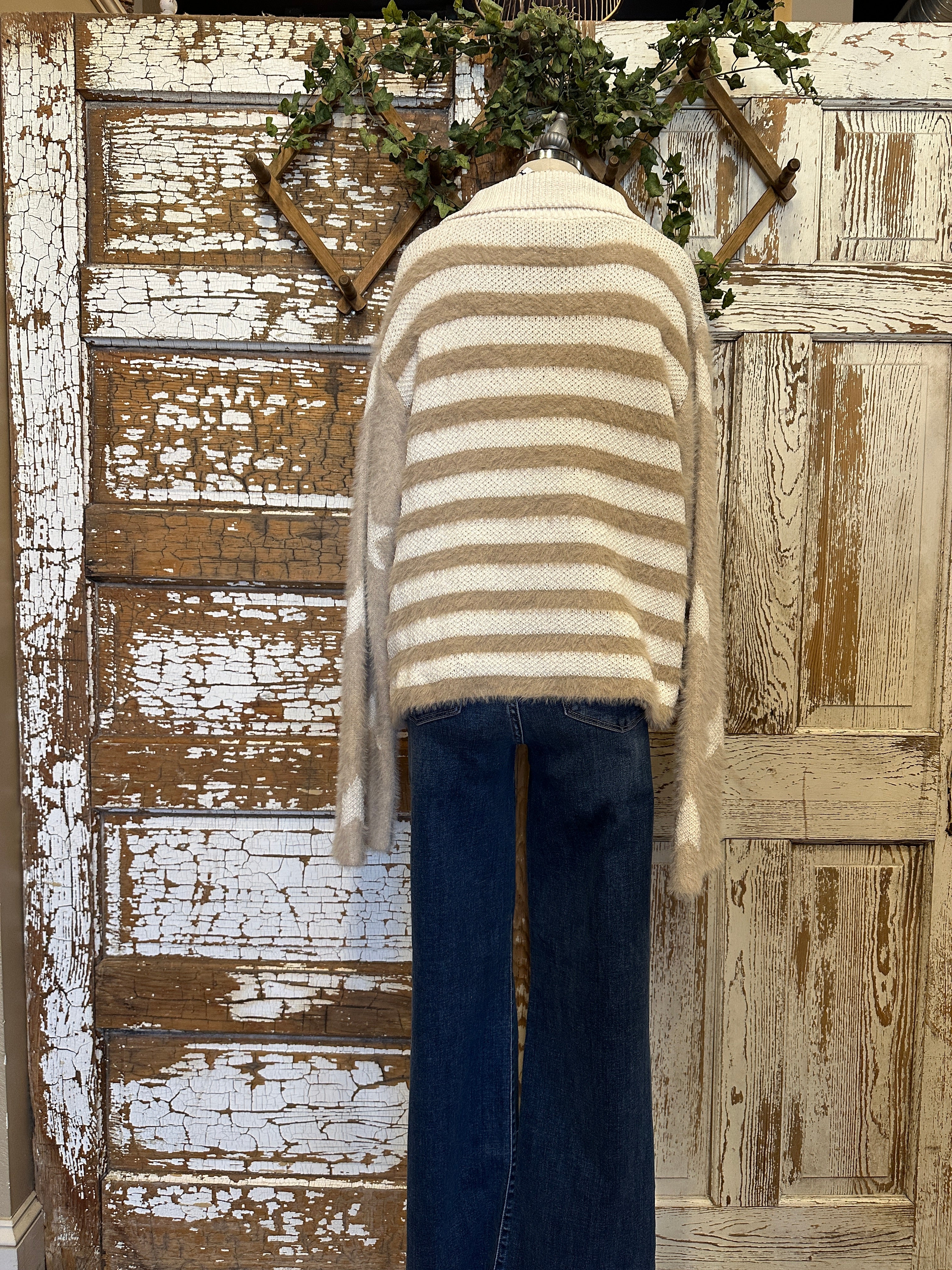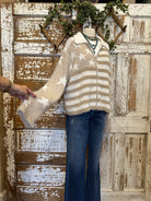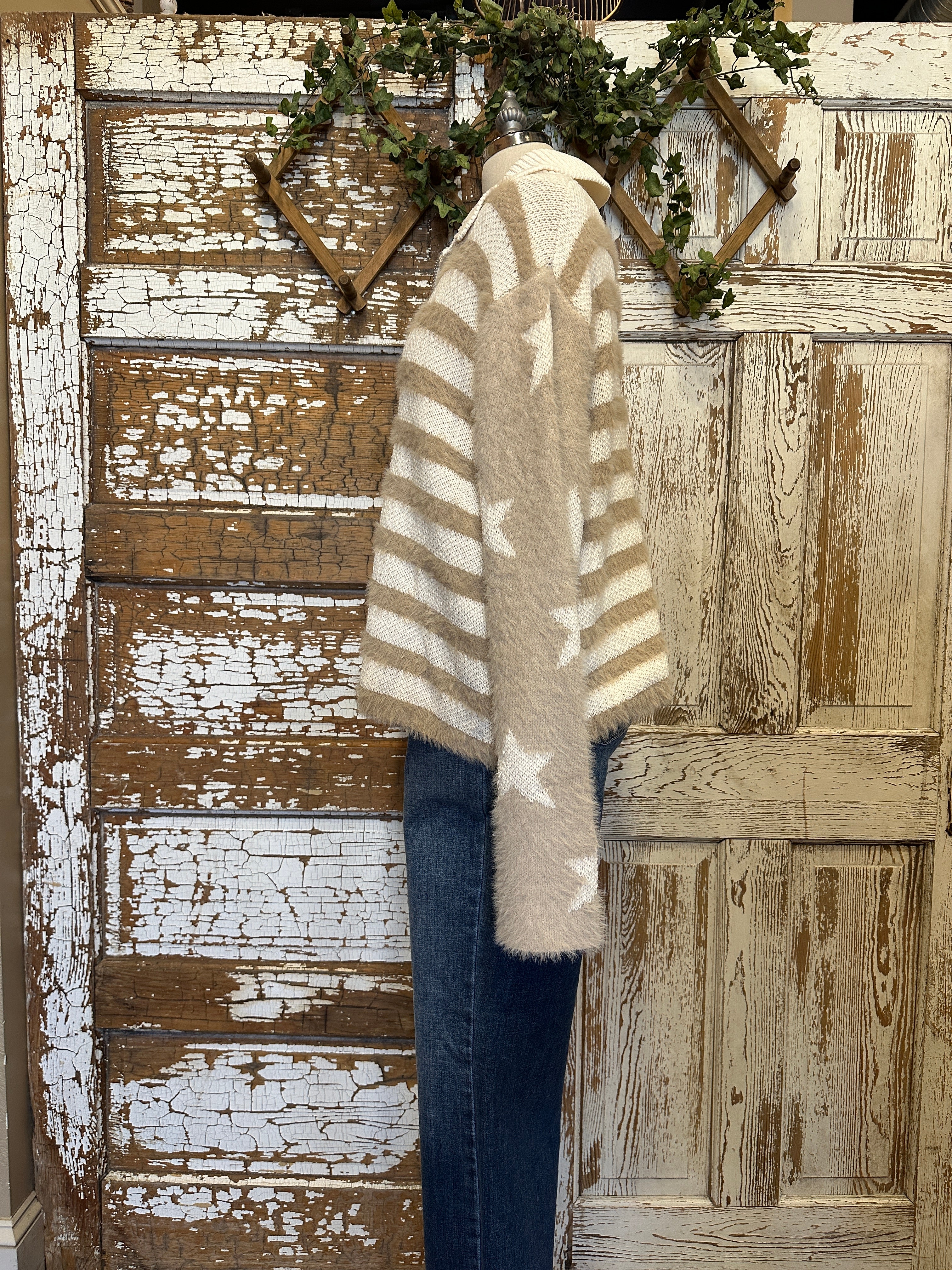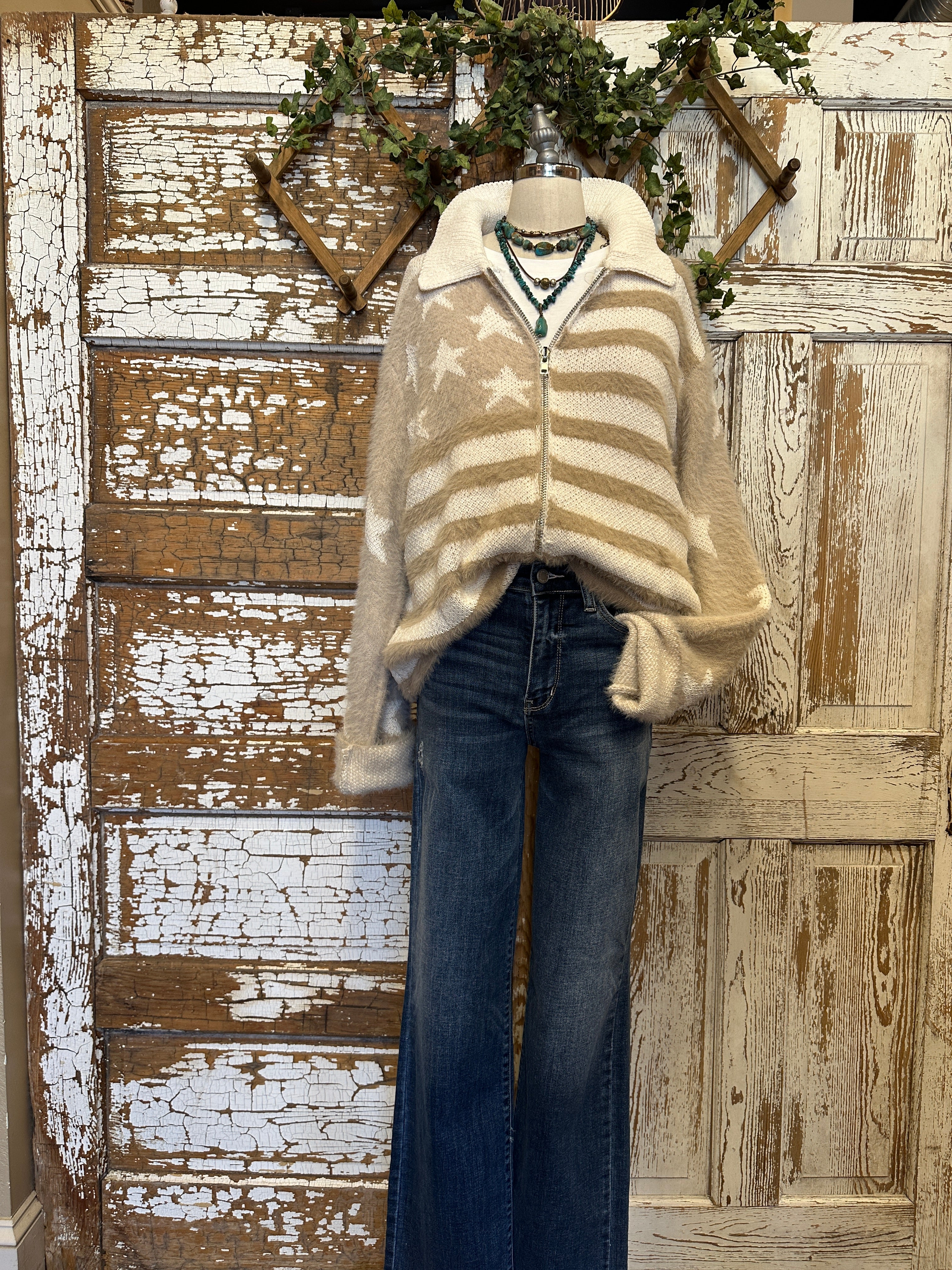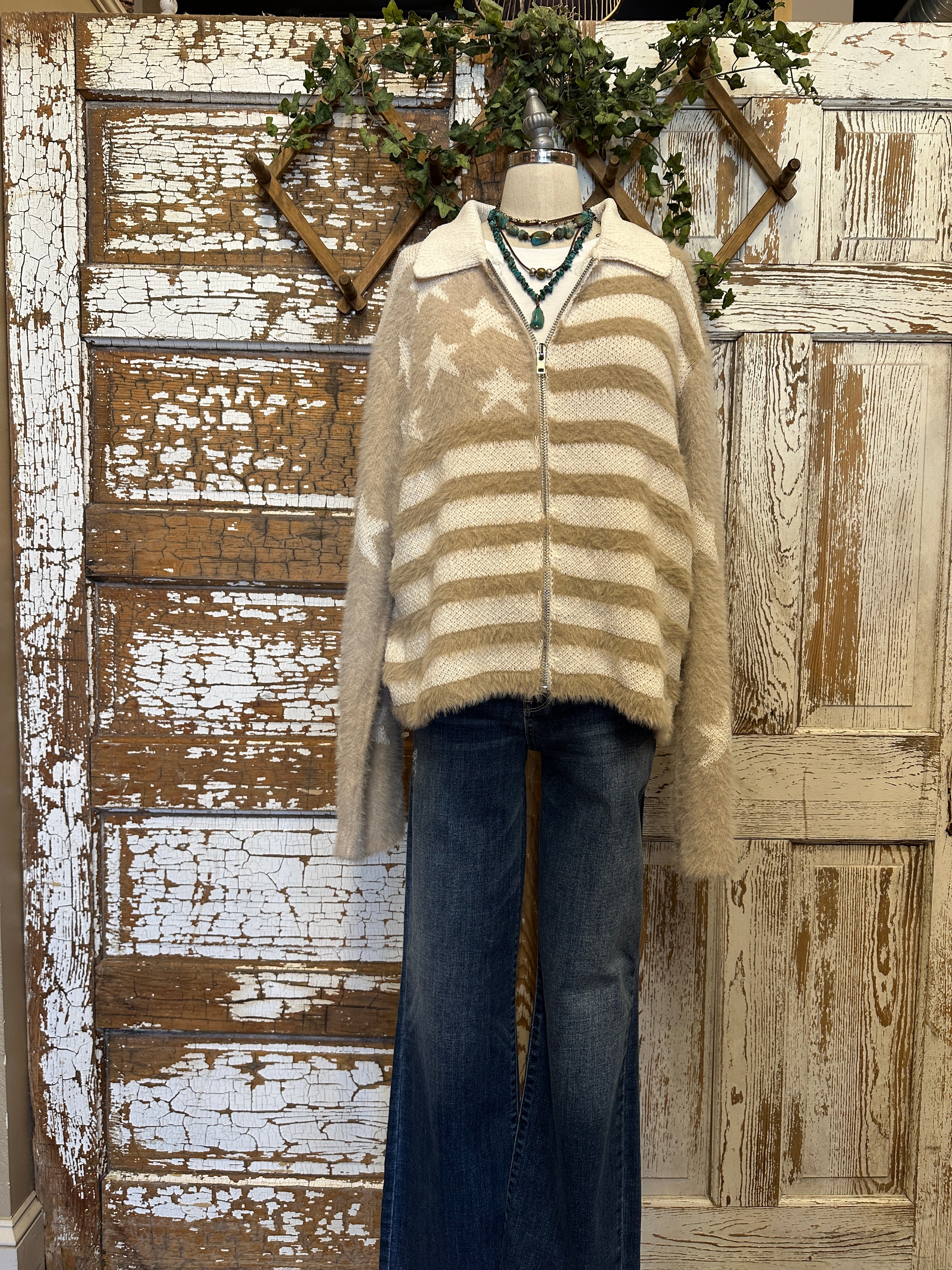 Cozy yet chic, this neutral stars & stripe zip sweater is perfect for layering. Its soft eyelash texture and relaxed silhouette make it a boutique favorite, especially when paired Lu's handmade necklaces for an effortlessly polished finish.