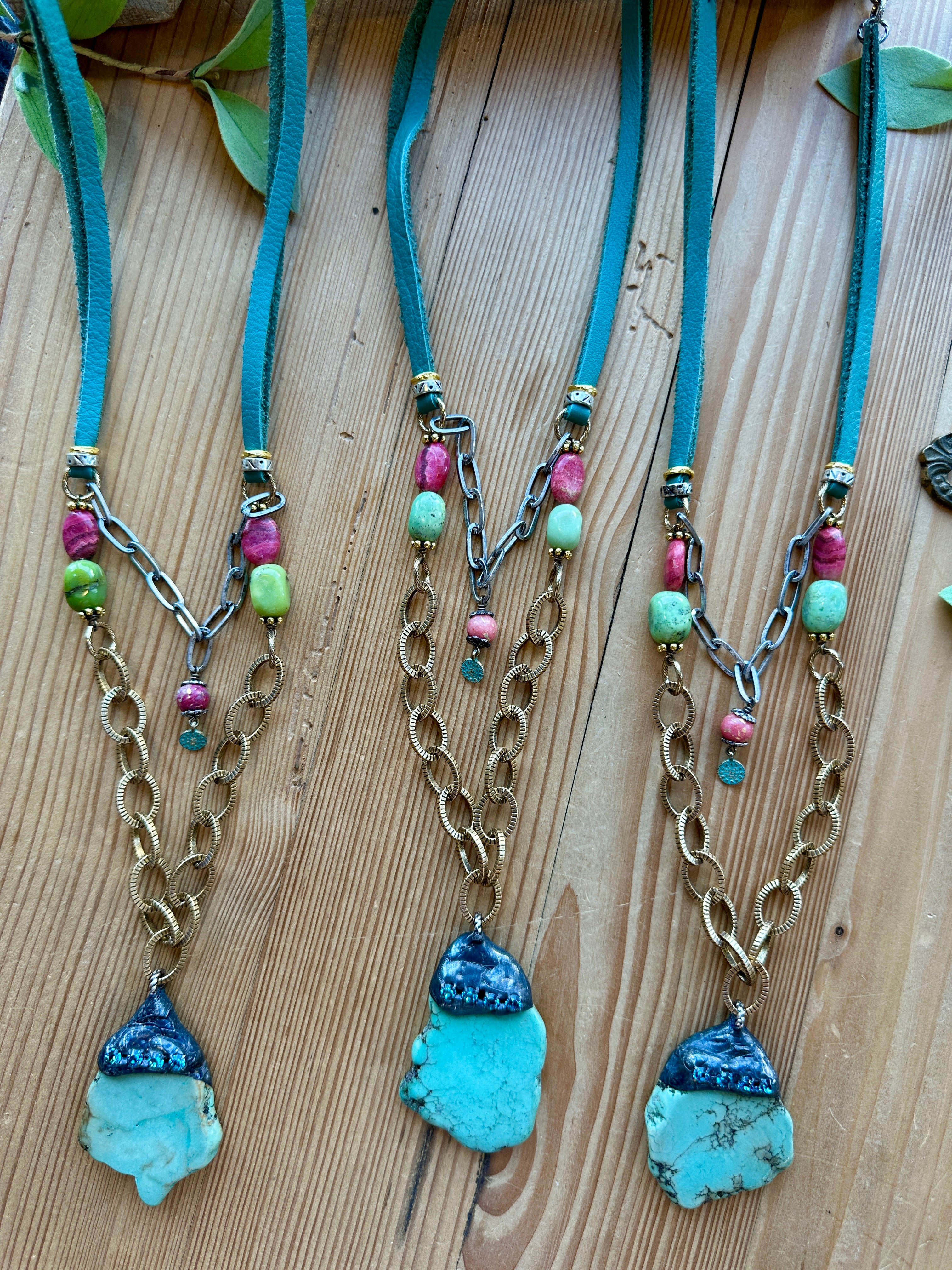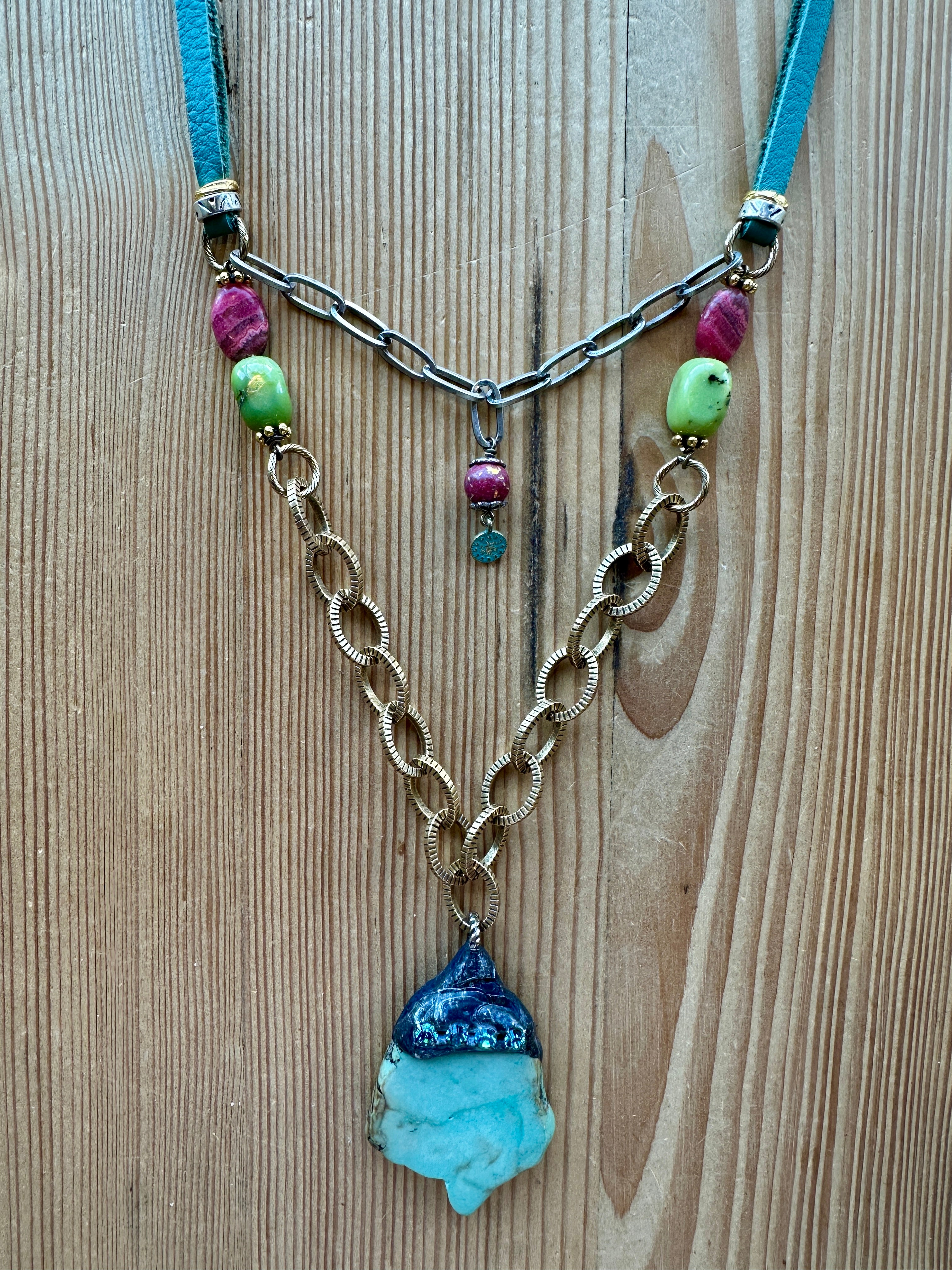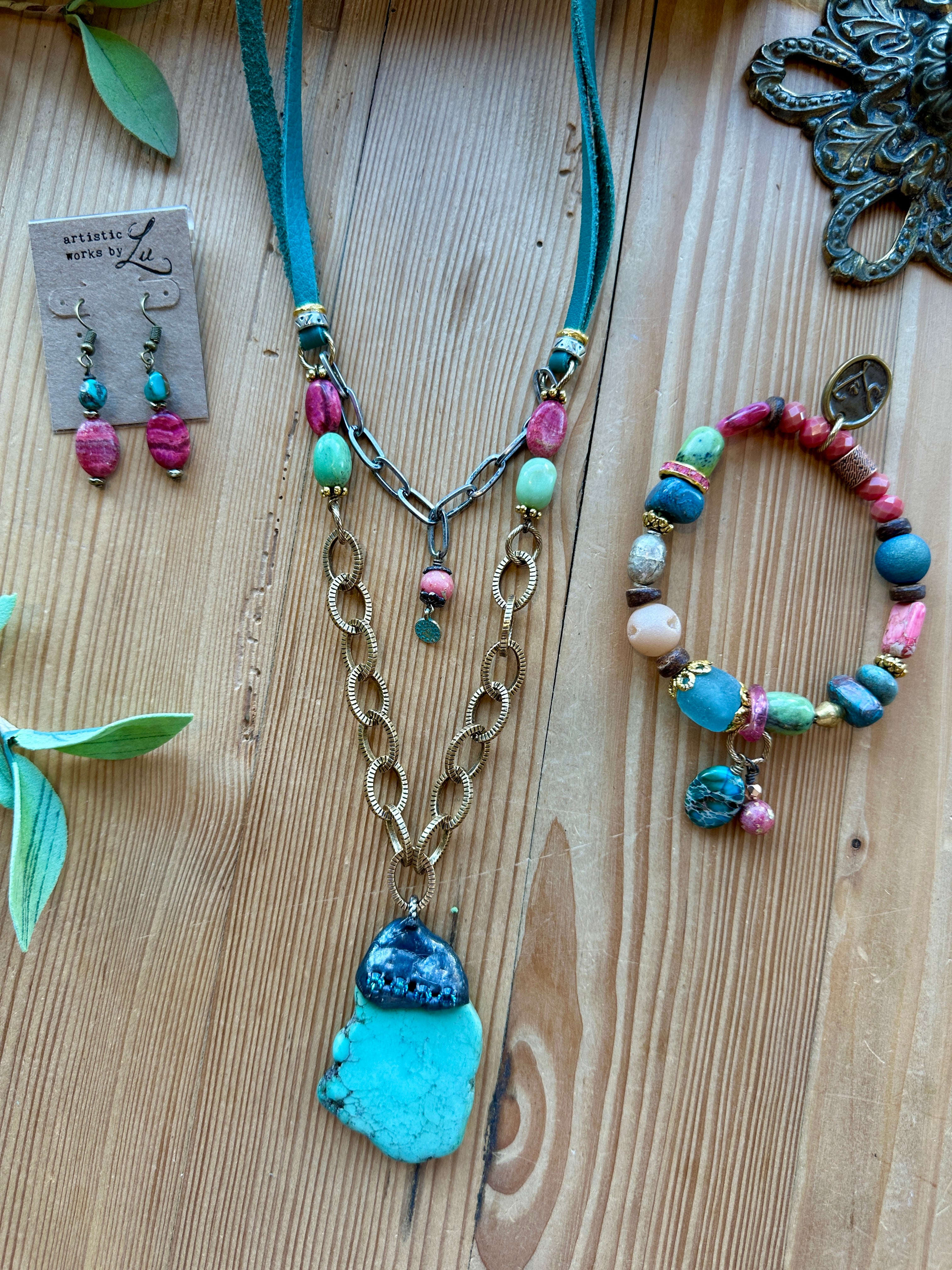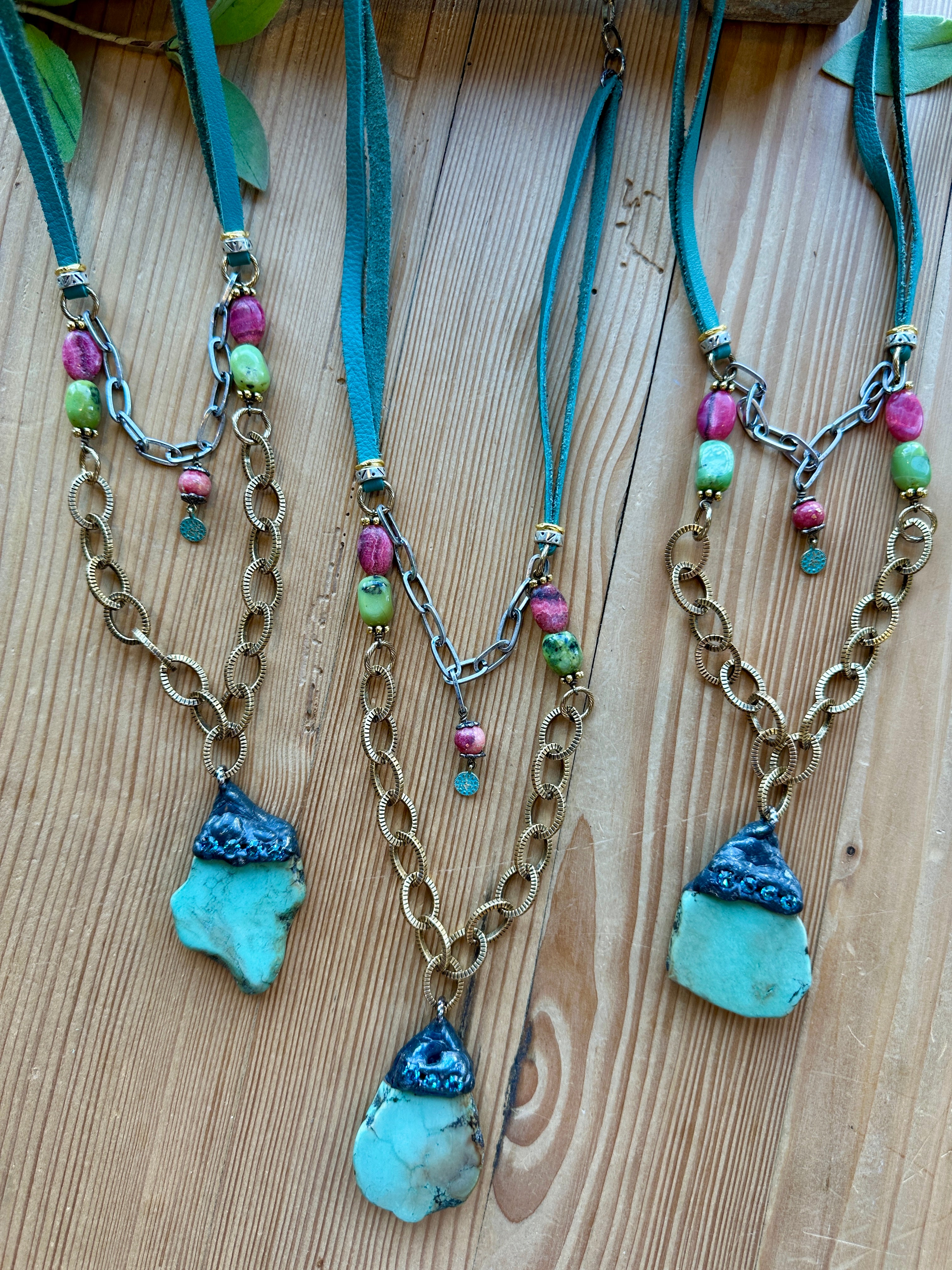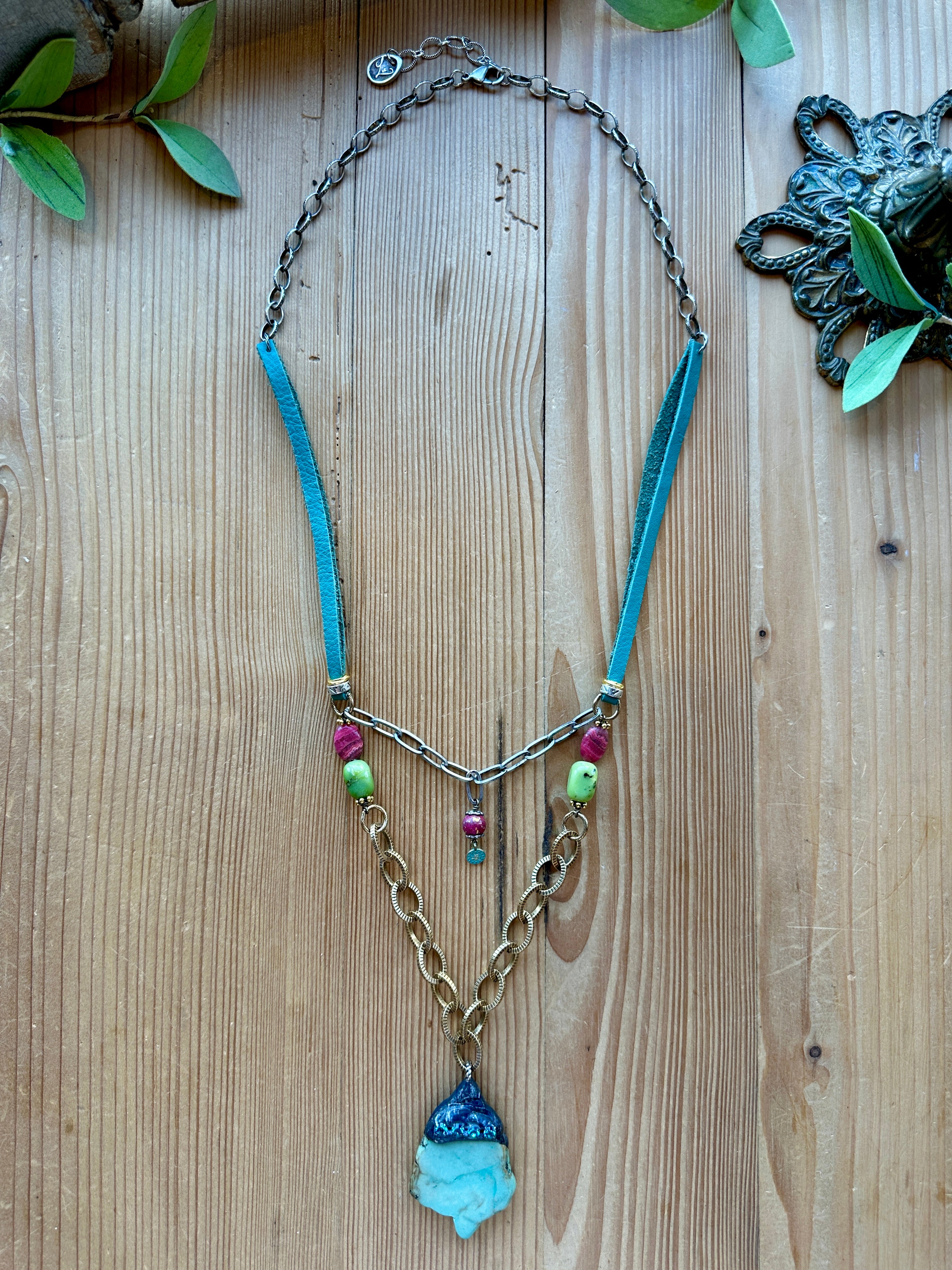 Elevate your outfit with our Earthy Brights Long Soldered Pendant Necklace. Handmade with a dyed magnesite pendant, sparkling turquoise cup chain, and speckled jade and pink agate beads, this necklace exudes natural elegance. The intricate design is finished with a mix of gold and silver chains and a touch of turquoise dyed leather.