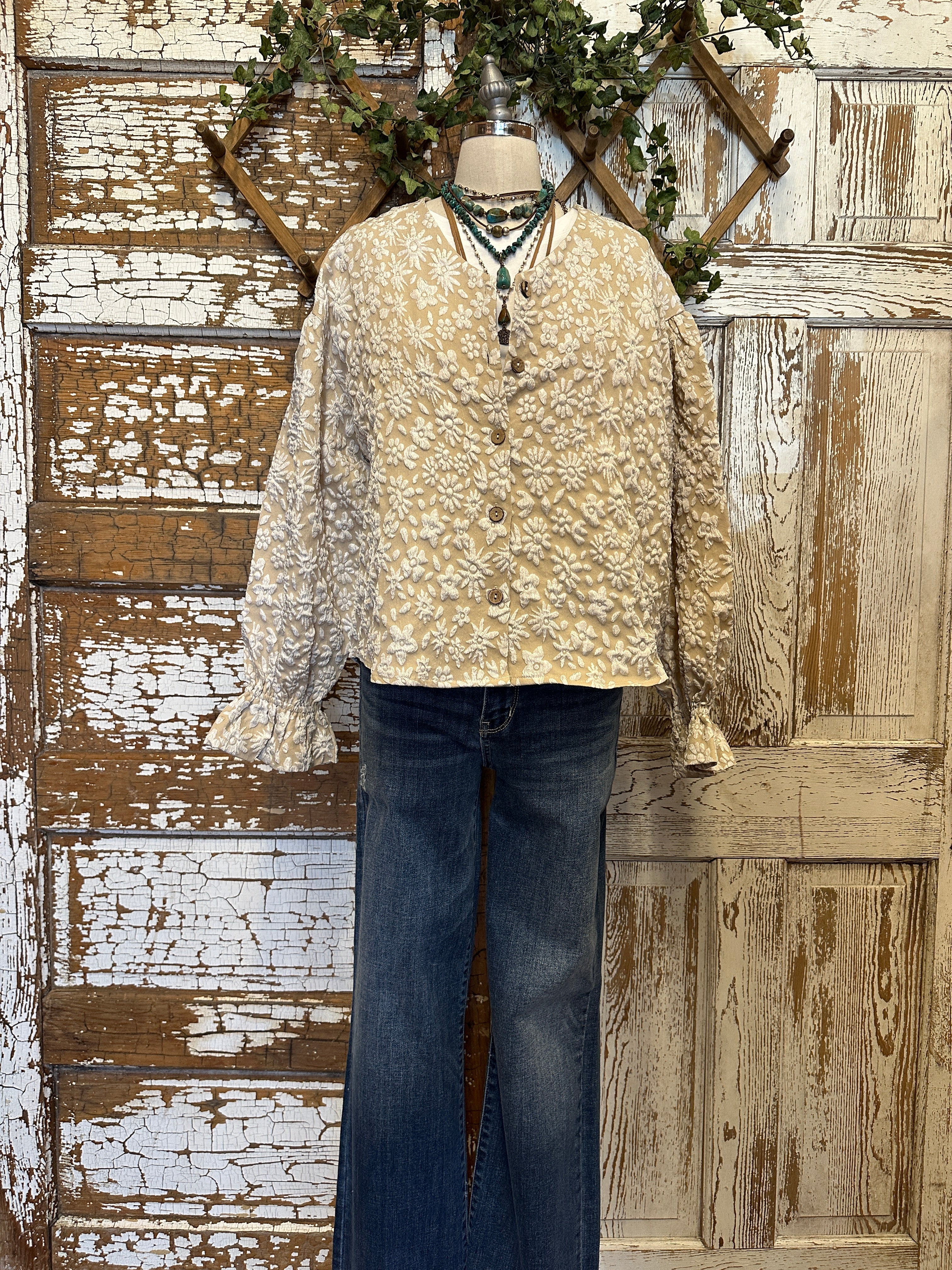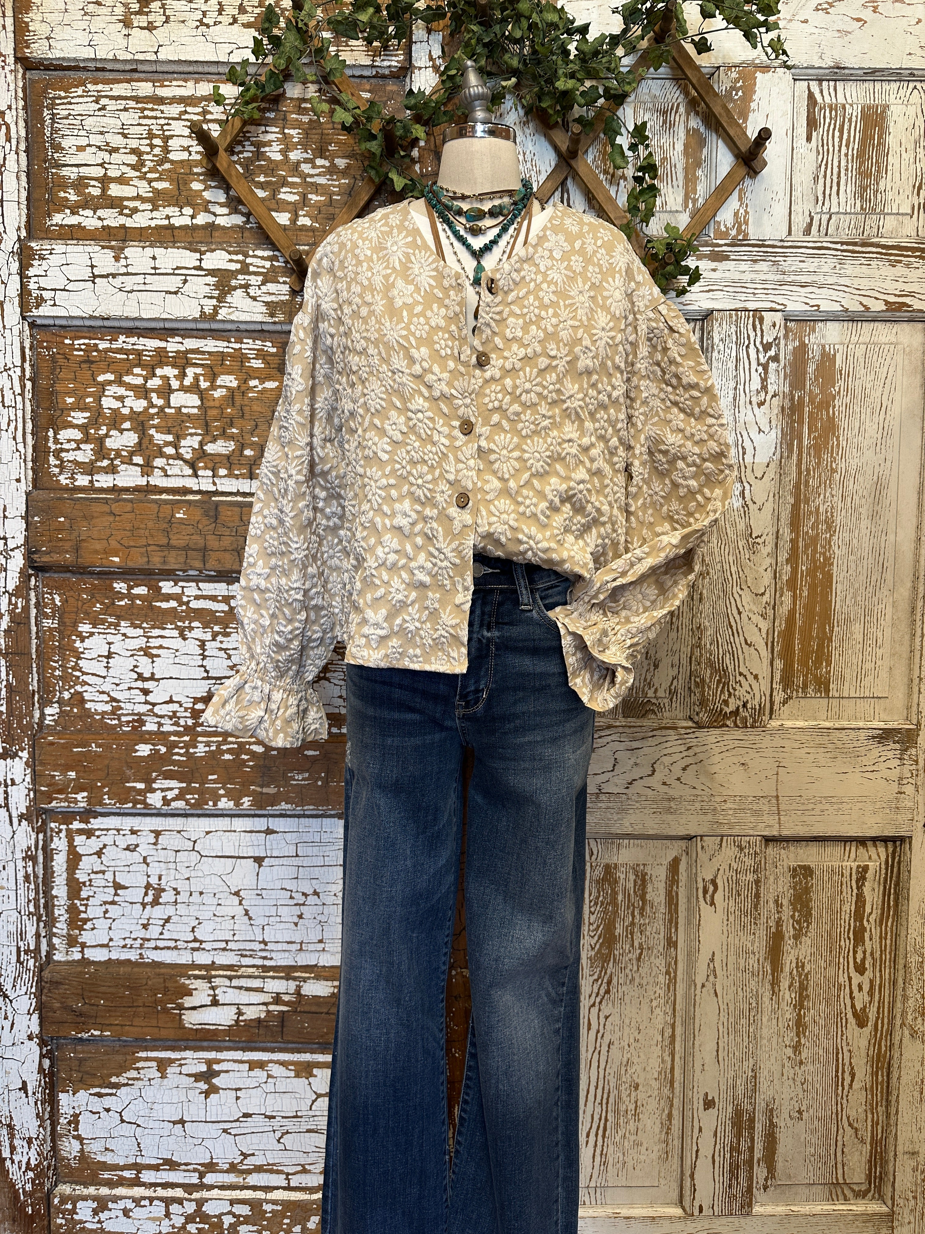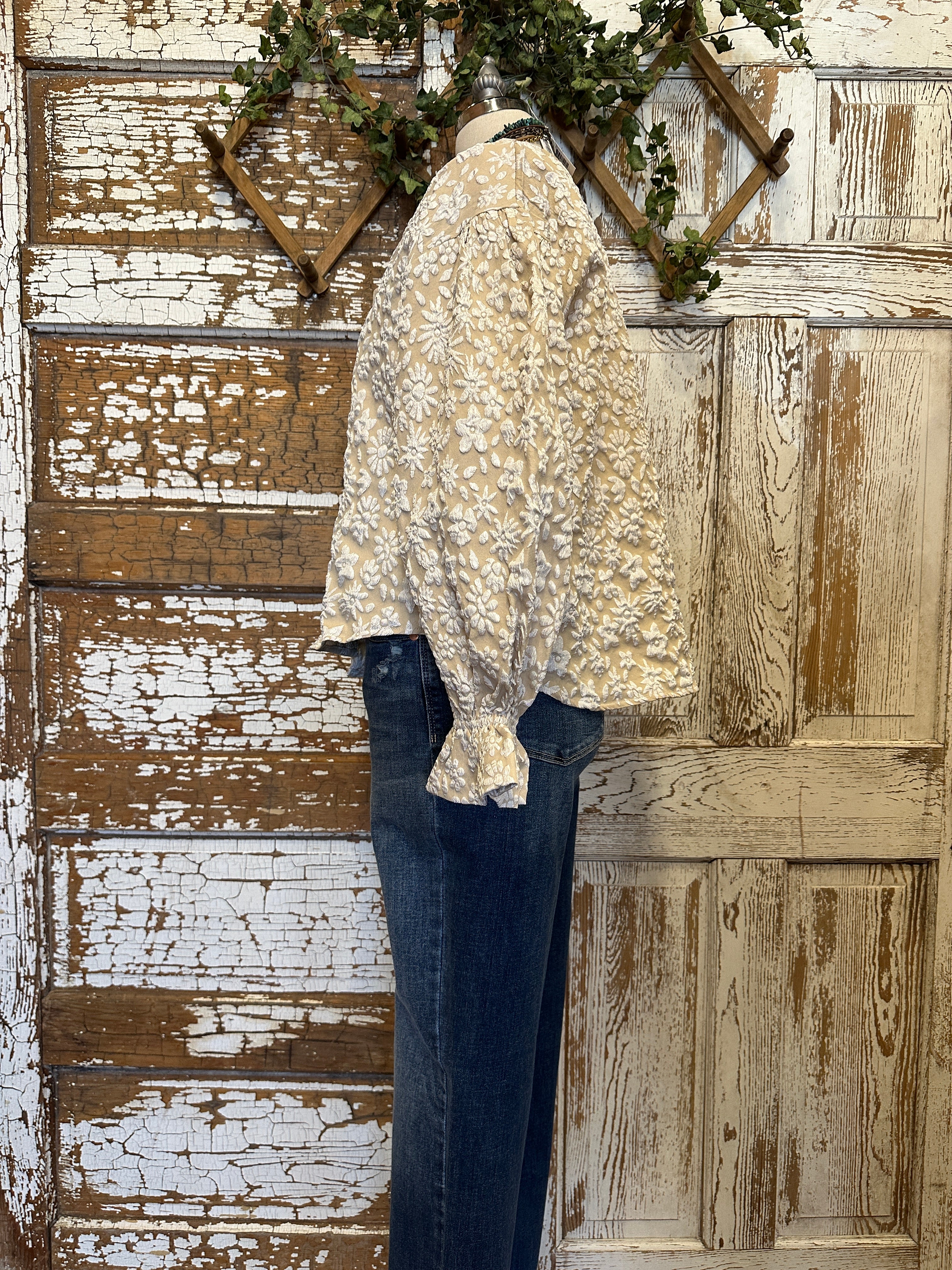 Romantic and feminine, this ivory floral textured button-up top features soft floral-inspired detailing and a relaxed fit with a slight ruffle shoulder, elastic wrist ...bold handmade jewelry, it’s an artistic boutique look that’s both timeless and trendy.