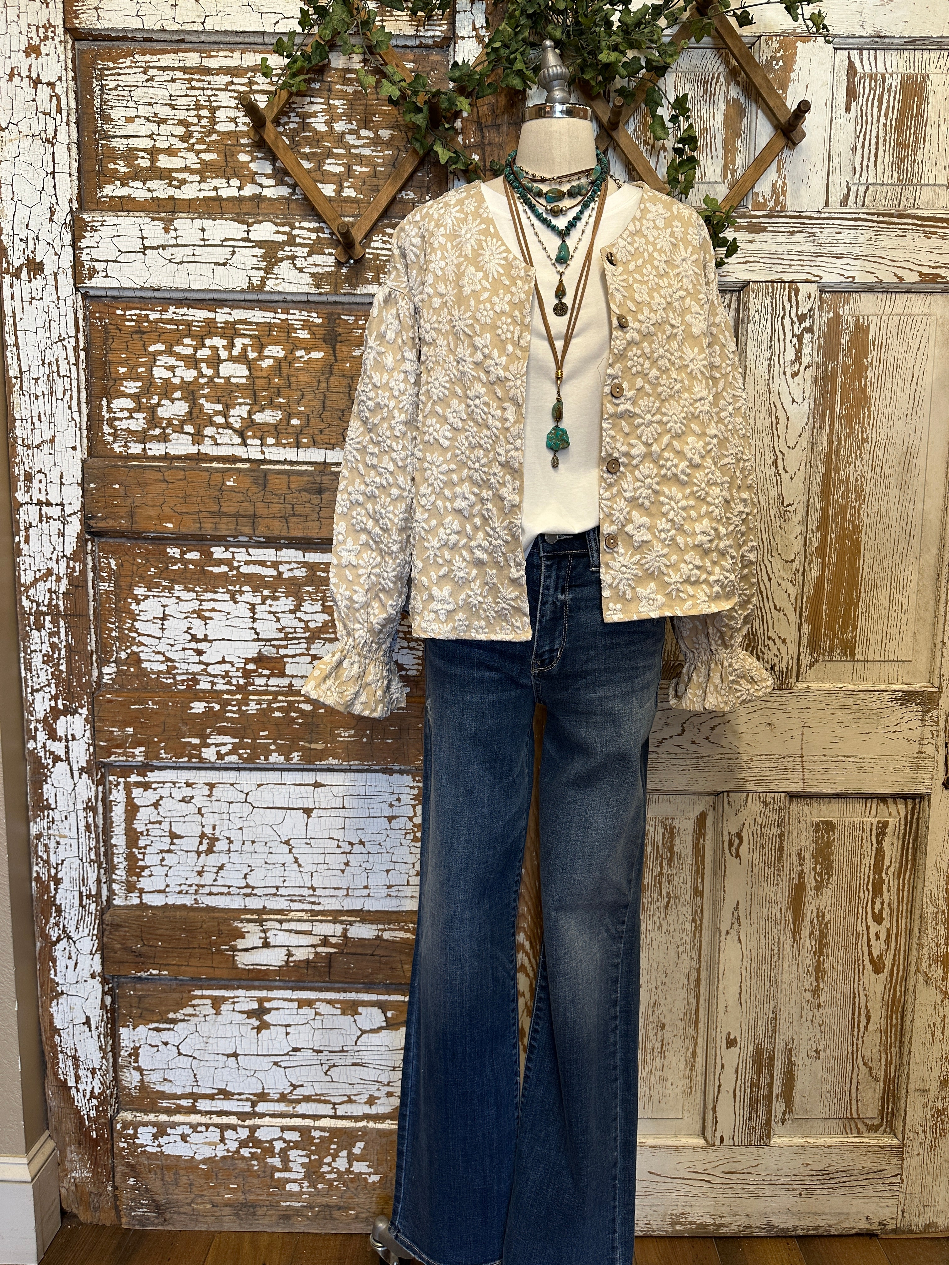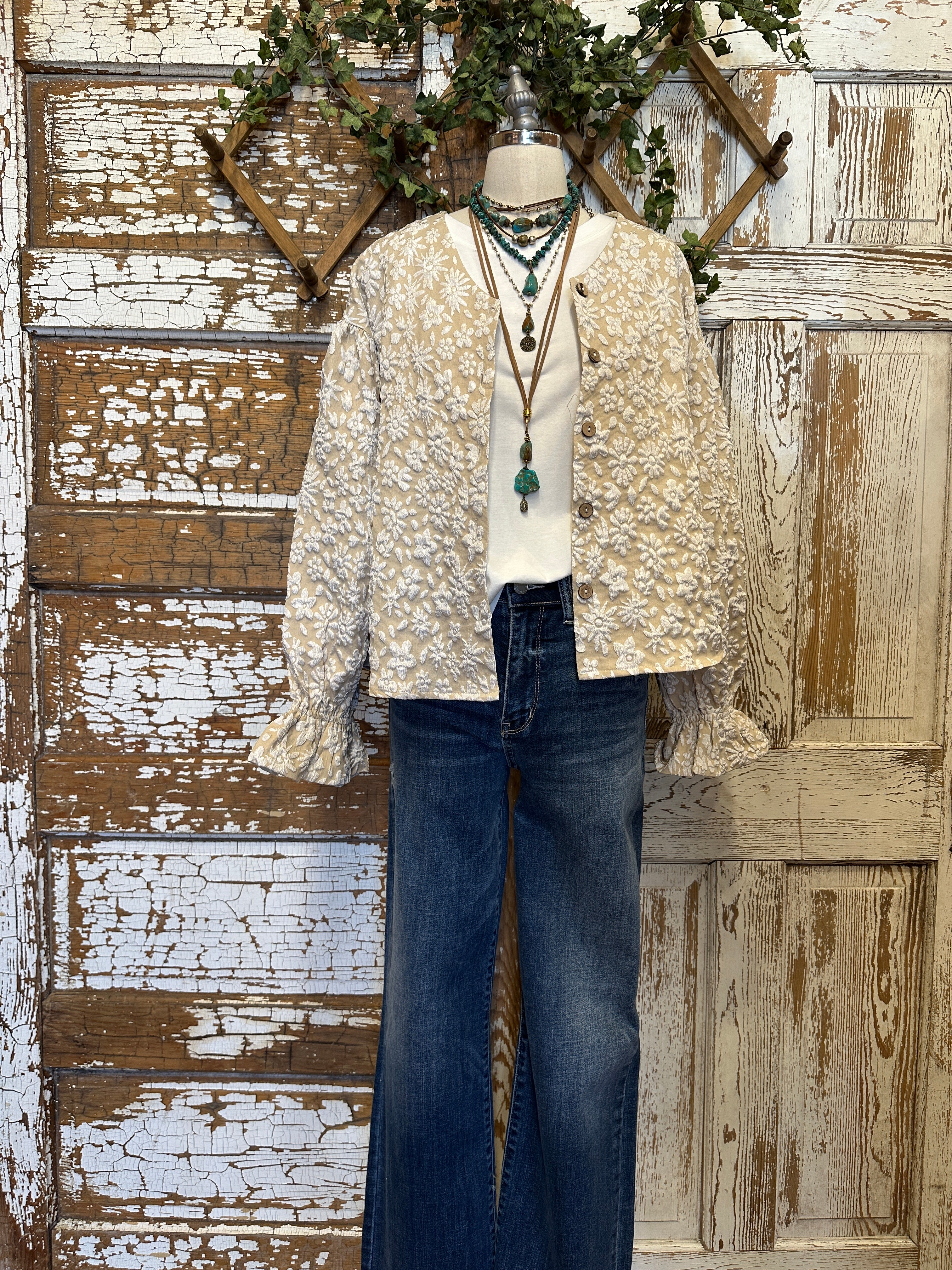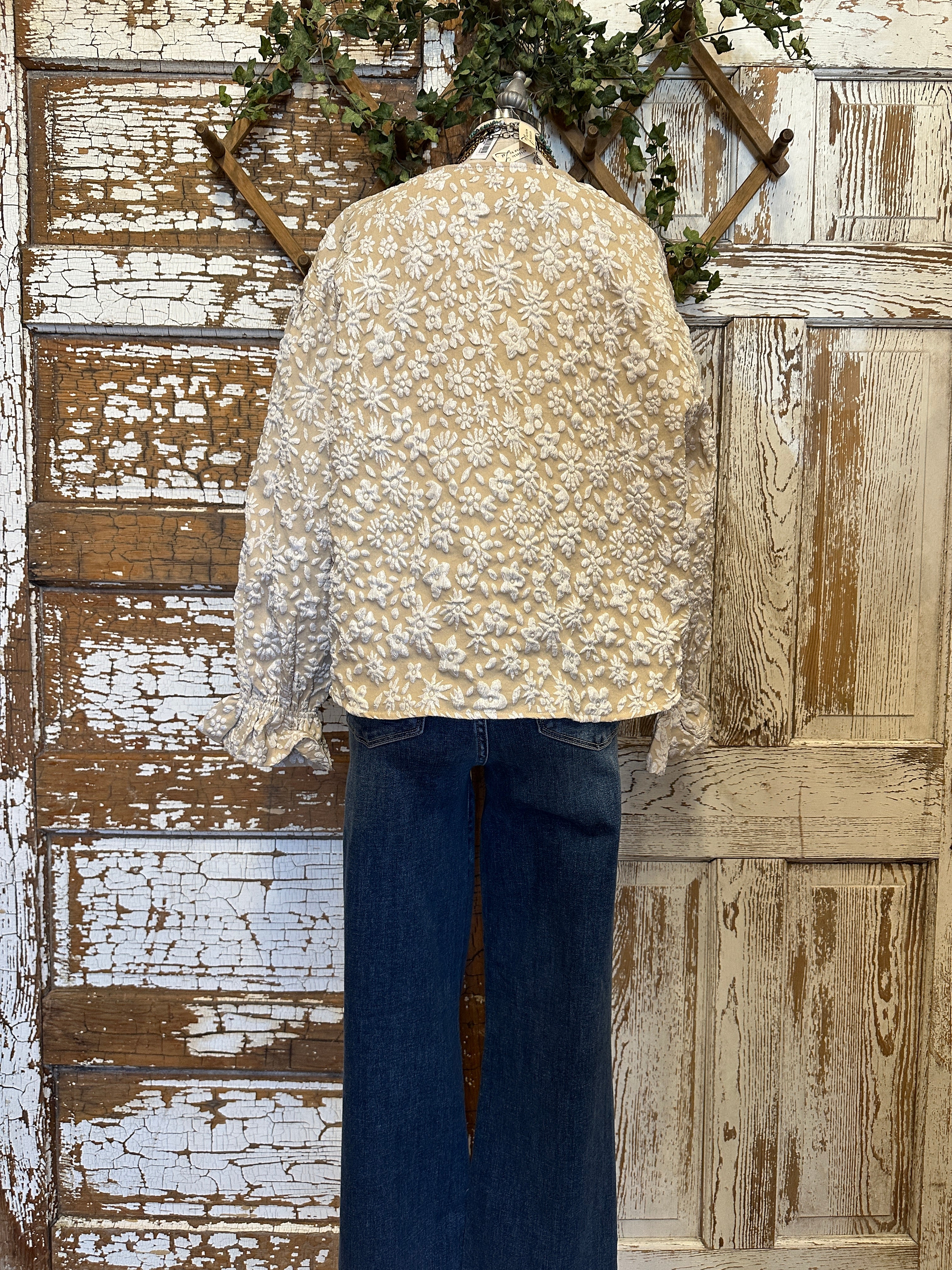 Romantic and feminine, this ivory floral textured button-up top features soft floral-inspired detailing and a relaxed fit with a slight ruffle shoulder, elastic wrist ...bold handmade jewelry, it’s an artistic boutique look that’s both timeless and trendy.