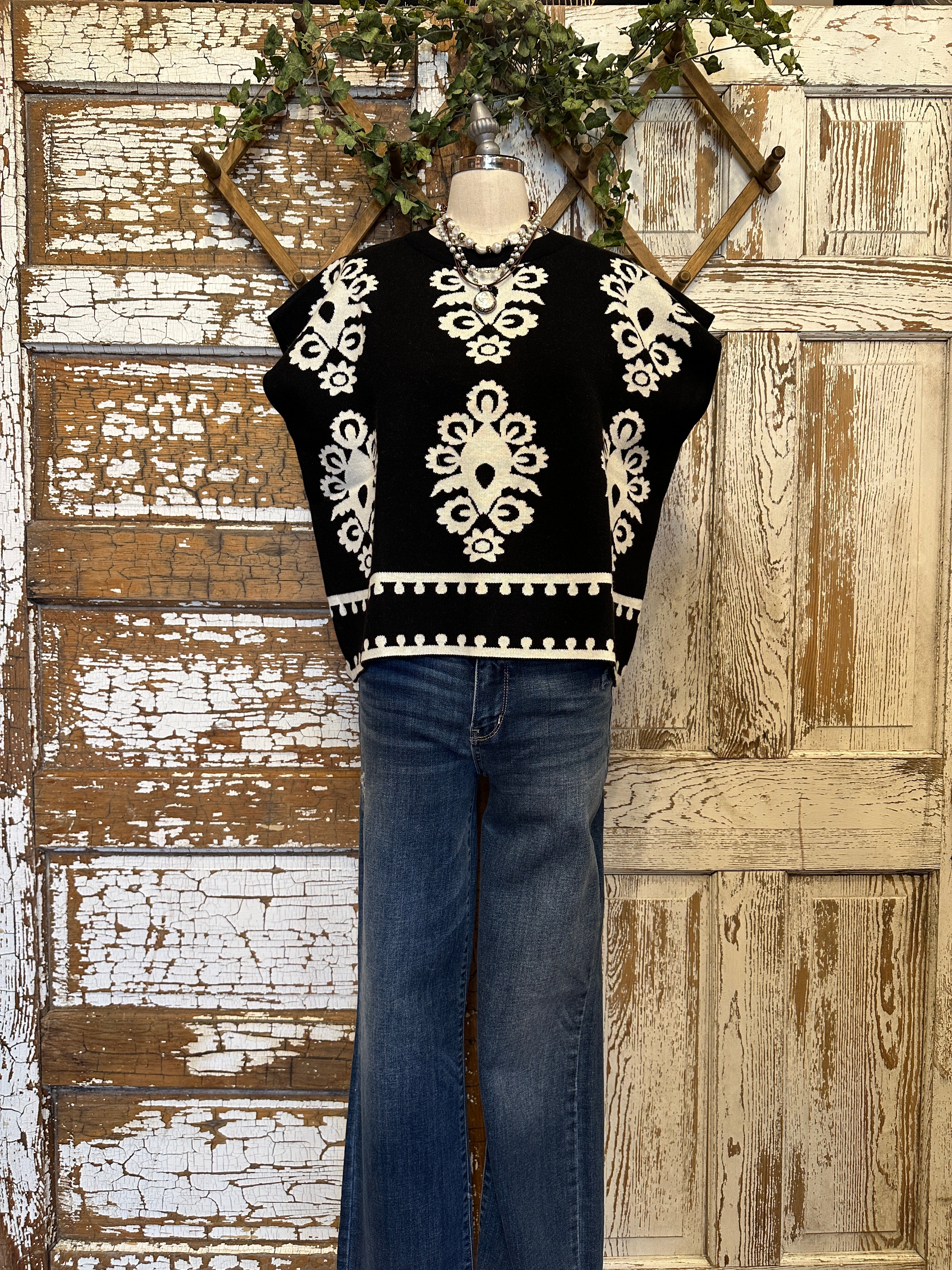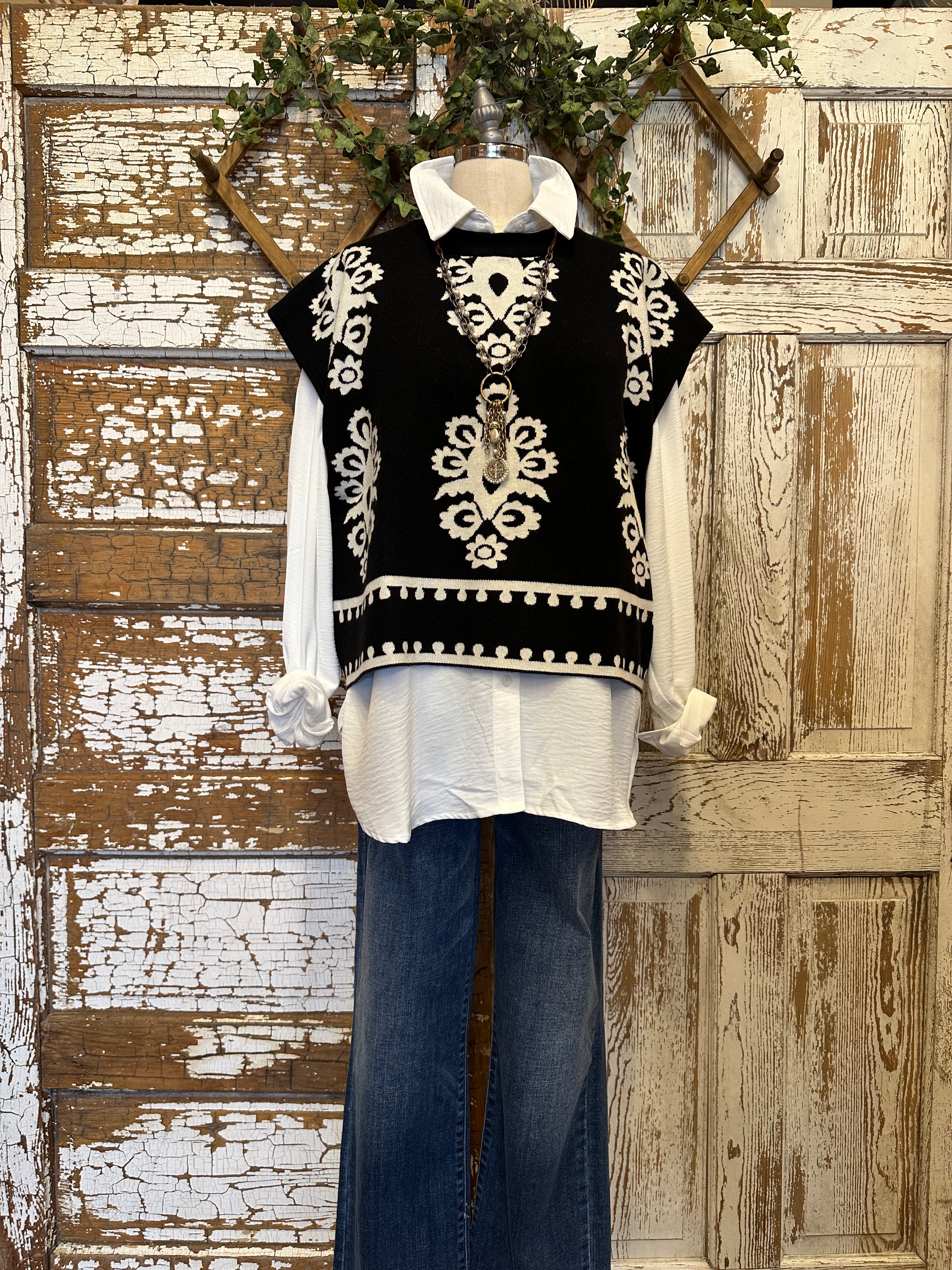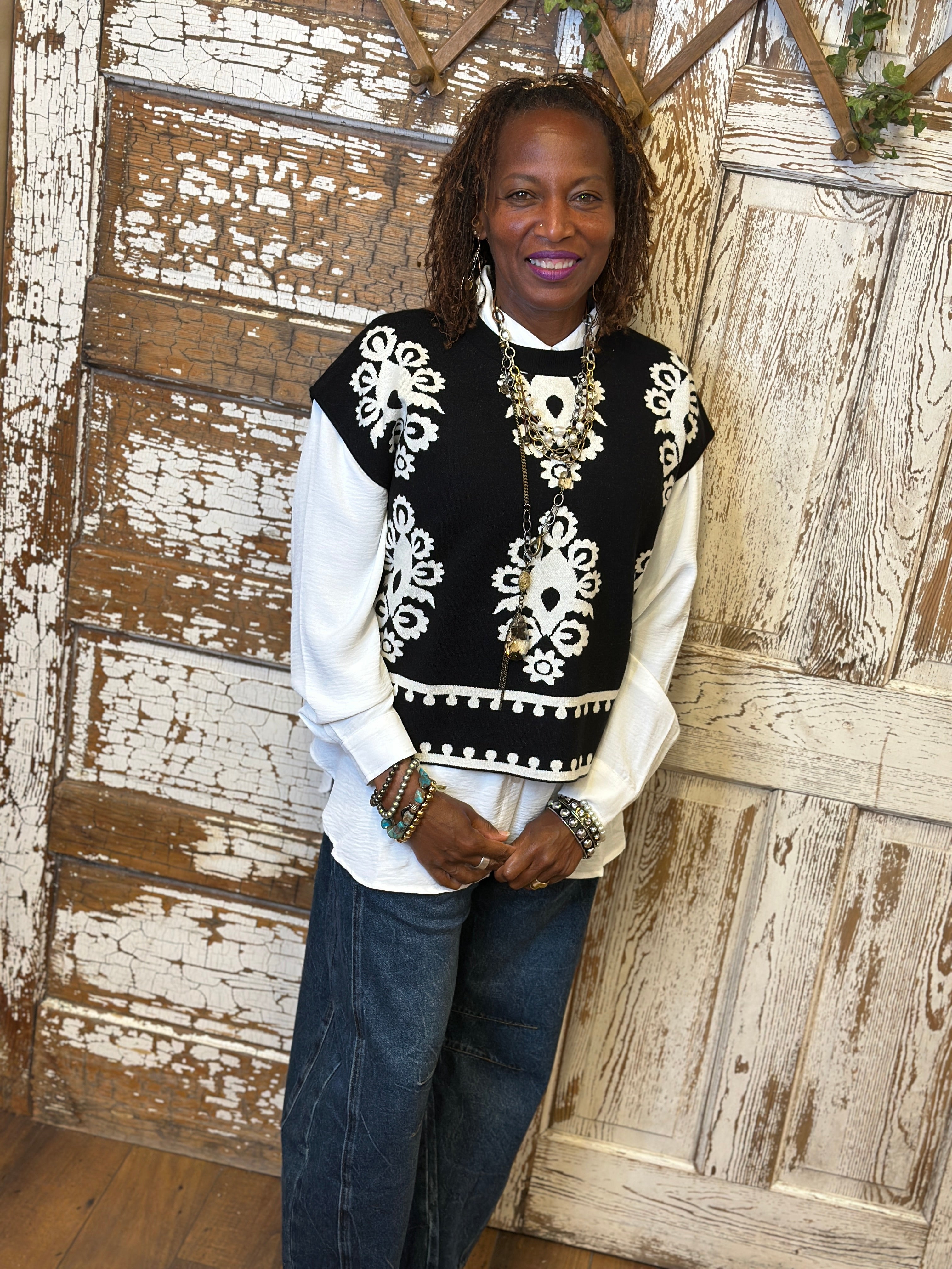 Make a bold statement with this JoAnn black and ivory boho knit sweater vest featuring intricate artistic patterns and a chic, relaxed silhouette. Designed to stand out, this boutique piece pairs beautifully with layered handmade artisan jewelry for an elevated, on-trend look.