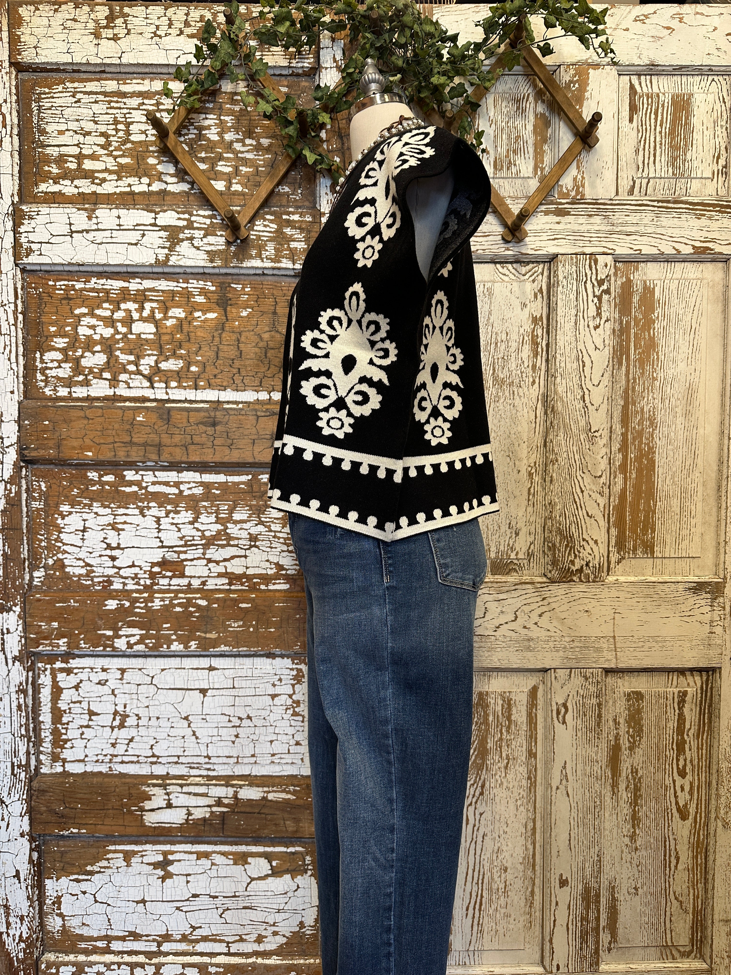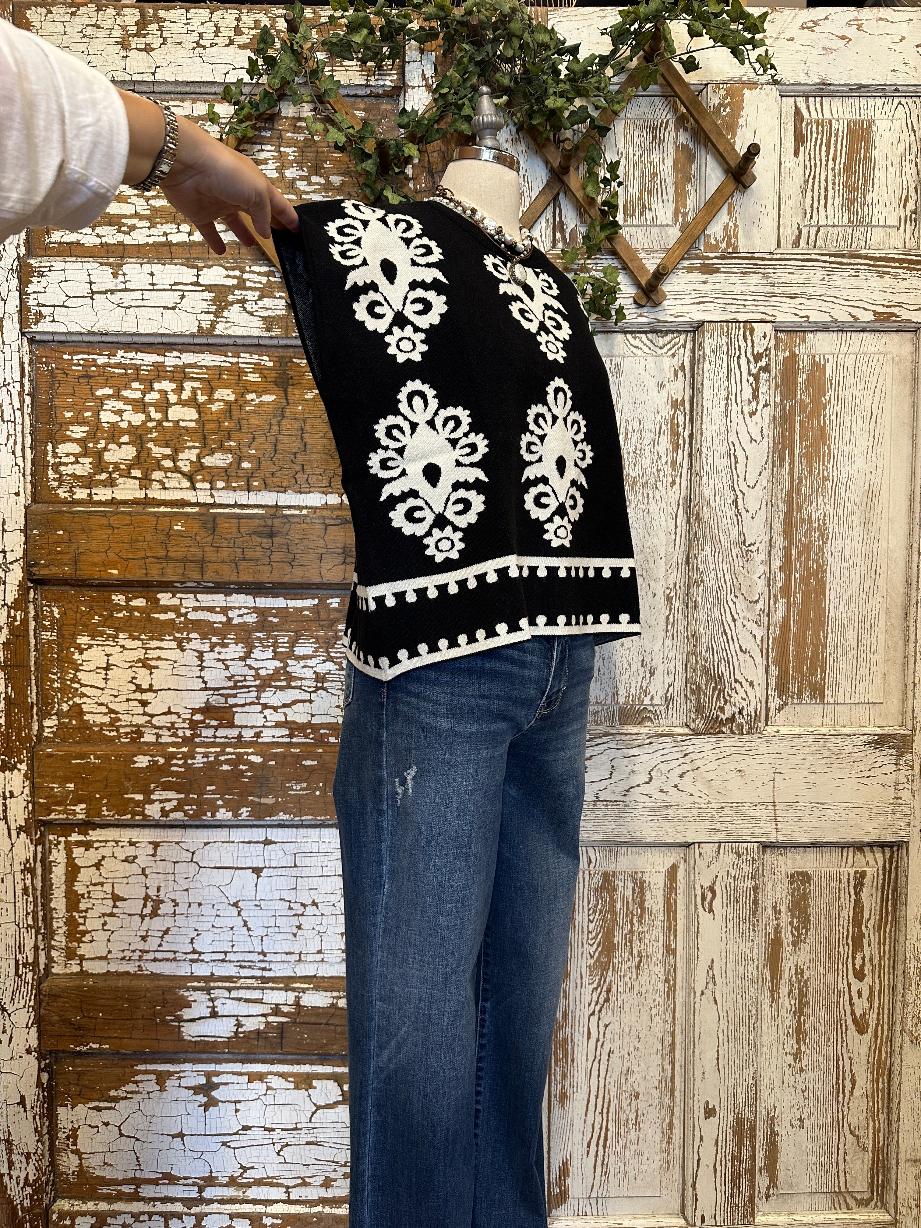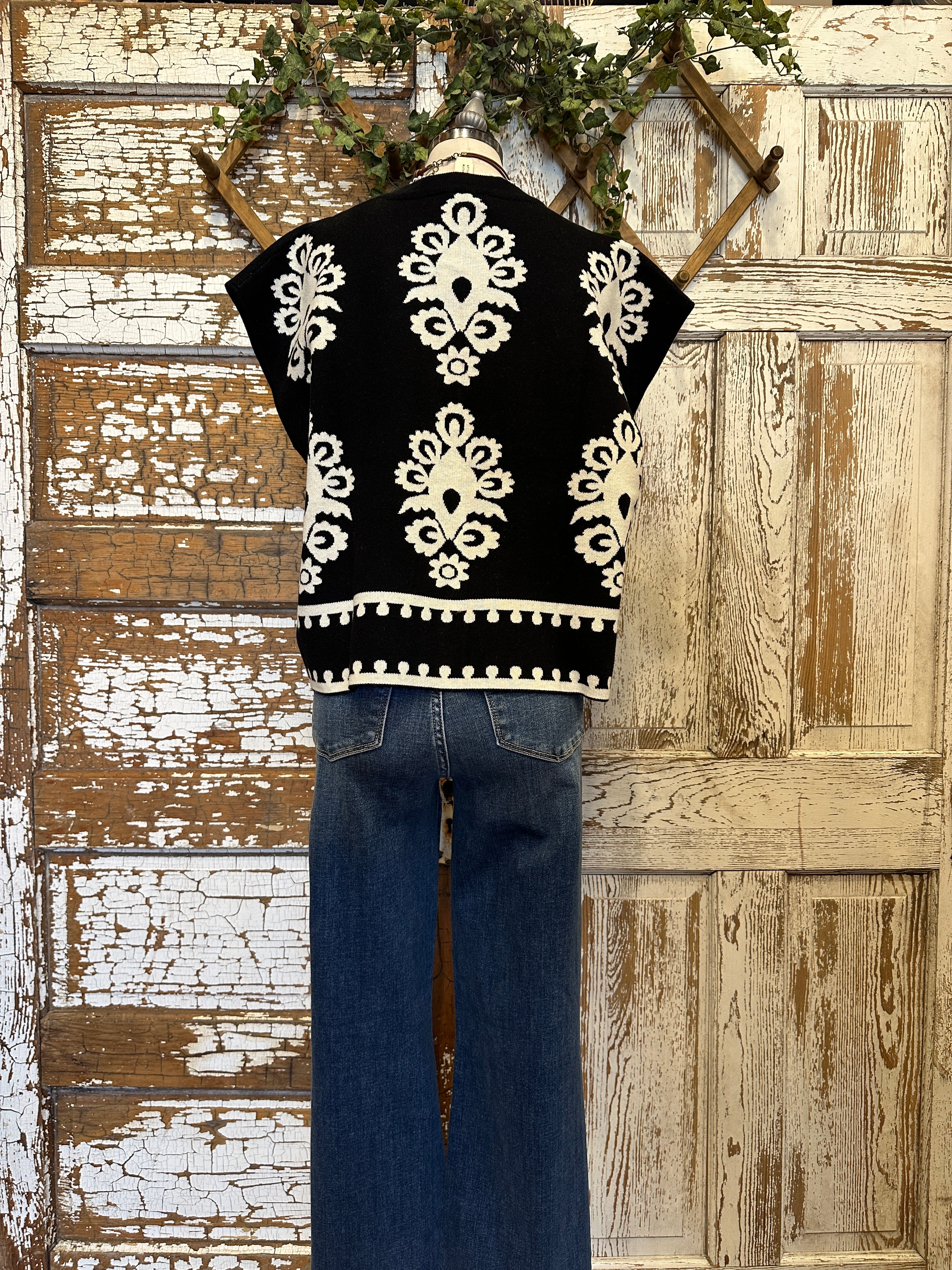 Make a bold statement with this JoAnn black and ivory boho knit sweater vest featuring intricate artistic patterns and a chic, relaxed silhouette. Designed to stand out, this boutique piece pairs beautifully with layered handmade artisan jewelry for an elevated, on-trend look.
