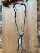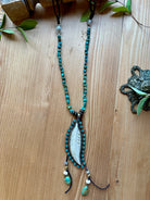 The Lu Couture Turquoise and Bone Feather Necklace captures the essence of boho elegance with genuine turquoise beads paired beautifully with rich chocolate brown leather. Its striking bone feather centerpiece, set in Tibetan silver and encircled by turquoise beads, draws the eye with artisan detail. Playful dangles of turquoise, ivory-colored, and mixed metal beads add movement and character, making this necklace a captivating statement piece that effortlessly enhances your free-spirited style.