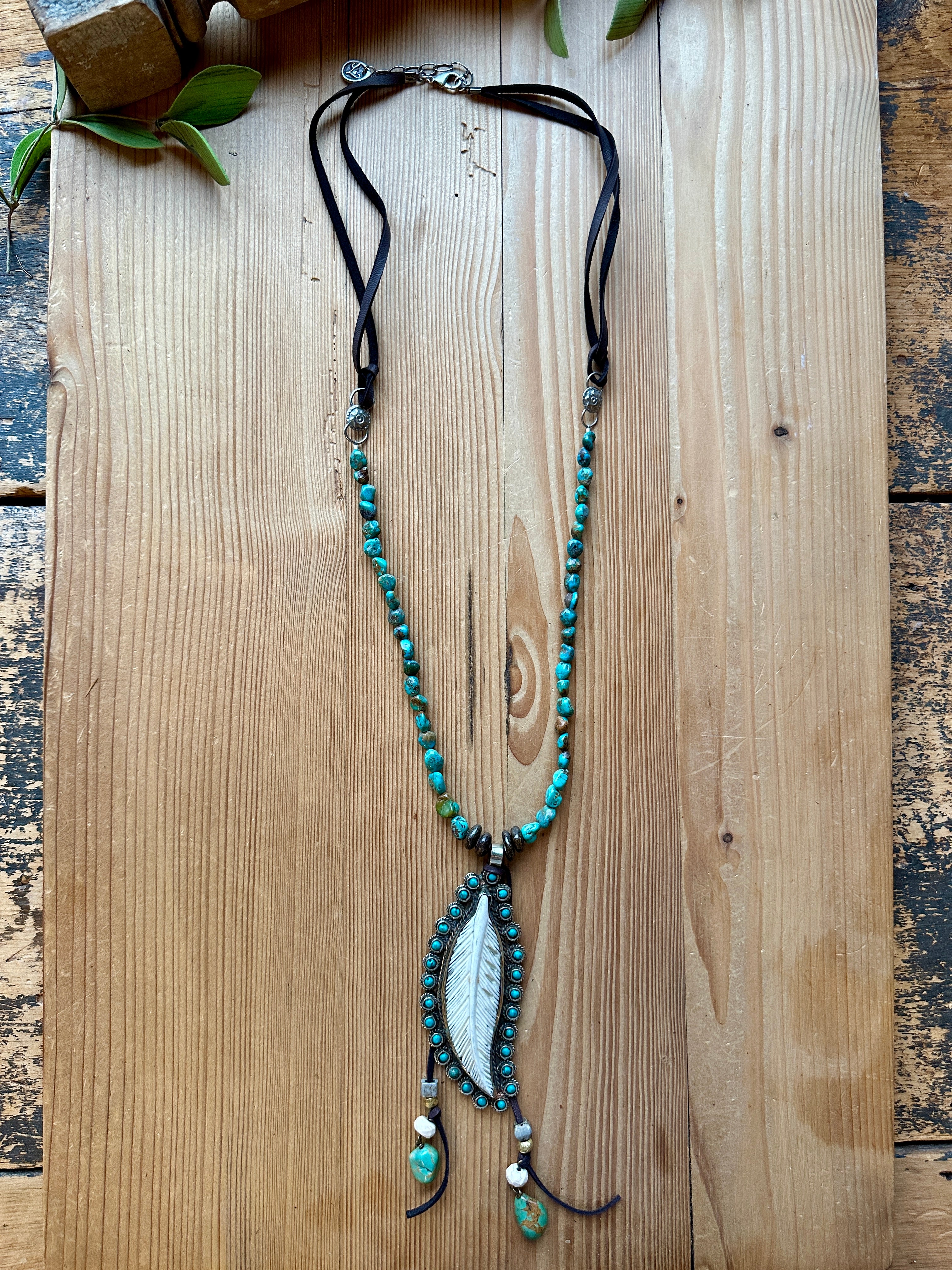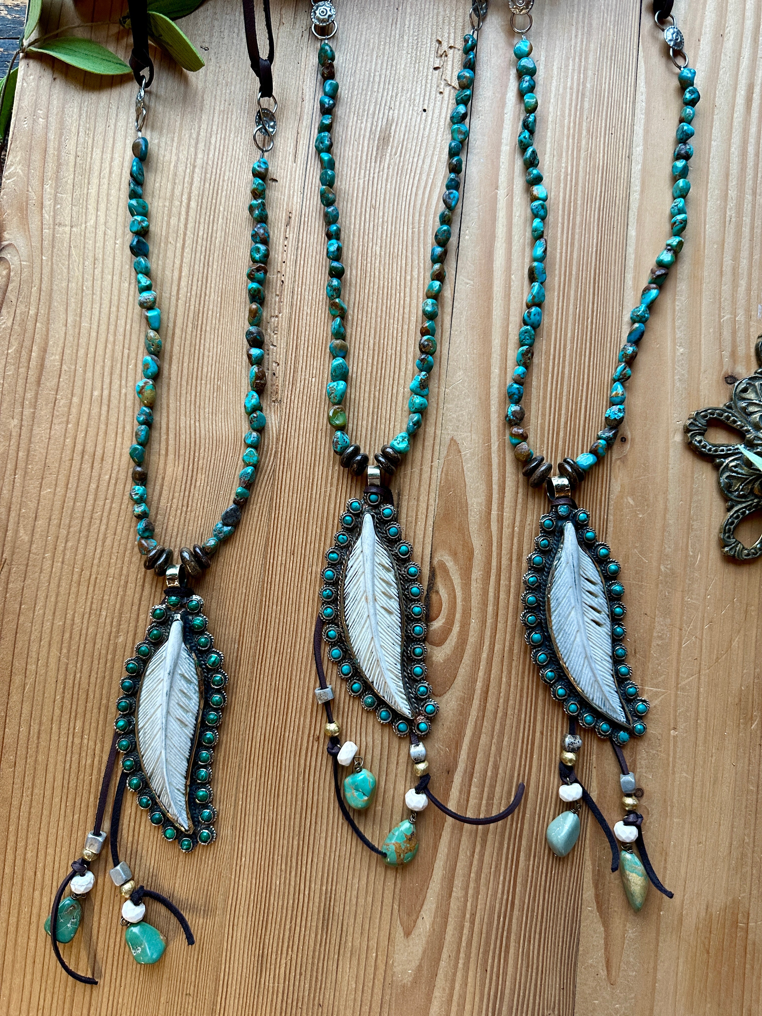 Artisan centerpiece: Striking bone feather set in Tibetan silver, accented with surrounding turquoise beads.