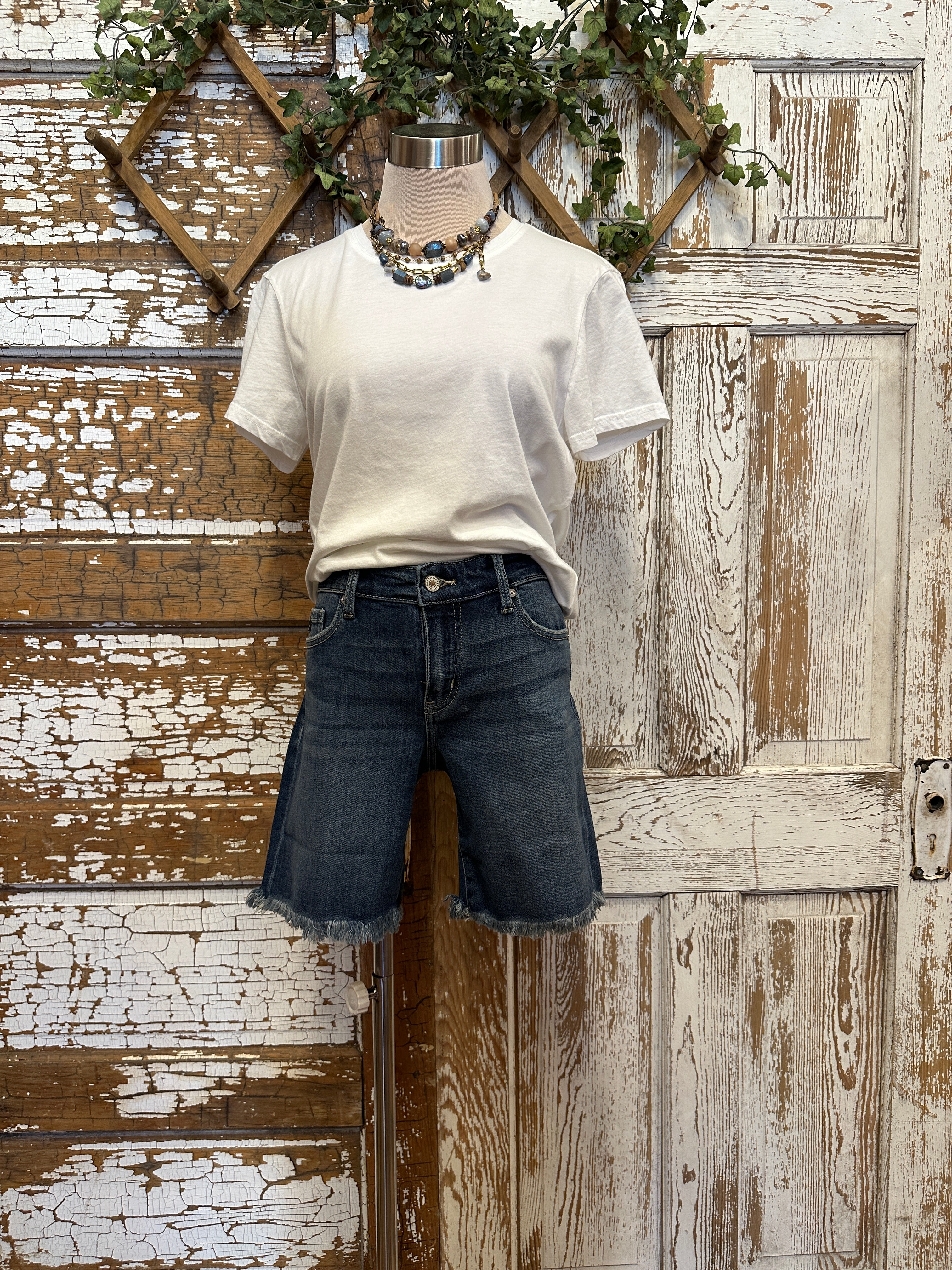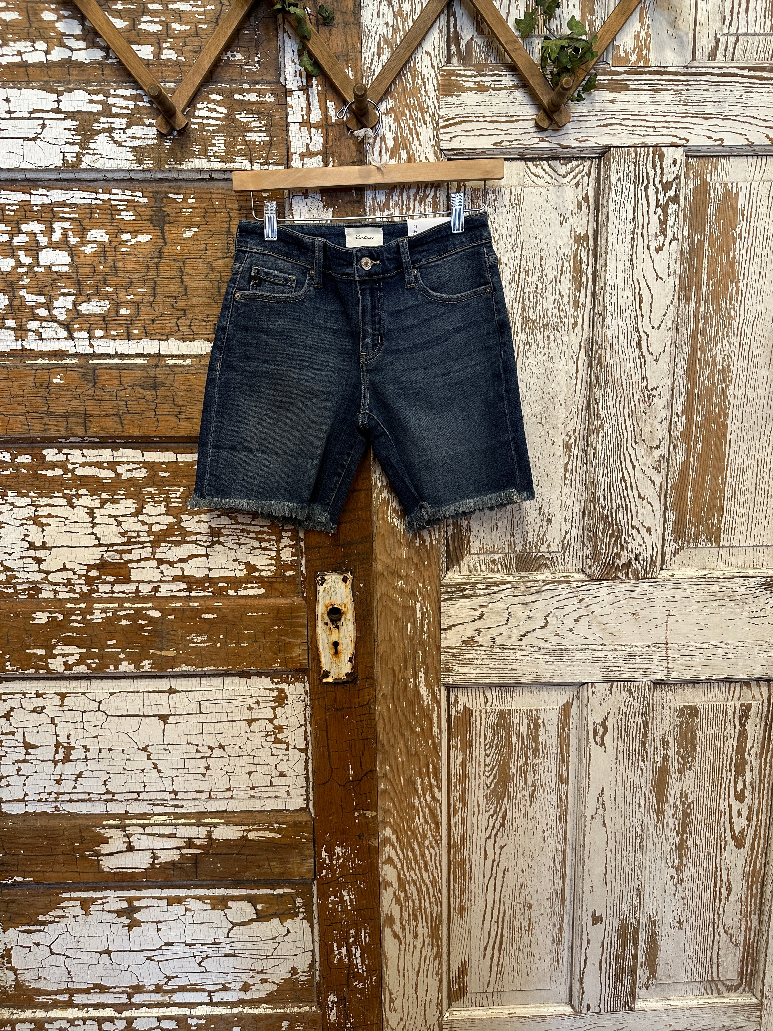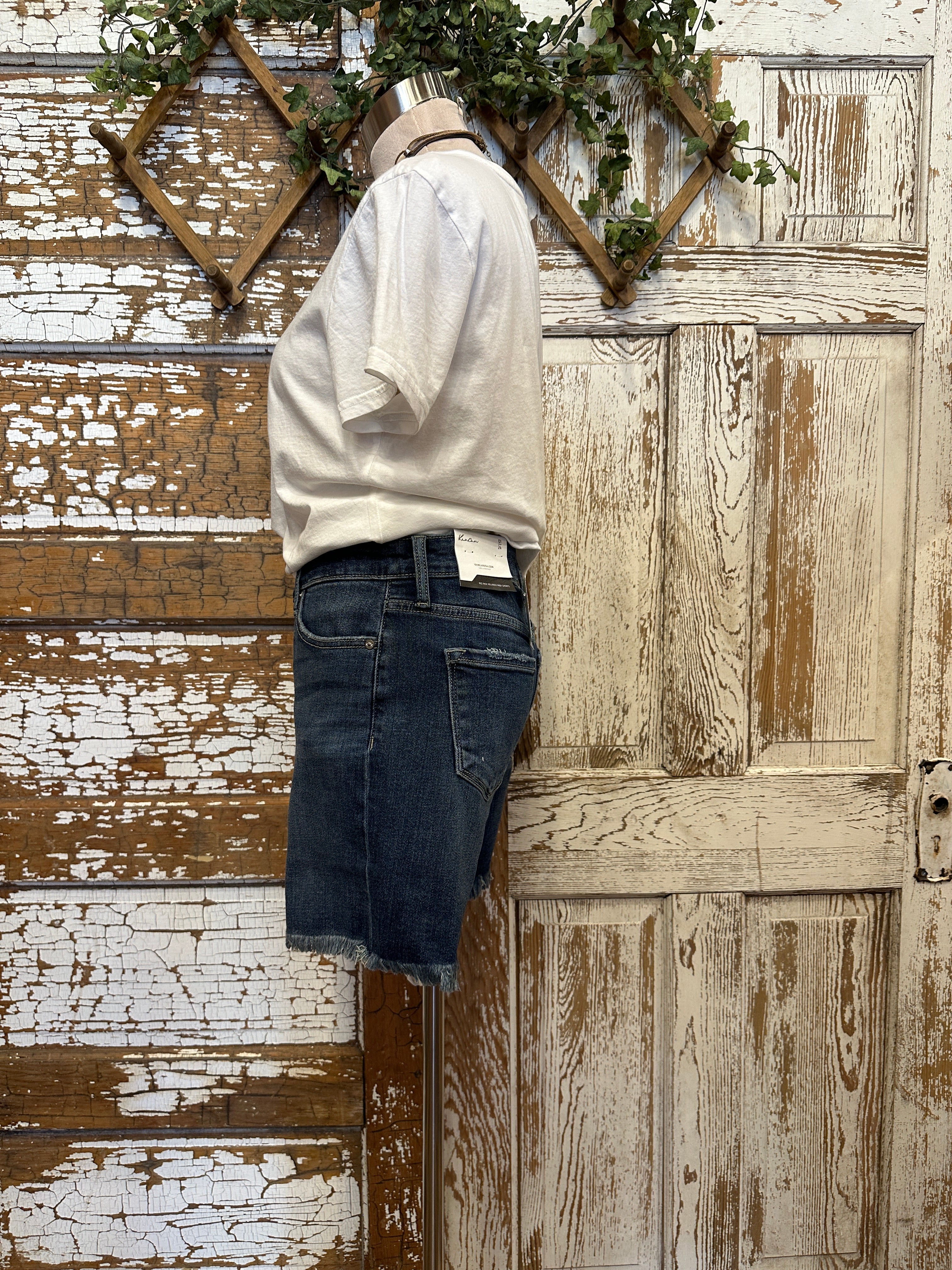 Dare to stand out in these edgy Midi Denim Shorts. The intense dark stone wash commands attention while the bold frayed hem defies convention. With a fearless 7" inseam and assertive 8.5" rise, these shorts challenge the ordinary. The zipper fly adds a provocative touch to this boundary-pushing denim essential.
