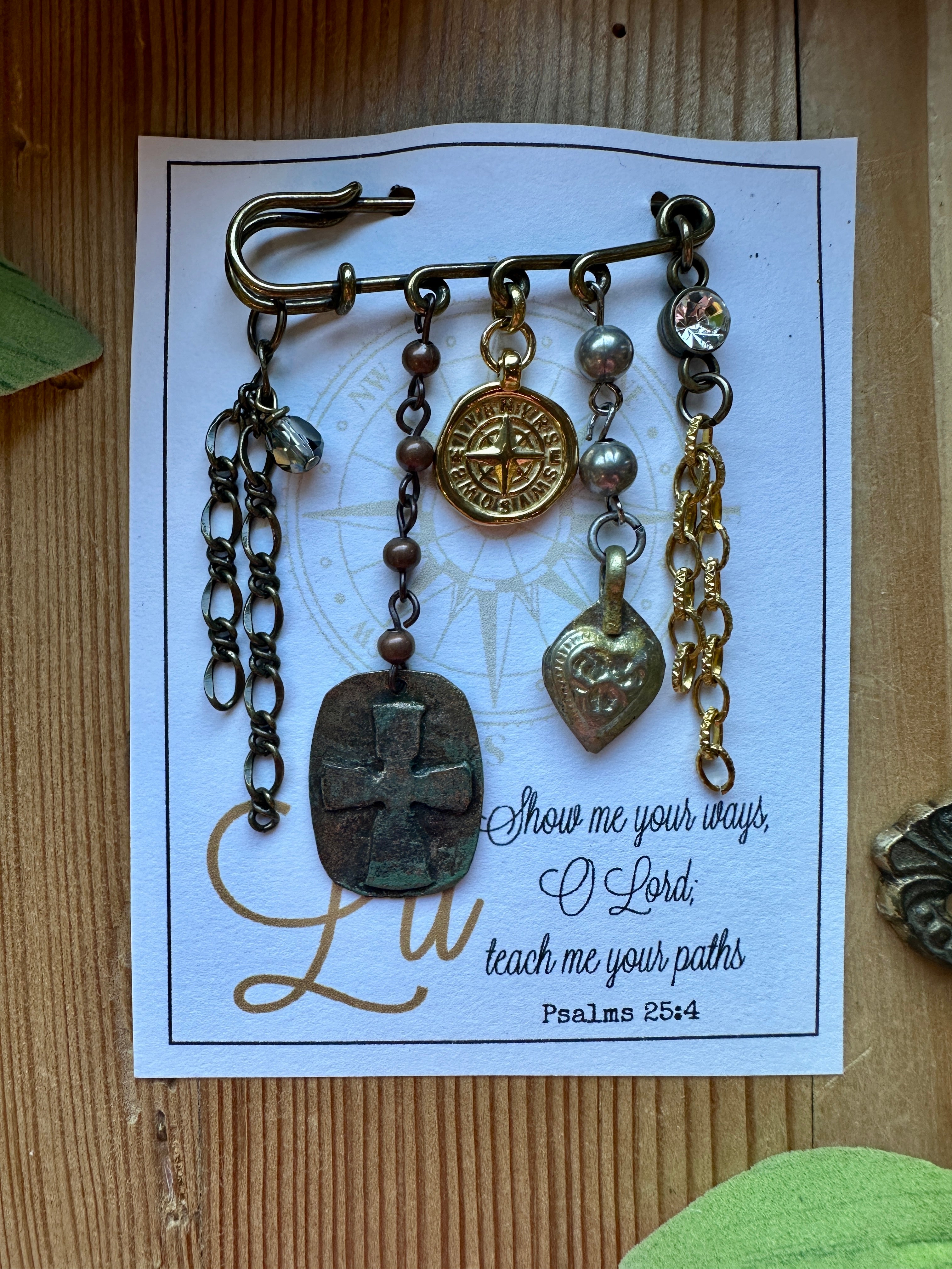 This handmade artisan brooch from Artistic Works by Lu is a meaningful blend of faith and artistry. Each charm and chain has been thoughtfully selected to create a layered, expressive piece that carries both beauty and purpose. The design features a collection of mixed-metal chains and meaningful charms, including a cross, compass, and heart, symbolizing guidance, love, and devotion. A touch of sparkle adds boutique elegance to this faith-inspired accessory.