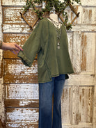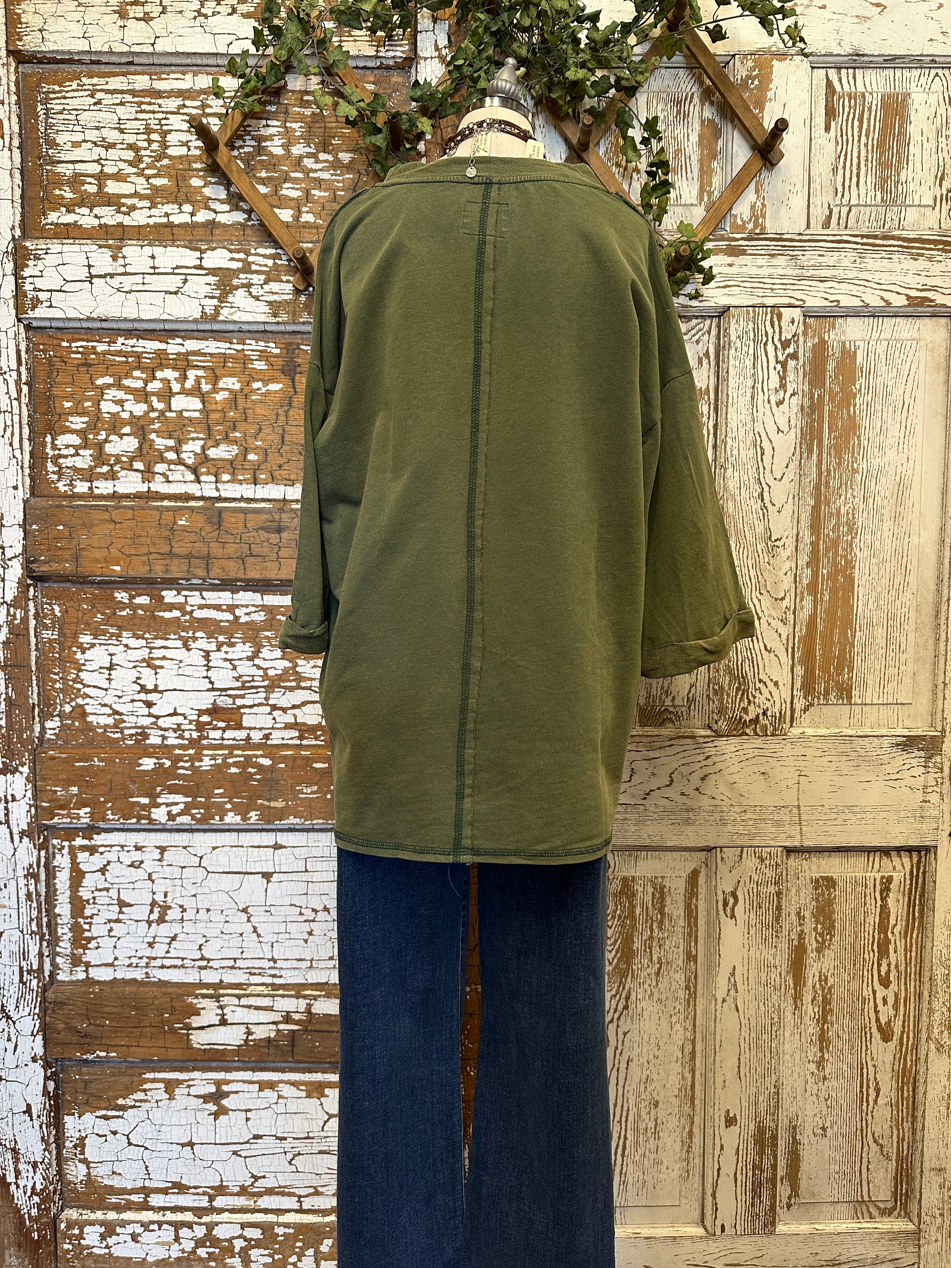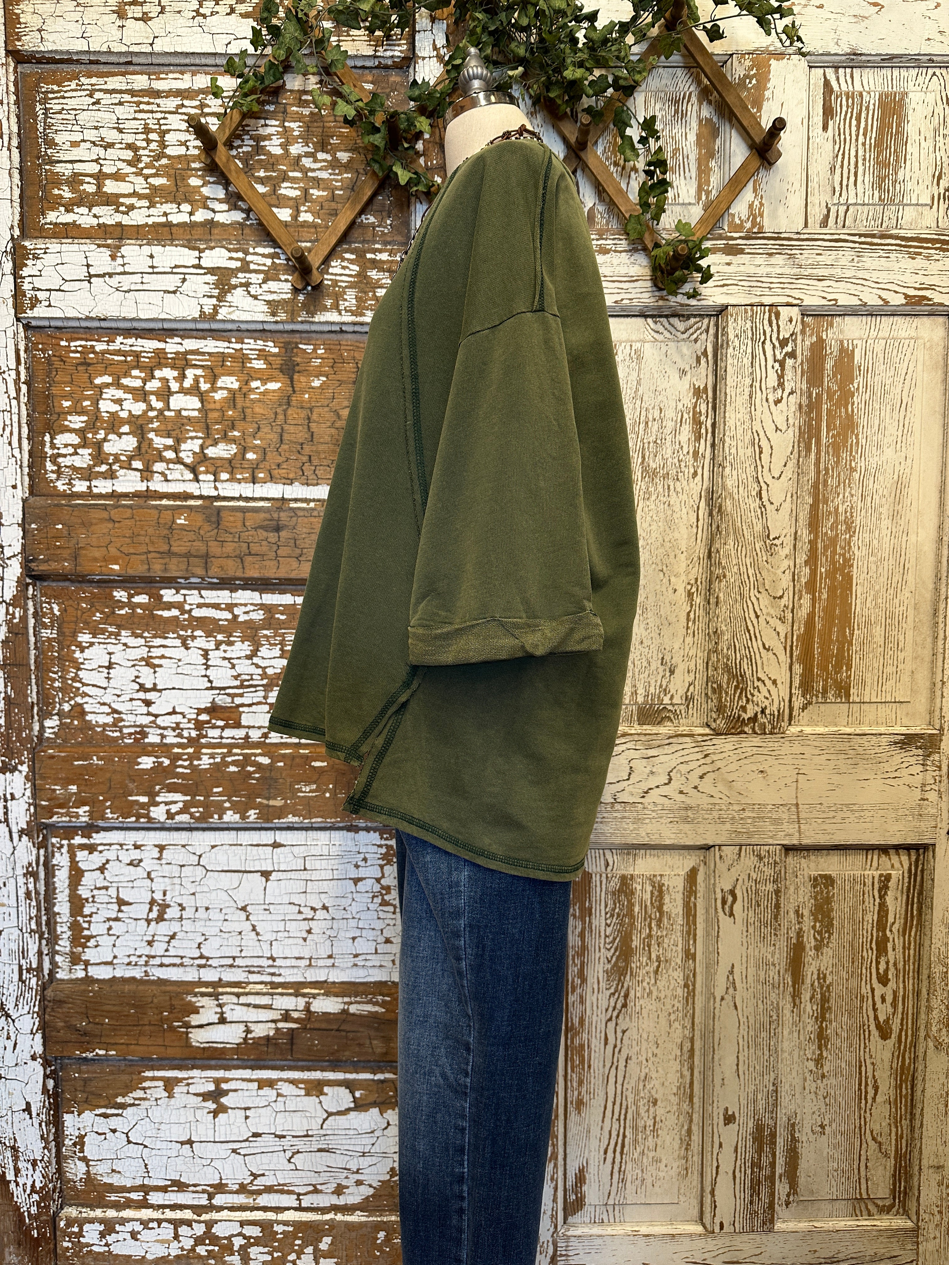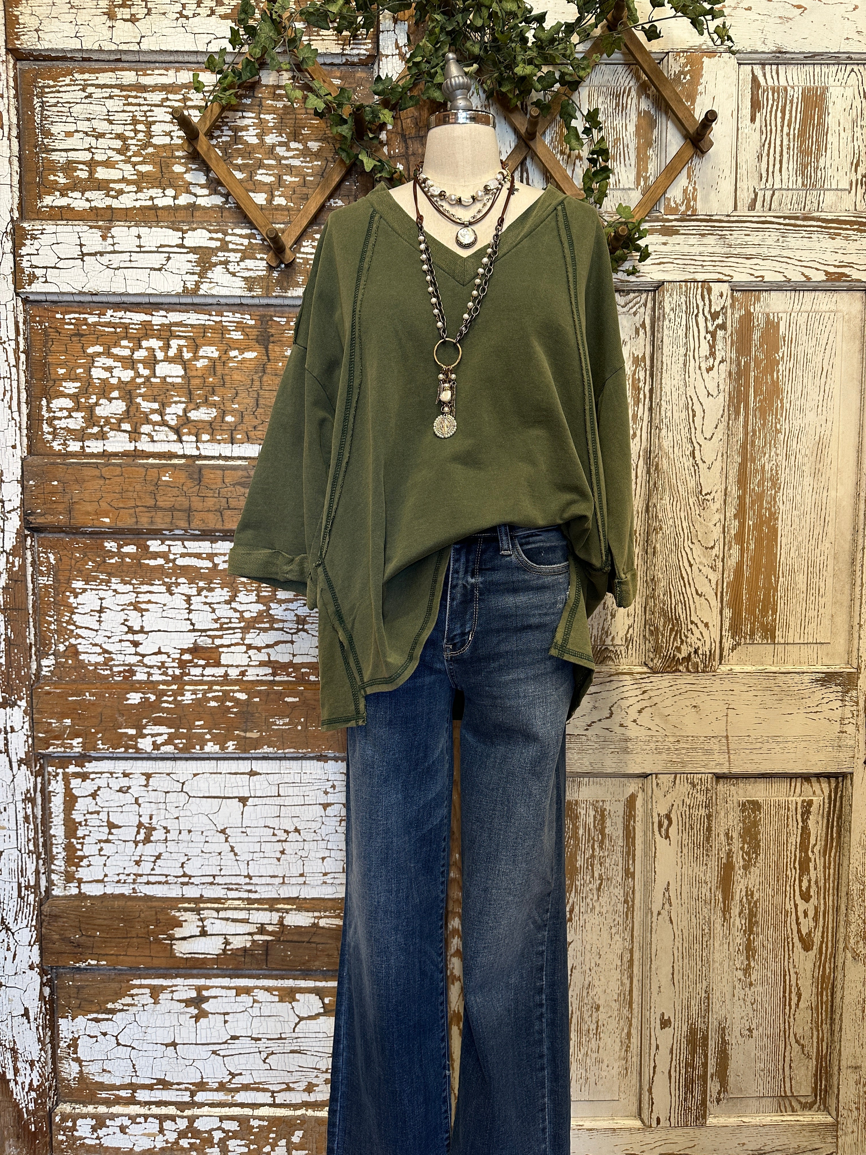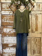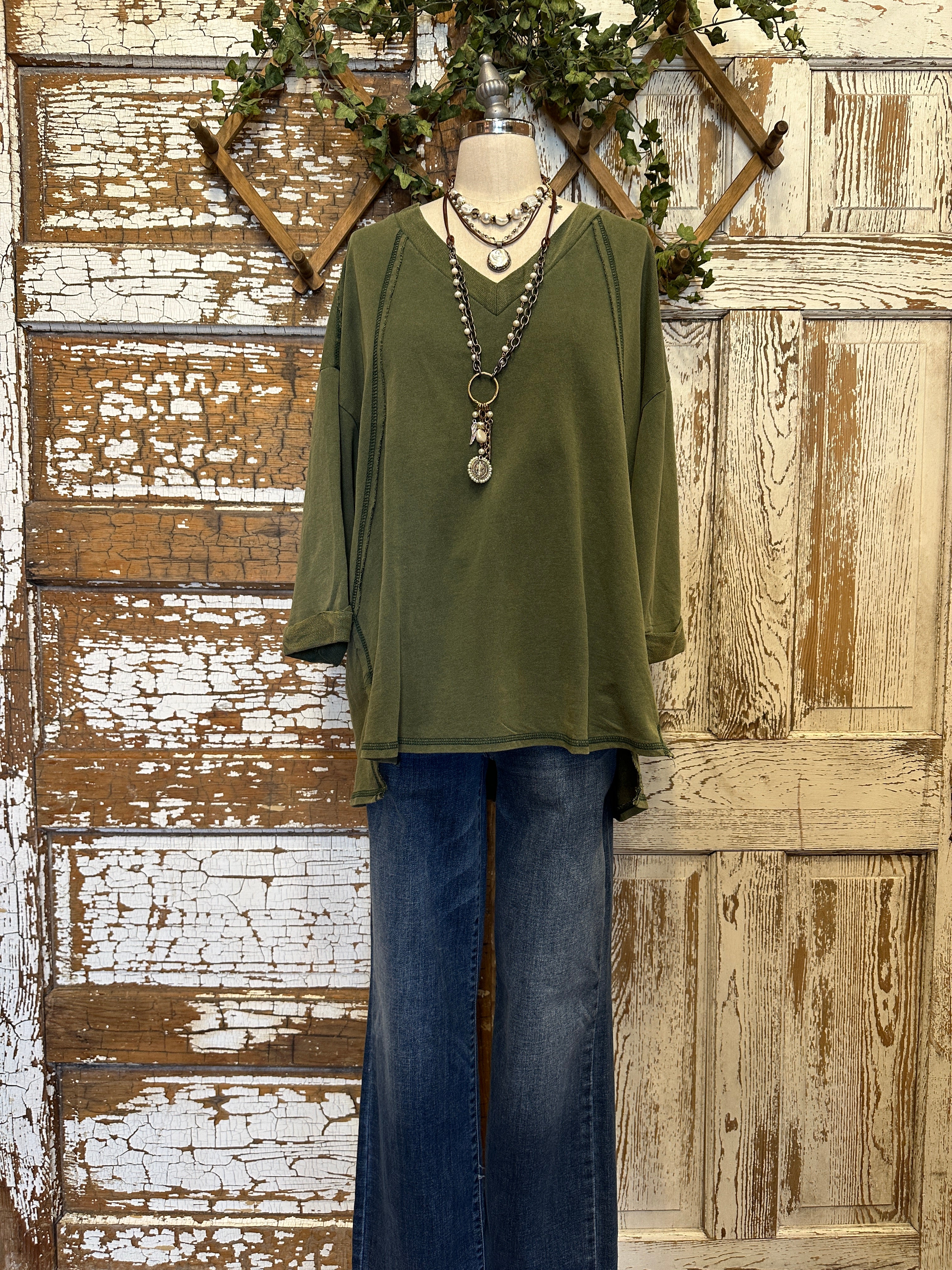 Boutique Clothing Essential: Soft moss green French terry top with a flattering v-neckline