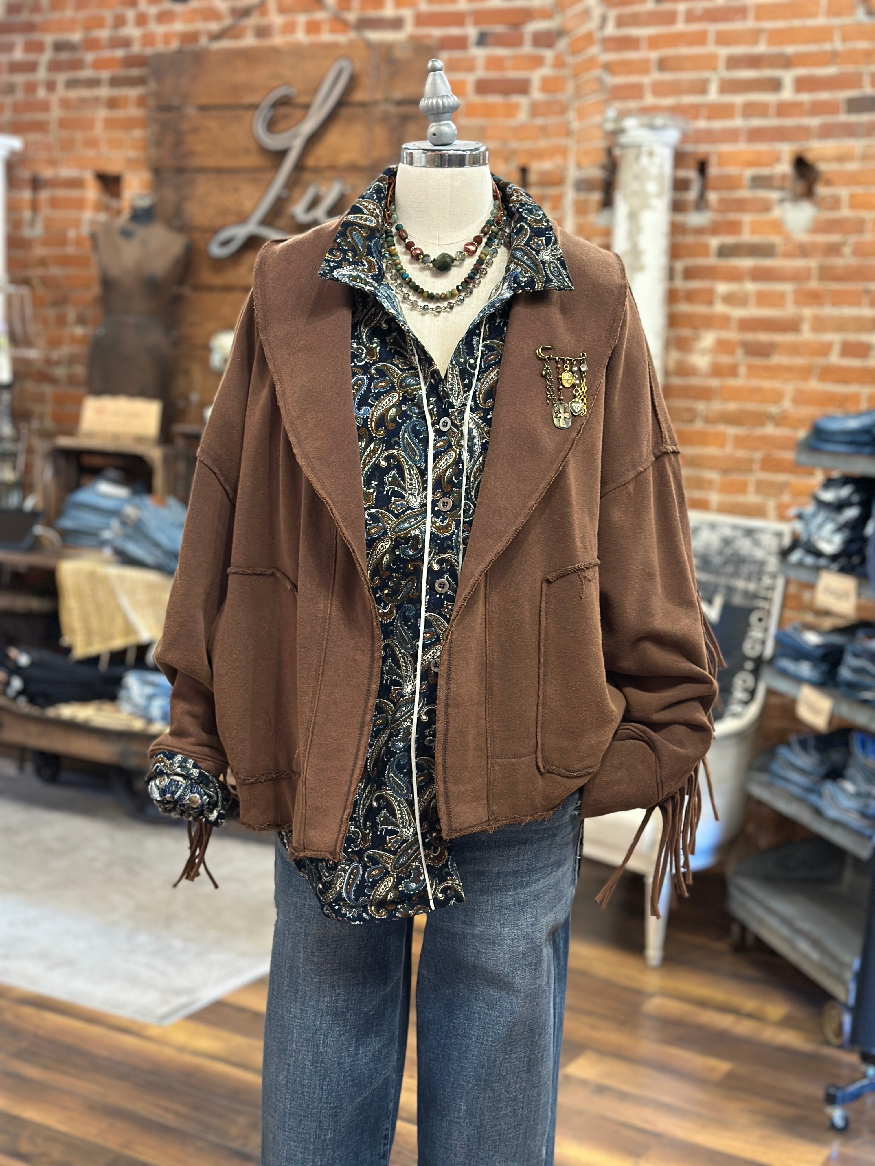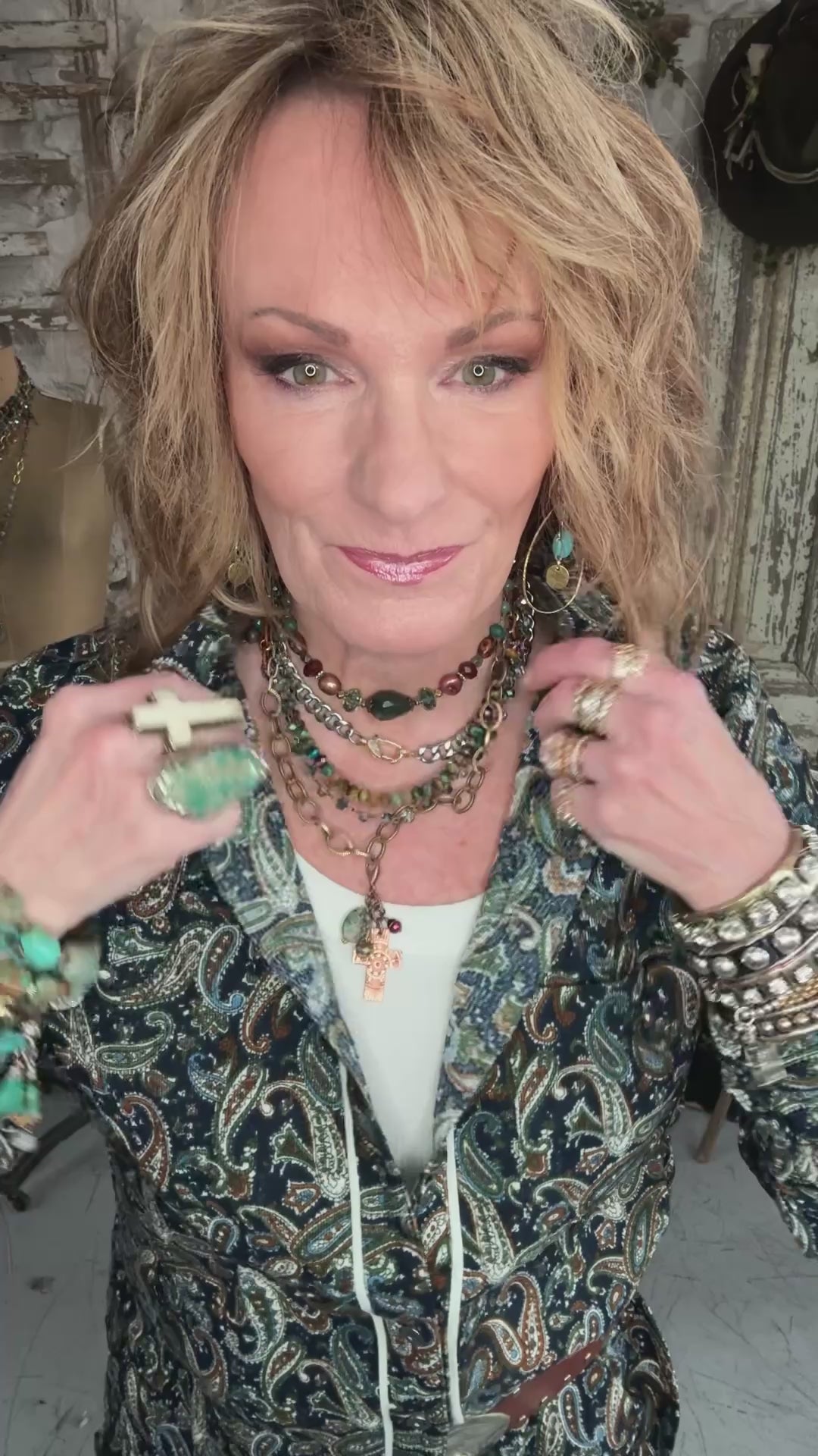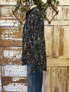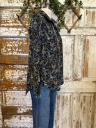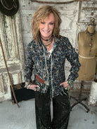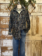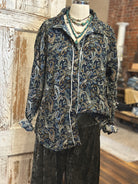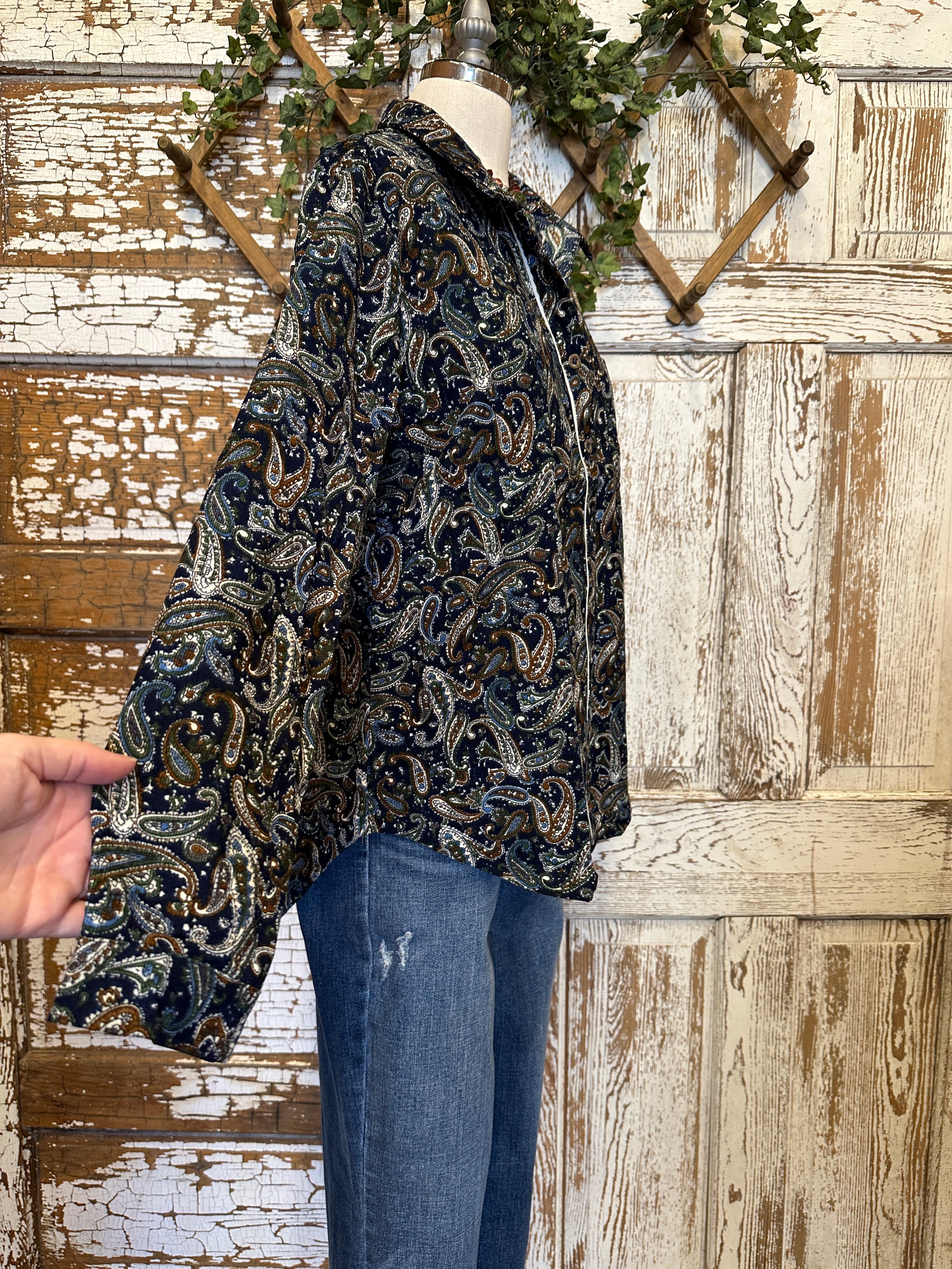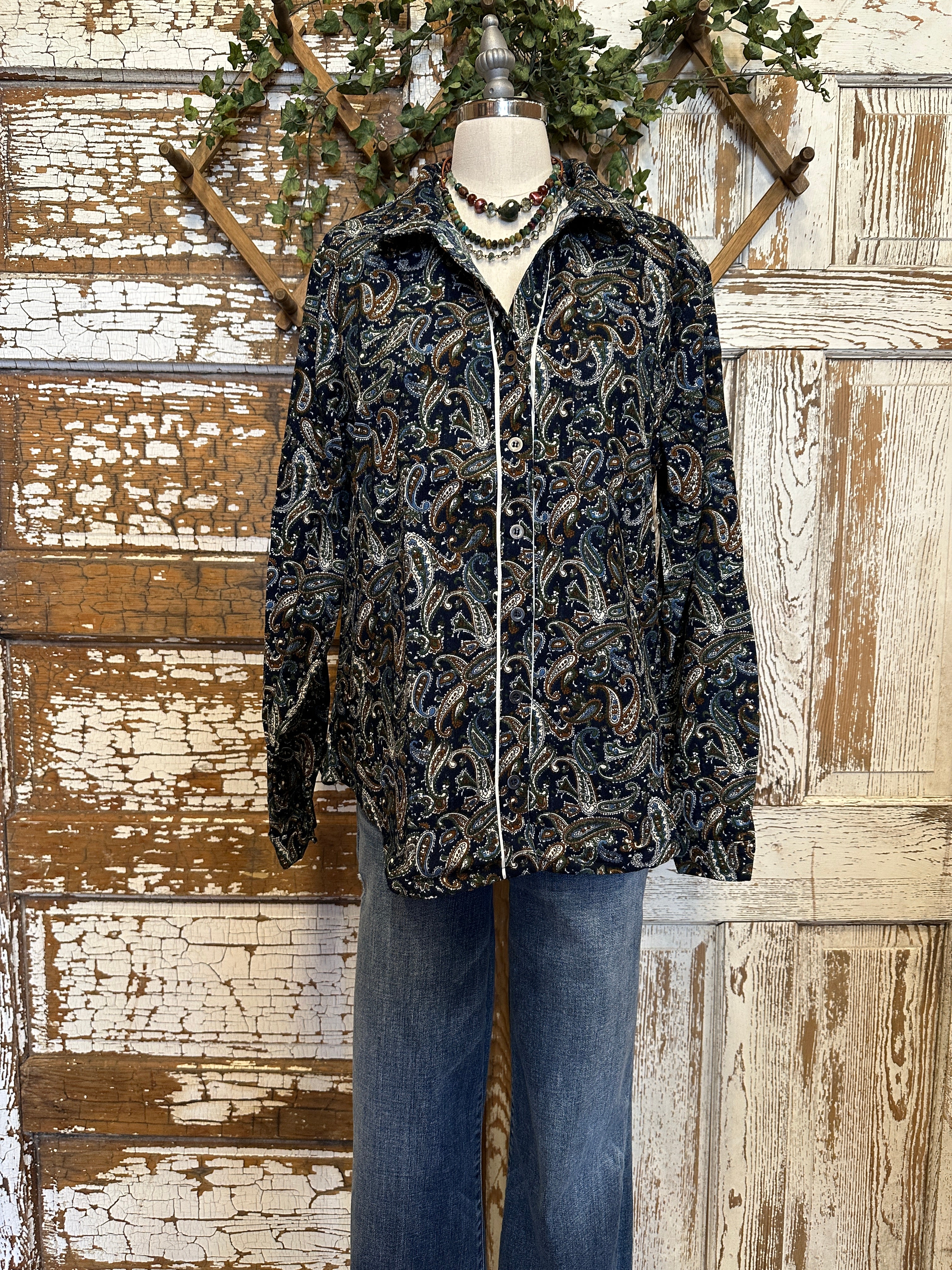Embrace bohemian elegance with our stunning Paisley Micro Corduroy blouse, a versatile layering piece designed to elevate your everyday style. This button-up shirt jacket features a rich, intricate paisley pattern in a sophisticated palette of deep navy, teal, rust, and cream, making it a true statement piece that's both eye-catching and effortlessly chic. Perfect for adding a touch of artistic flair to any ensemble. Crafted from a soft, fine-wale corduroy, this shacket offers supreme comfort and a luxurious feel. The classic collared design and full button-up front, accented with crisp white piping along the placket, create a polished yet relaxed silhouette. Its relaxed fit allows for easy layering over your favorite tees or blouses, providing warmth and style without bulk. Whether you're heading to a casual brunch, exploring a flea market, or simply enjoying a cozy evening out, this paisley shacket is your go-to. Pair it with jeans for an easygoing look, or dress it up with dark trousers and boots. It's an essential addition for those who appreciate unique patterns and comfortable, fashionable clothing.