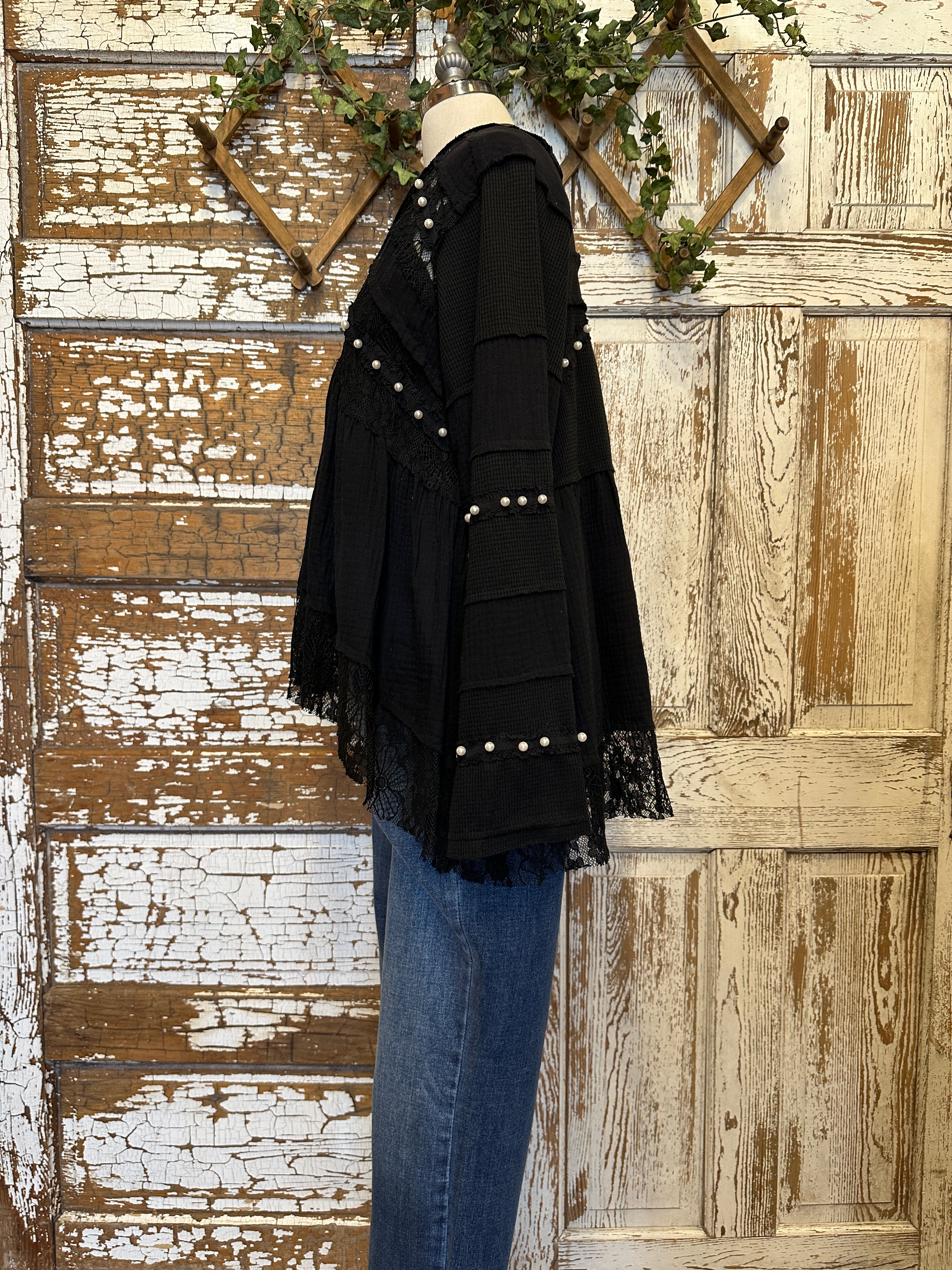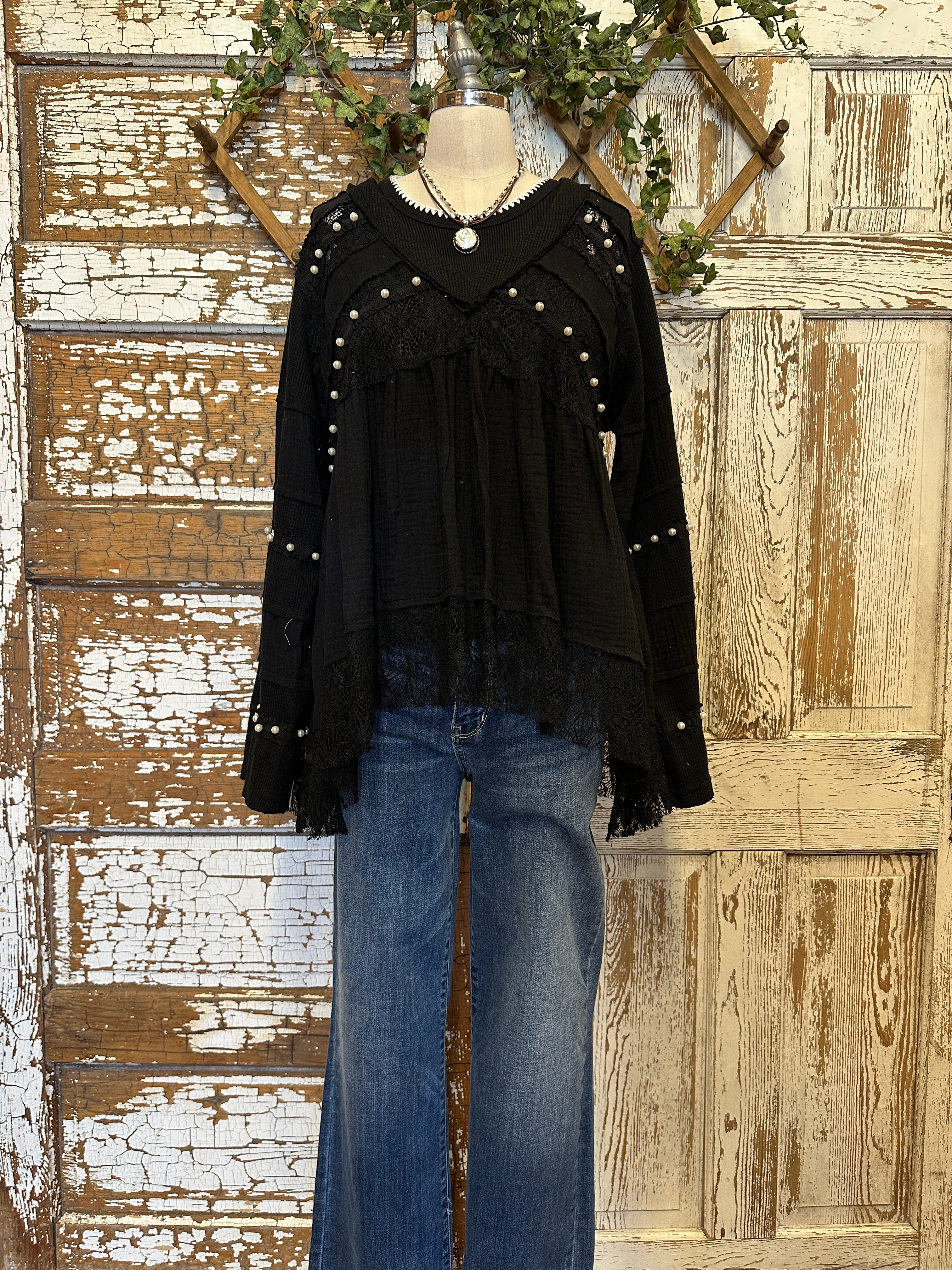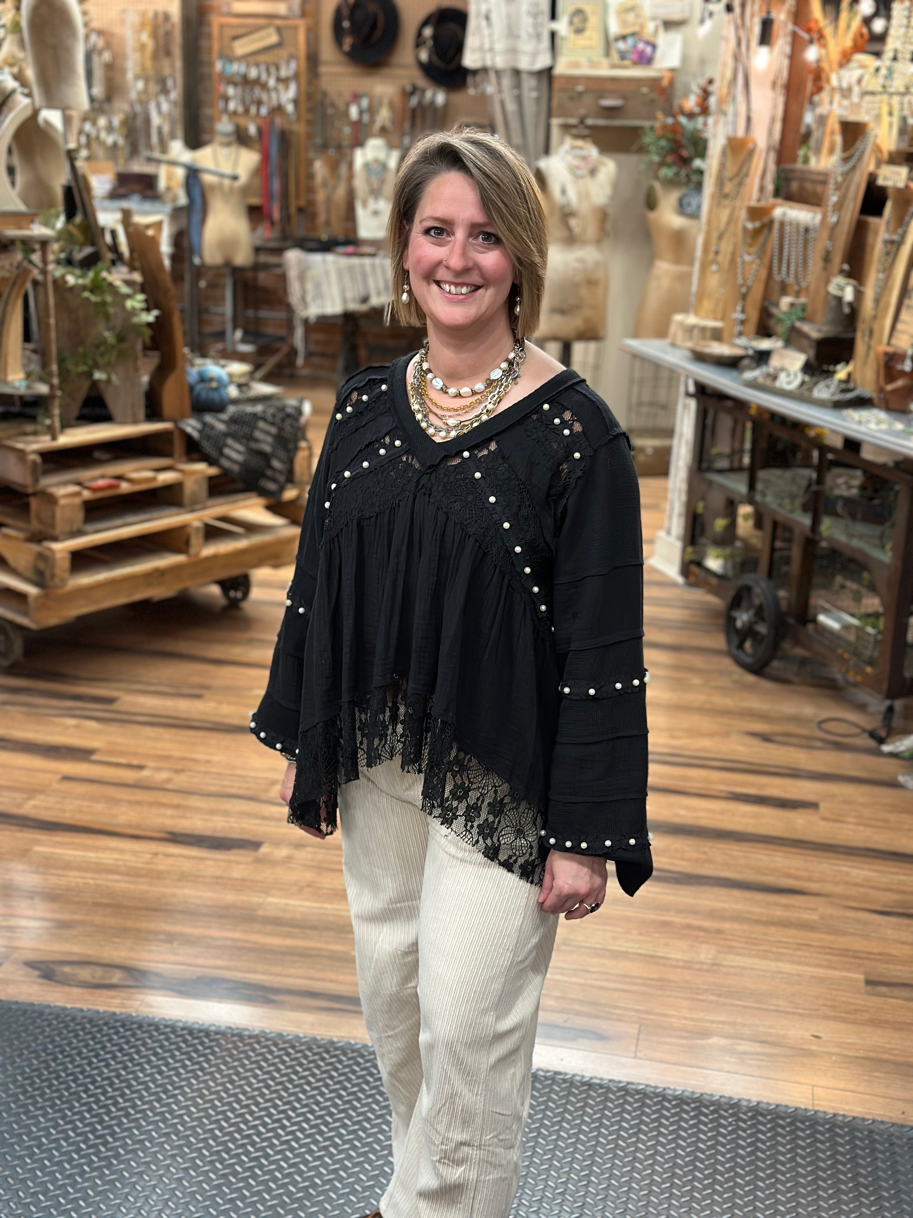Make a statement with this black lace and pearl accent top, a boutique favorite designed for effortless elegance. With its flowing silhouette and intricate lace detailing, it pairs beautifully with our handmade artisan jewelry for a timeless, elevated style.