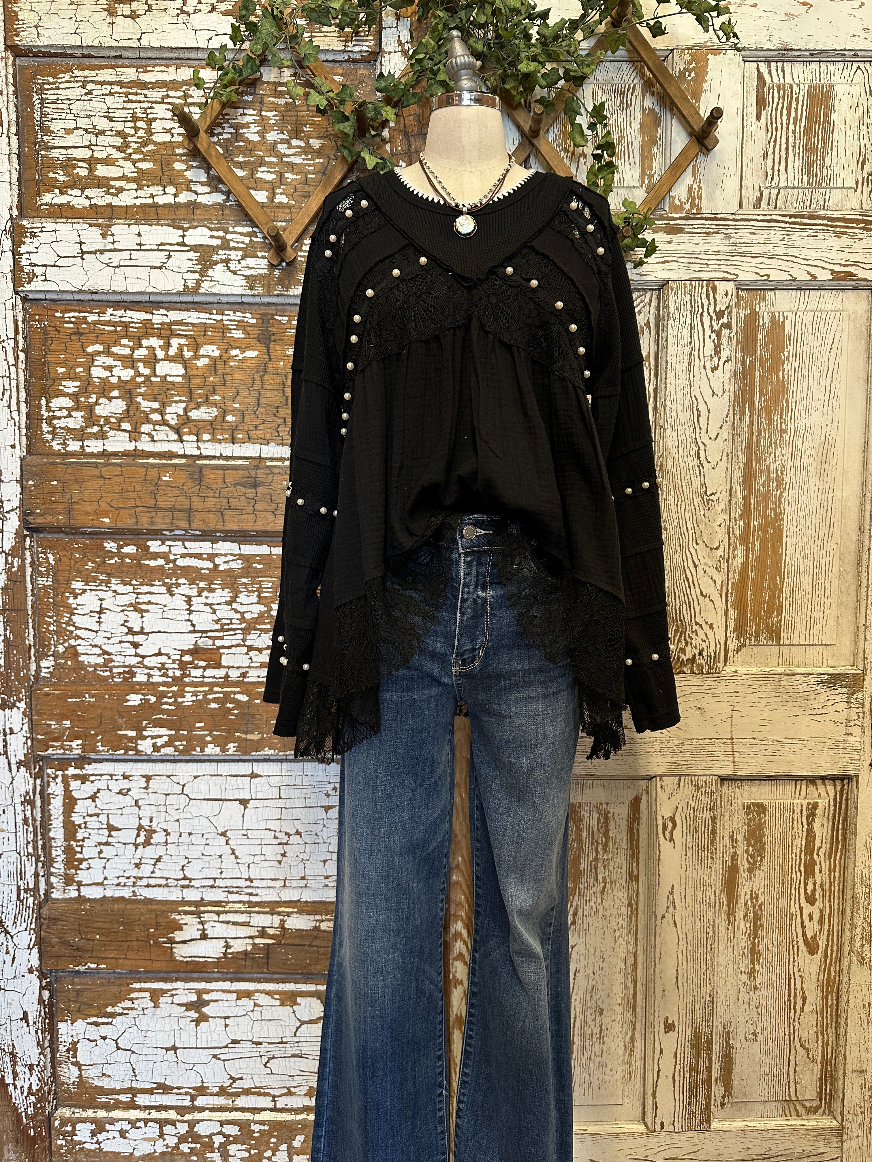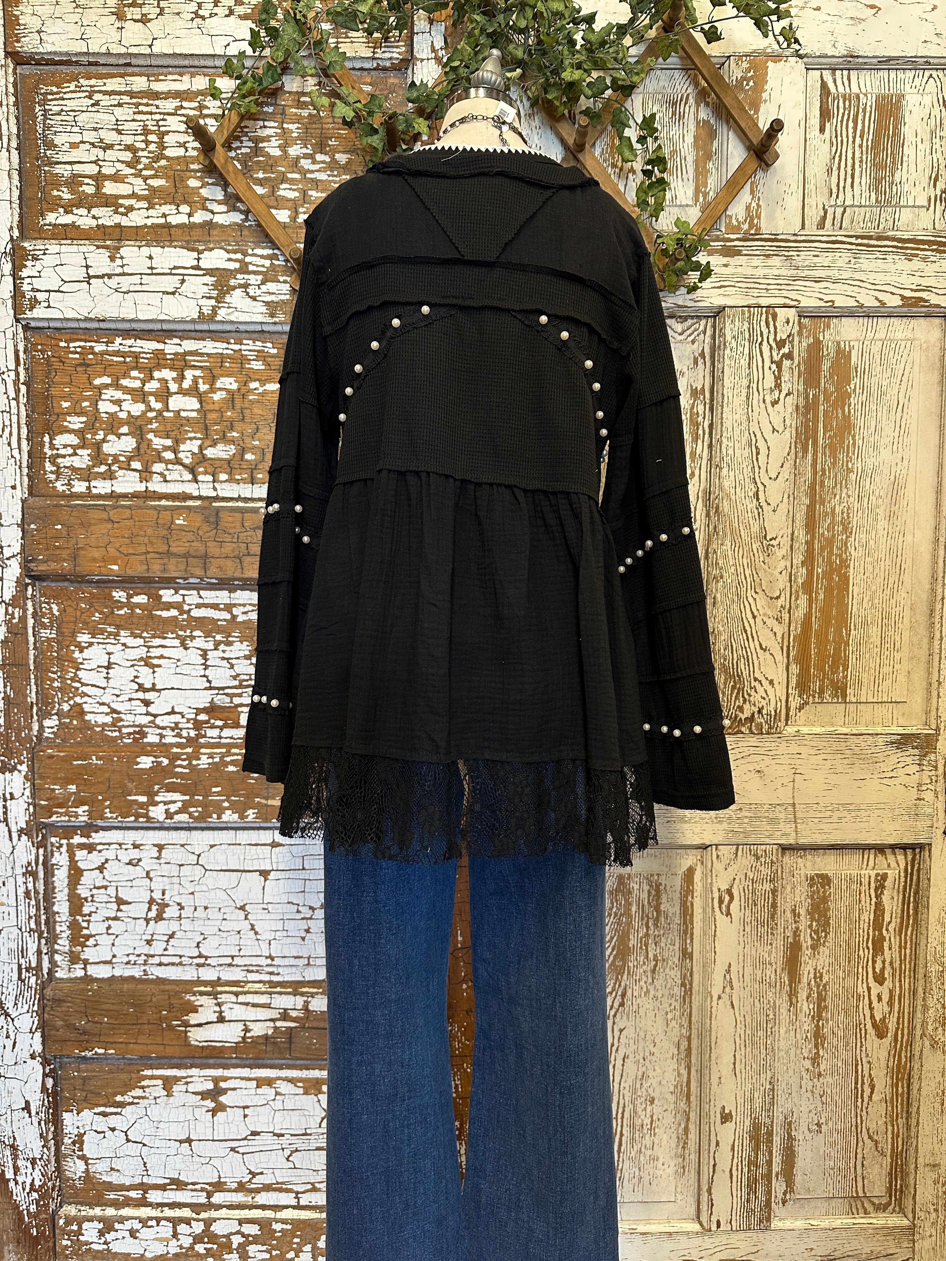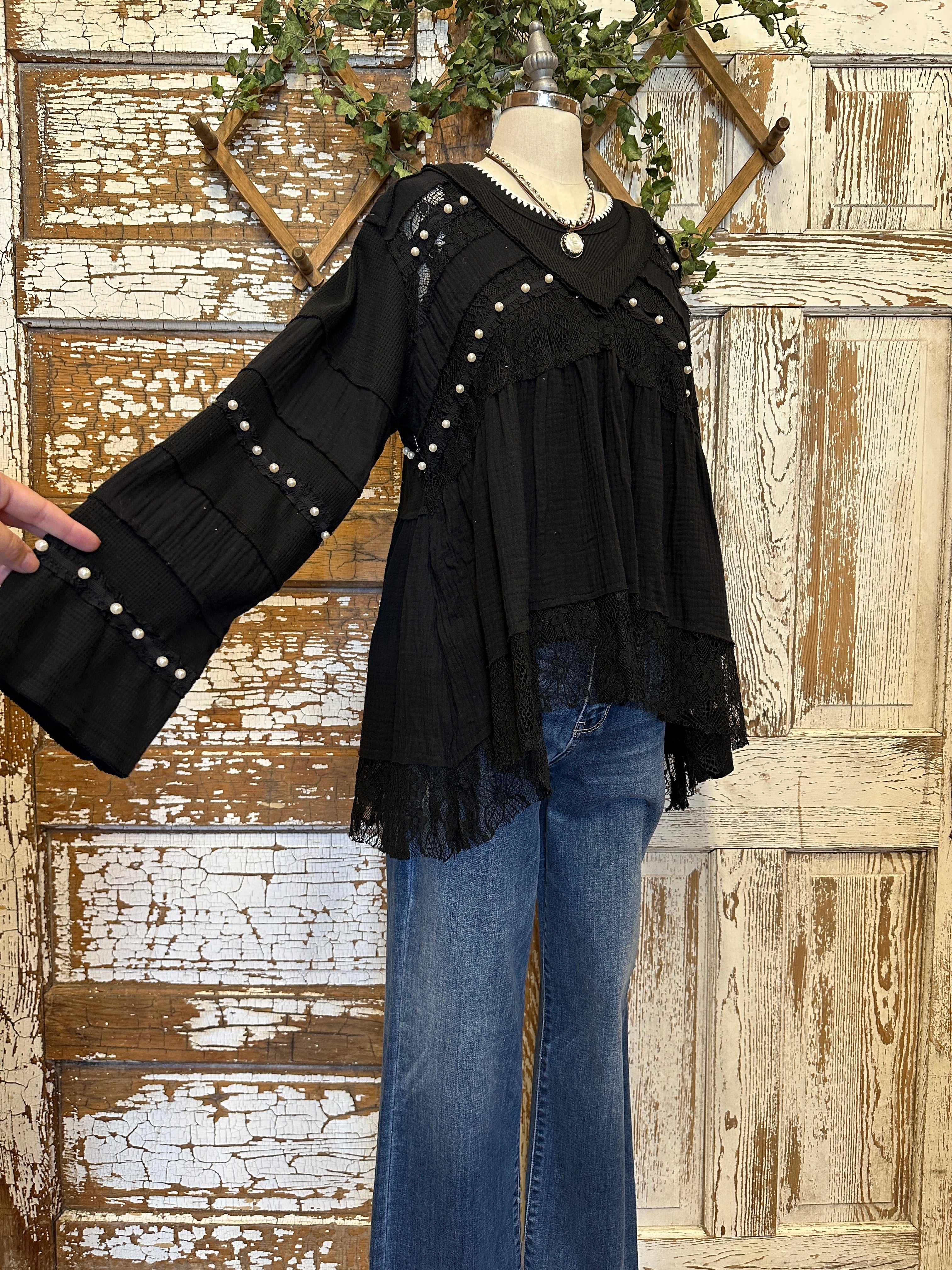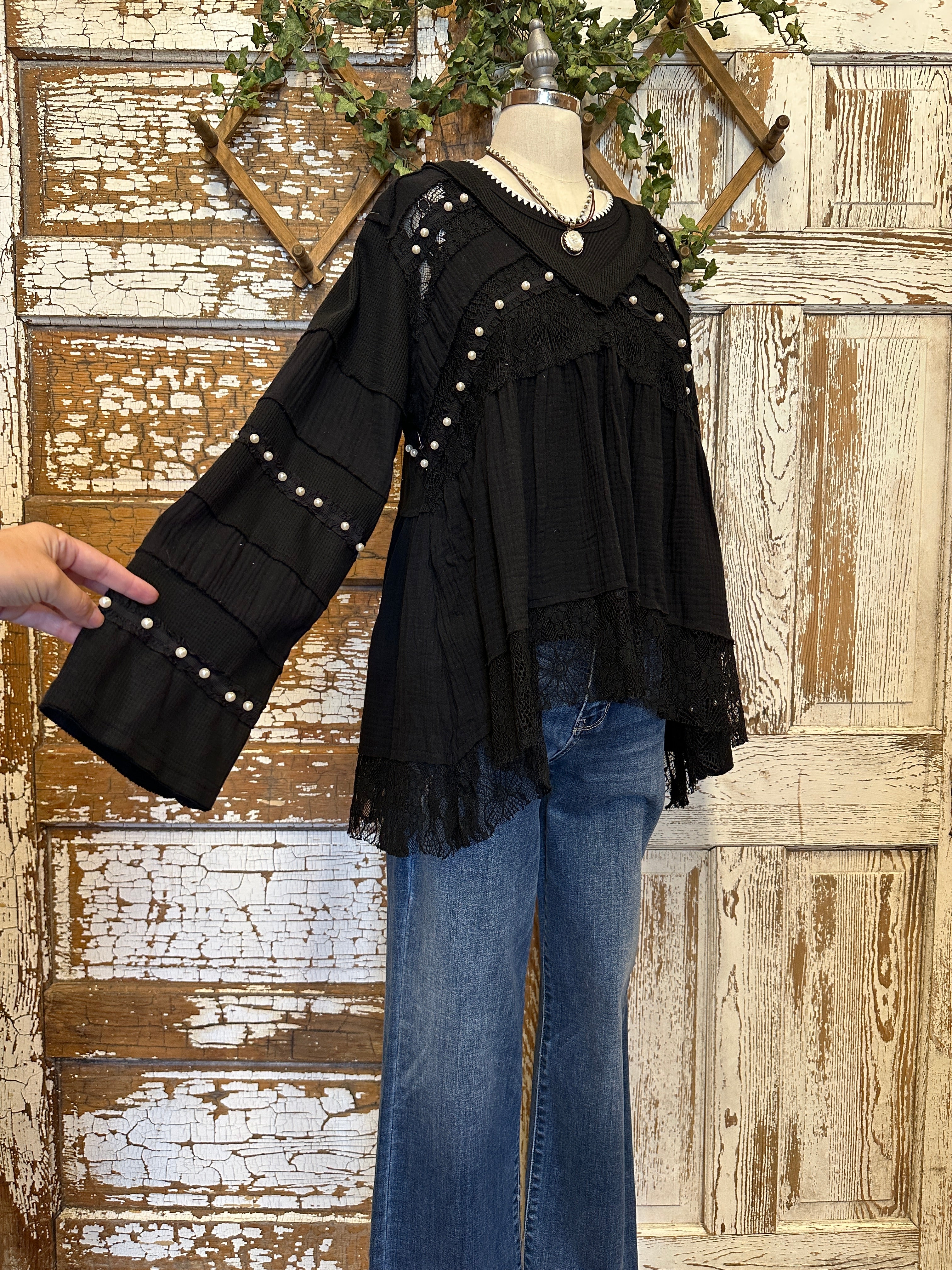 Make a statement with this black lace and pearl accent top, a boutique favorite designed for effortless elegance. With its flowing silhouette and intricate lace detailing, it pairs beautifully with our handmade artisan jewelry for a timeless, elevated style.