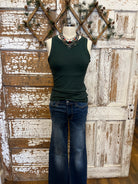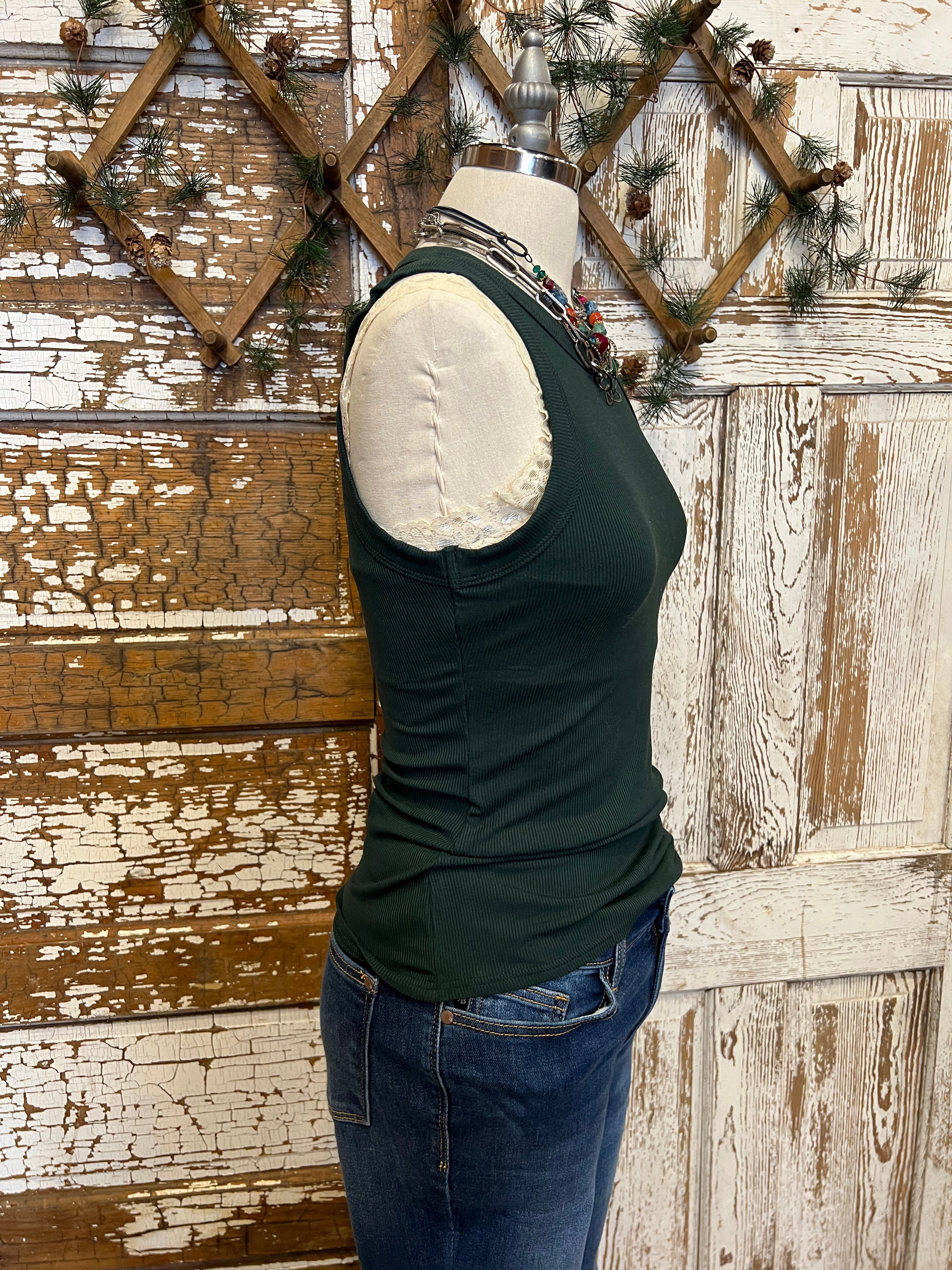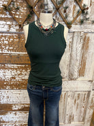 The Pine Green Ribbed Tank is a versatile staple for any wardrobe. Its high neck adds a touch of sophistication while its ribbed design provides a flattering fit. Great for layering, simply size up for a more relaxed look. Available in sizes Small to 2X.
