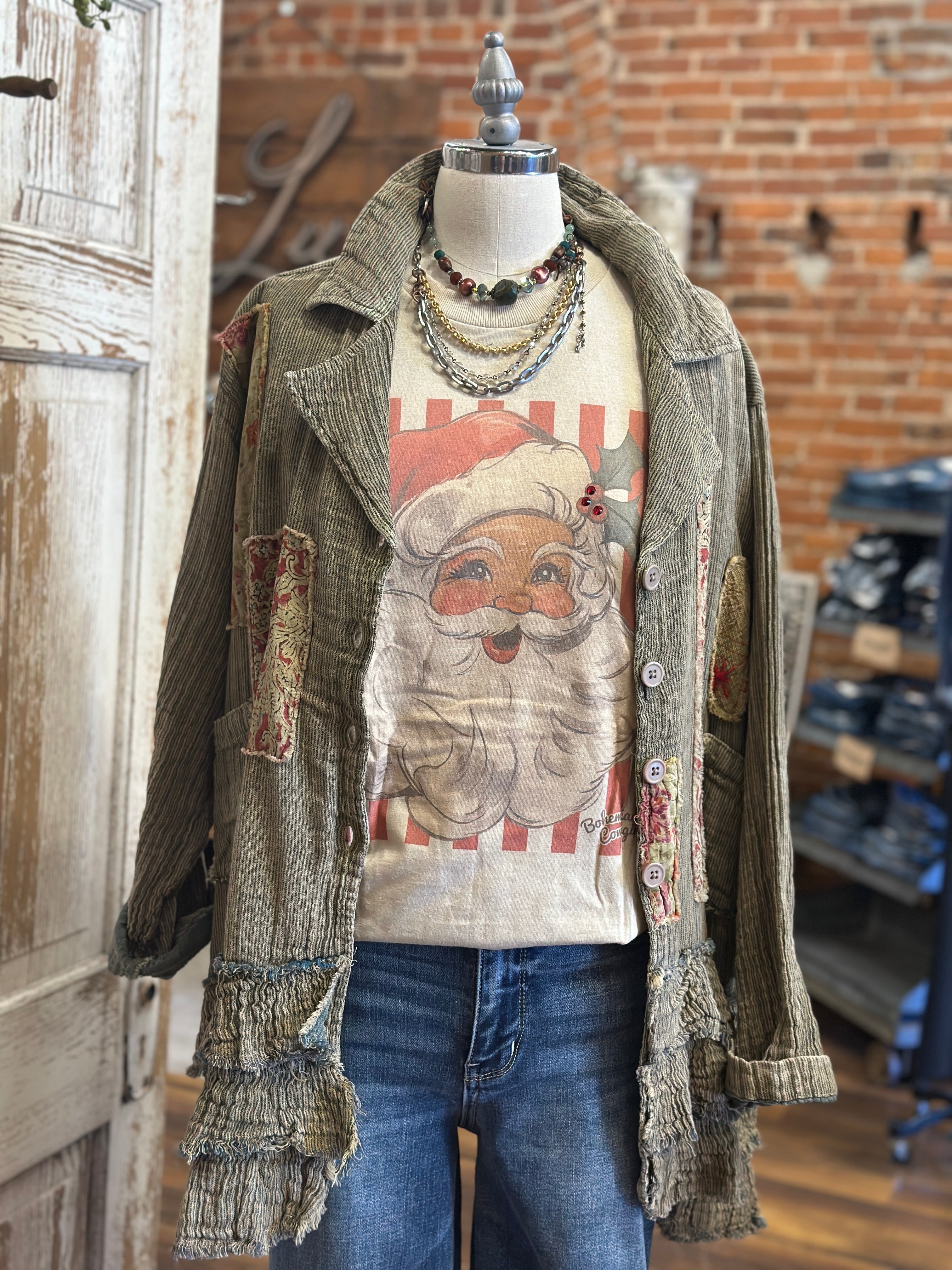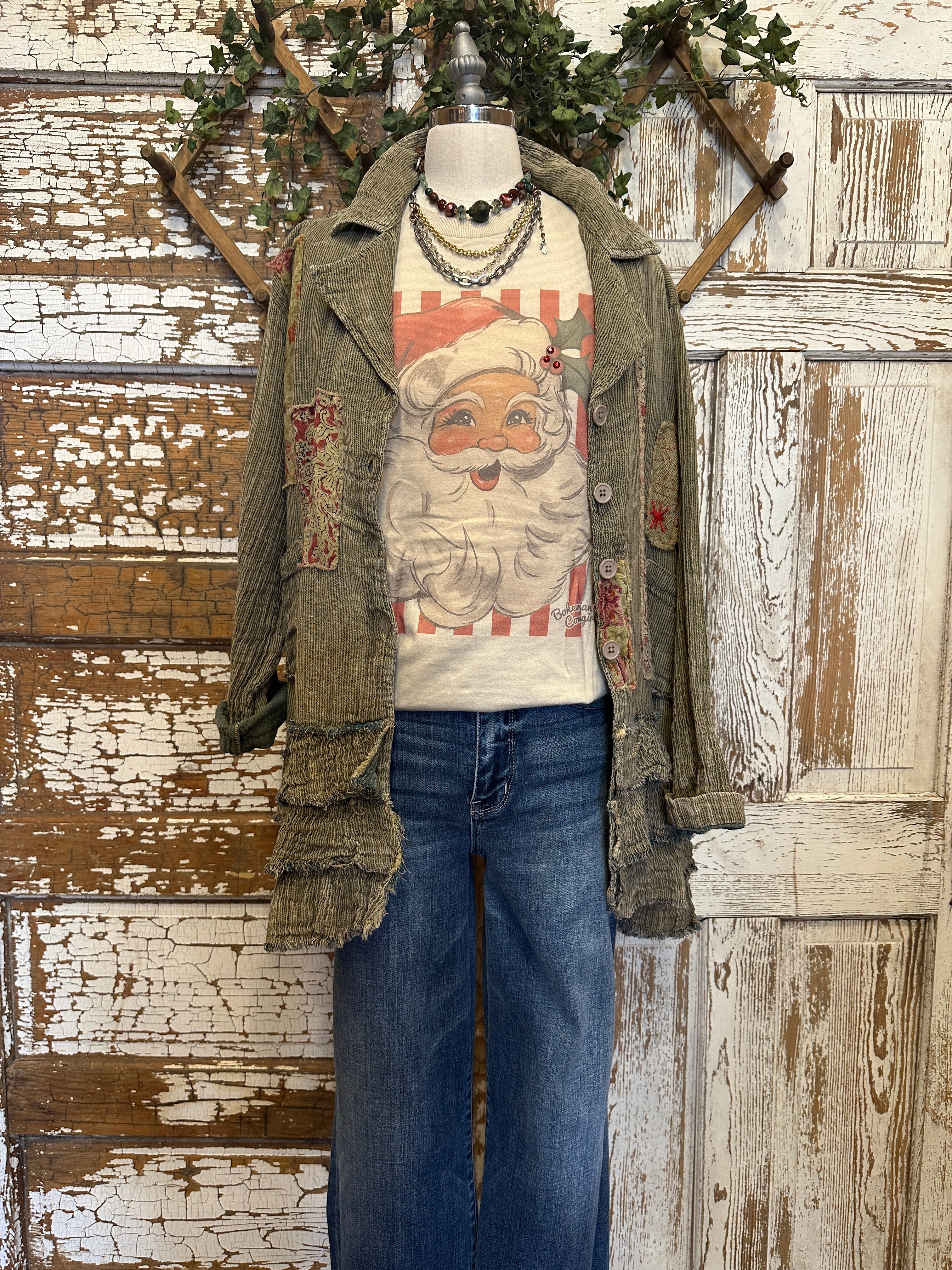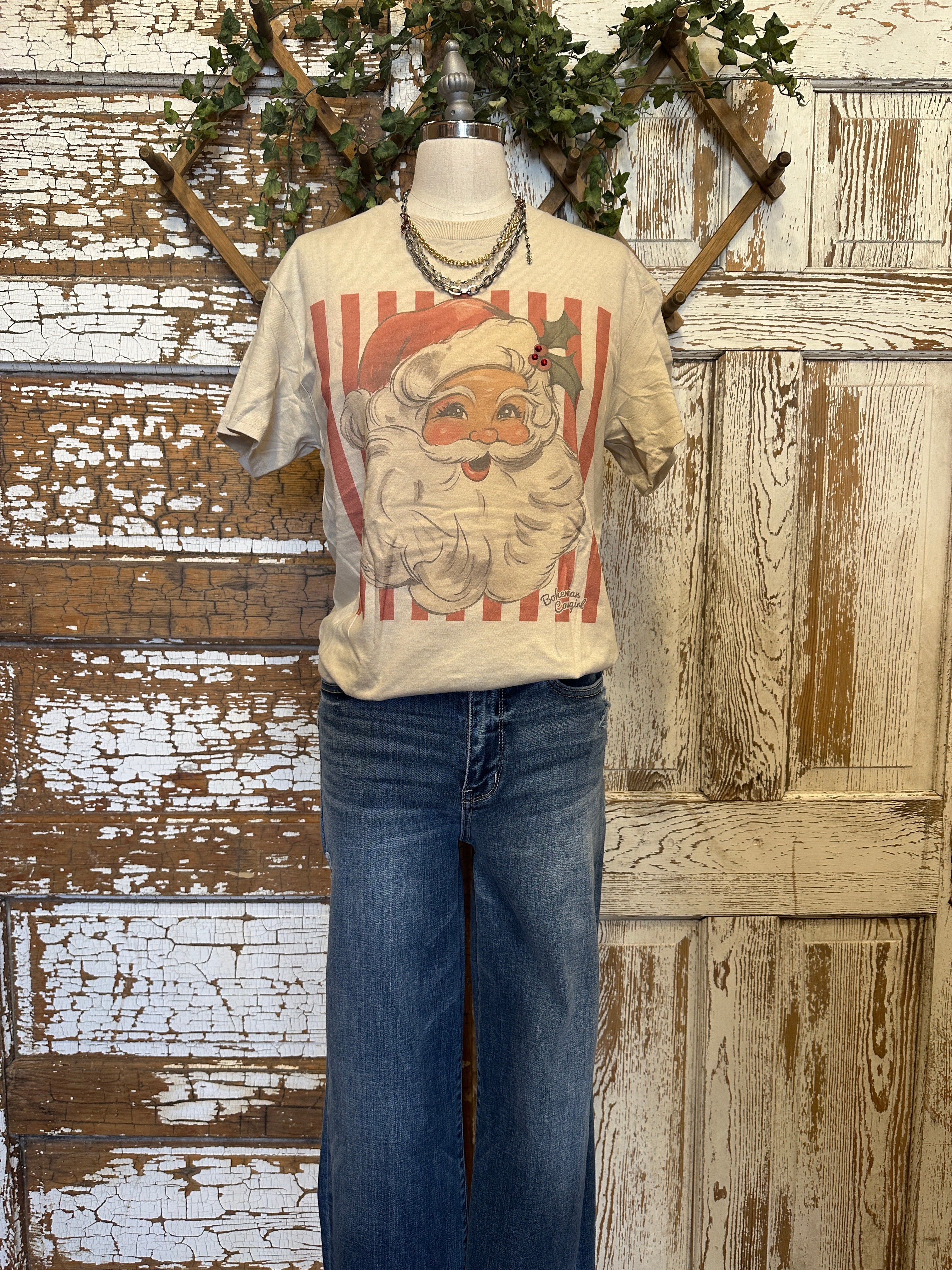 - Charming vintage Santa Claus graphic with holly details.