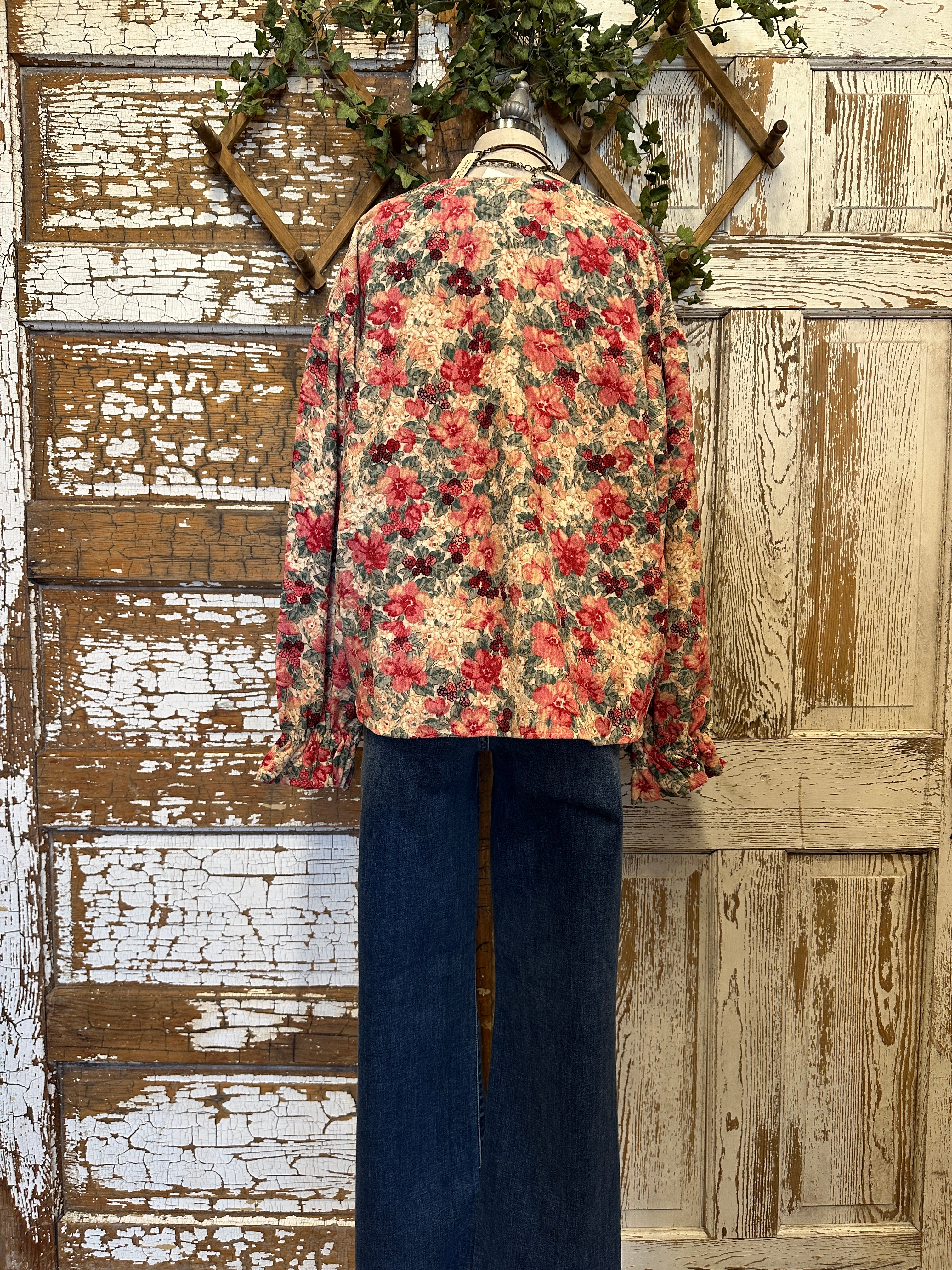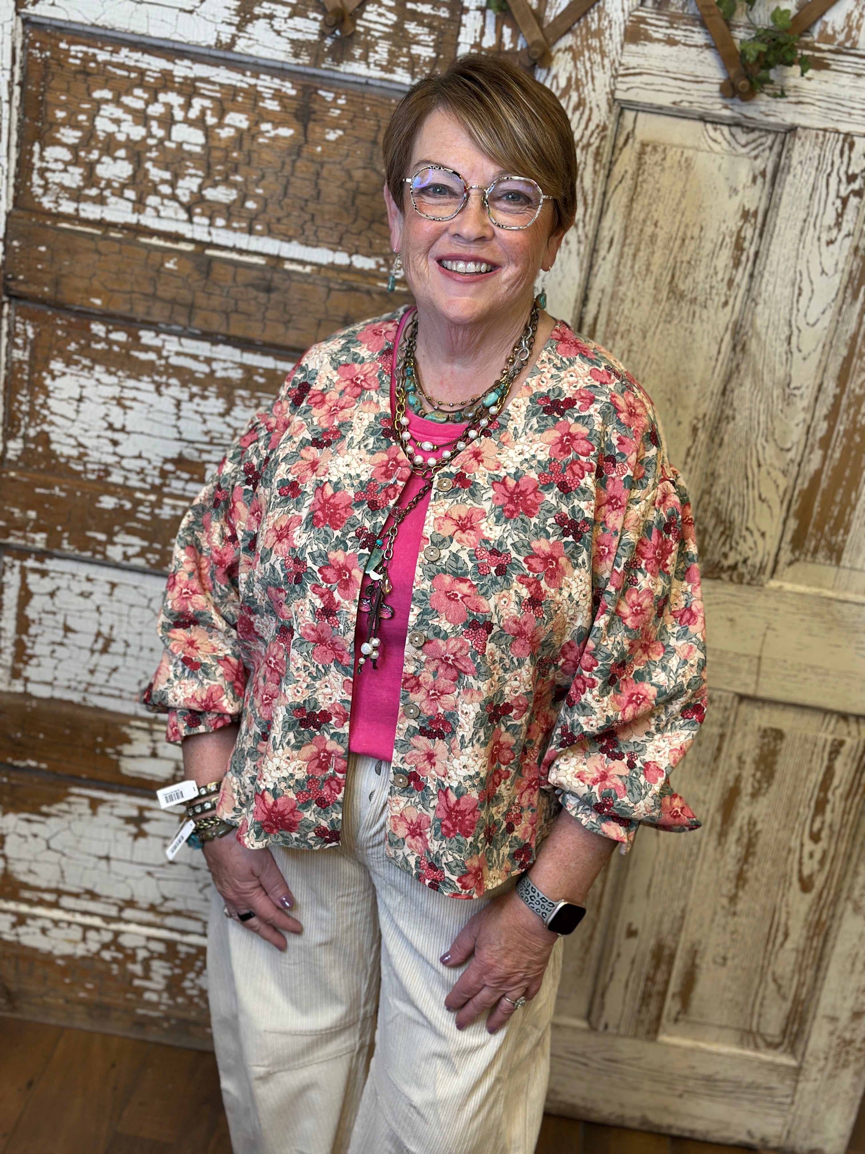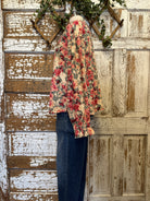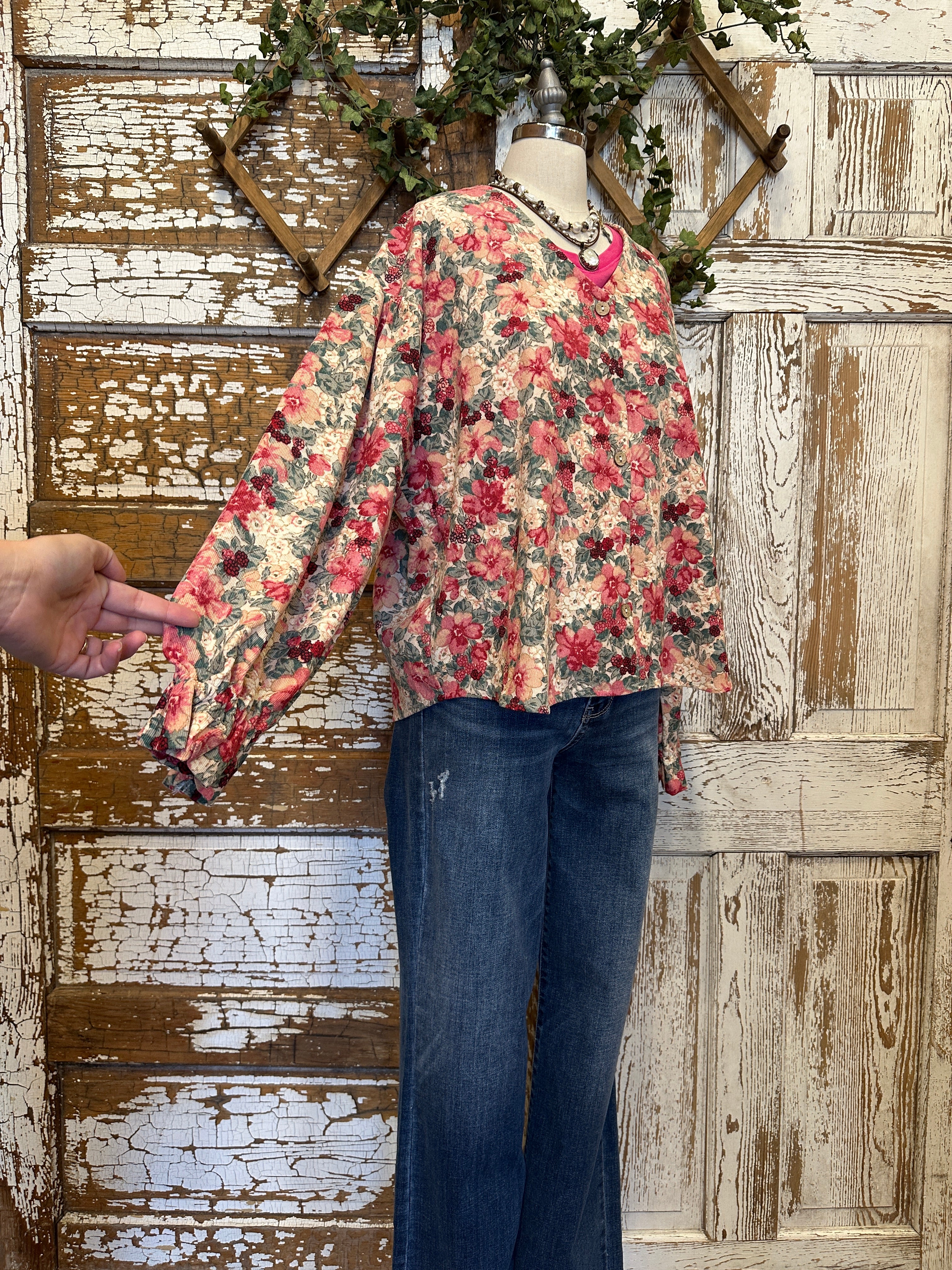 Soft, feminine, and full of charm, this Shirley raspberry floral corduroy button front top features vintage-inspired blooms with romantic tones of red and cream. Paired with handmade necklaces, it’s the perfect boutique top or cardigan