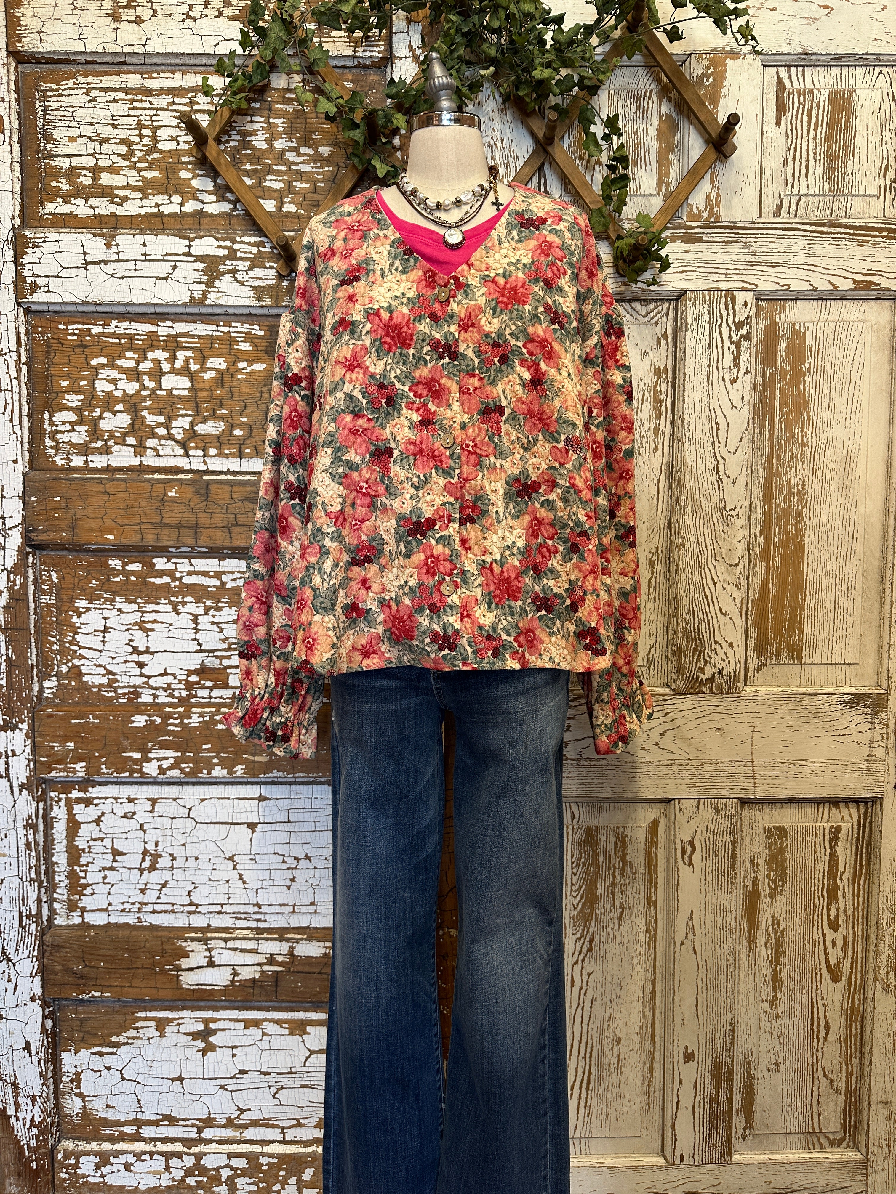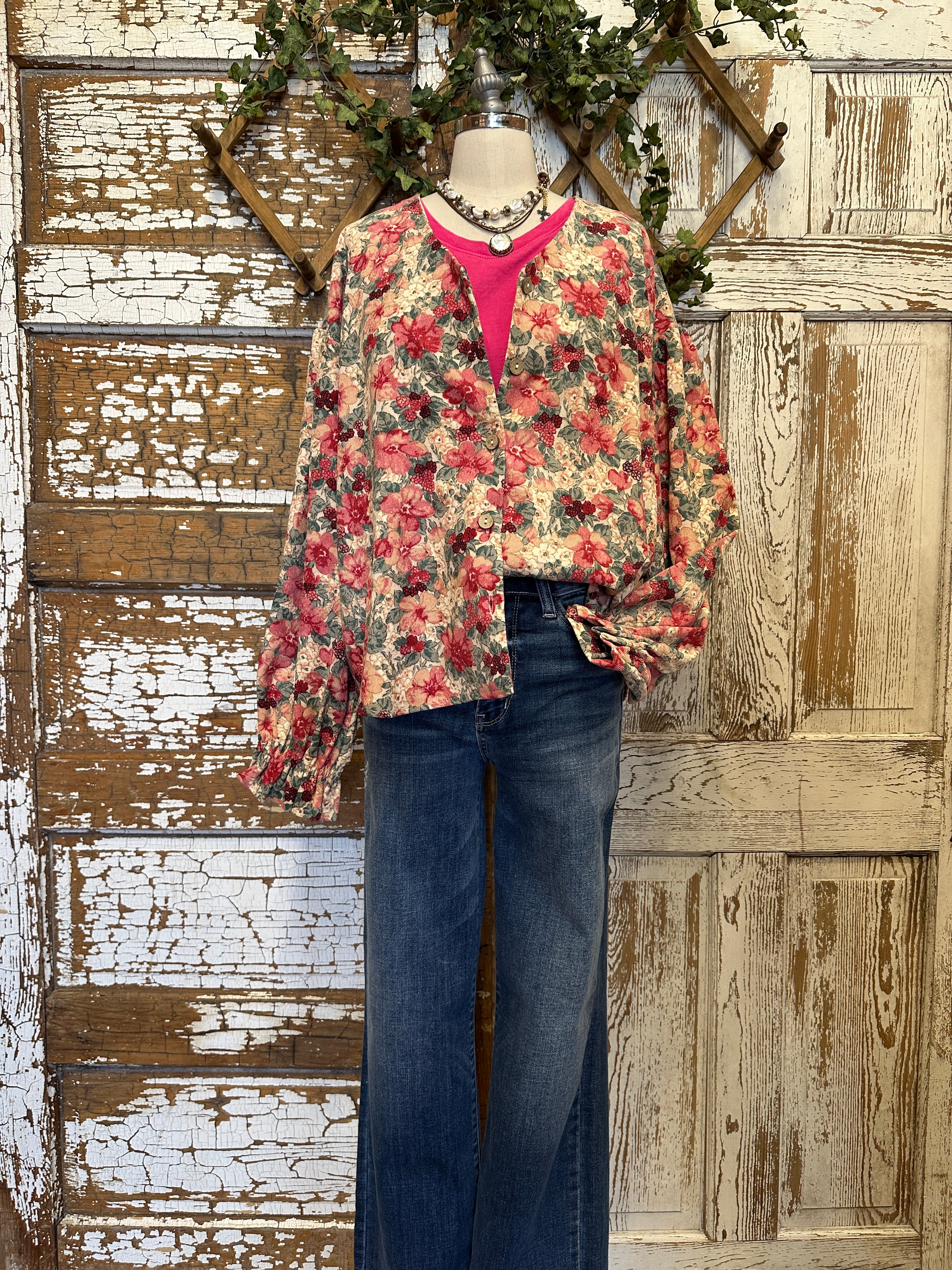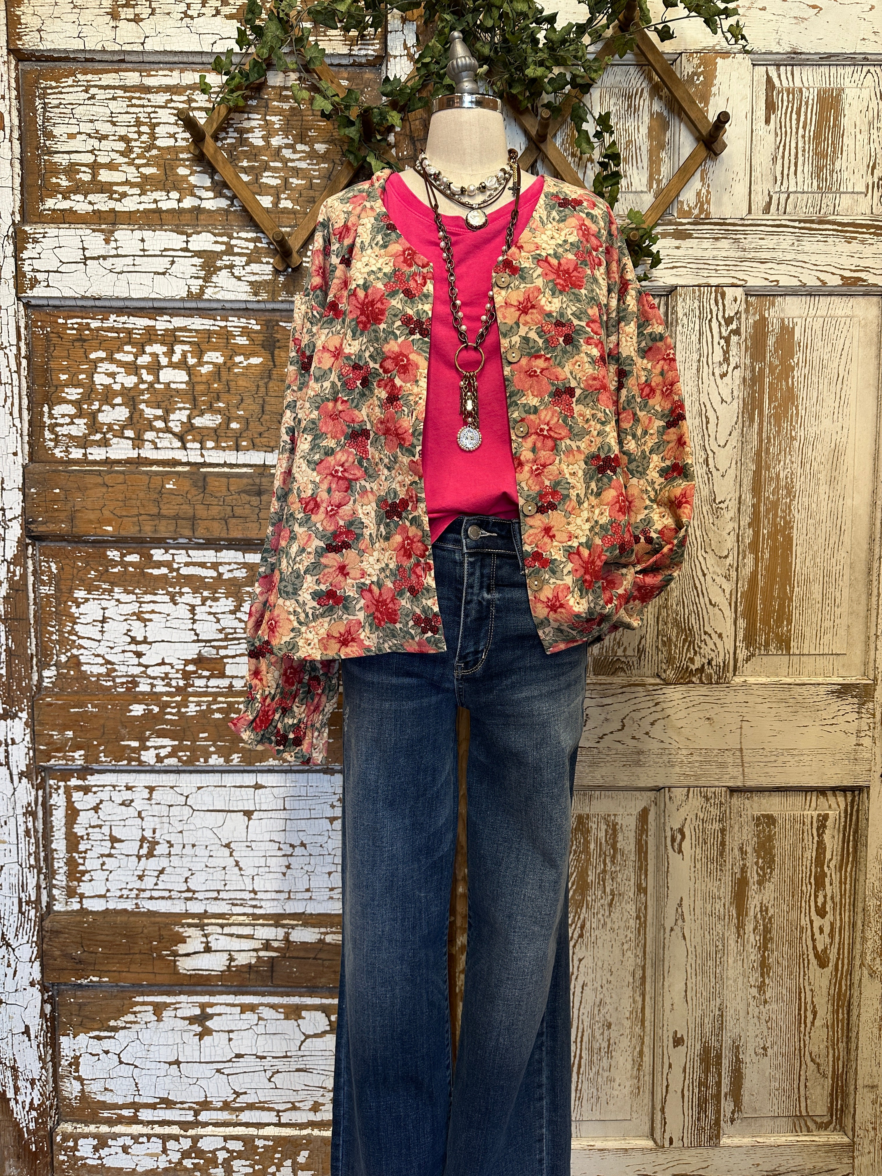 Soft, feminine, and full of charm, this Shirley raspberry floral corduroy button front top features vintage-inspired blooms with romantic tones of red and cream. Paired with handmade necklaces, it’s the perfect boutique top or cardigan