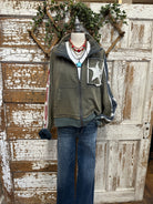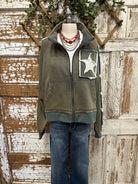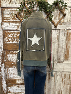 Add a little edge (and a lot of style) to your casual days with this Star Patched Olive Zip Jacket!