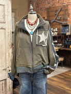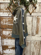 This soft, mid-weight jacket features a washed olive hue that gives it a perfectly lived-in feel, with standout textured star appliqués on the front, back, and sleeves for that boutique, one-of-a-kind look.