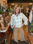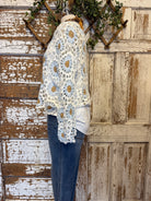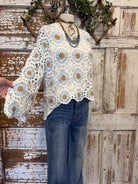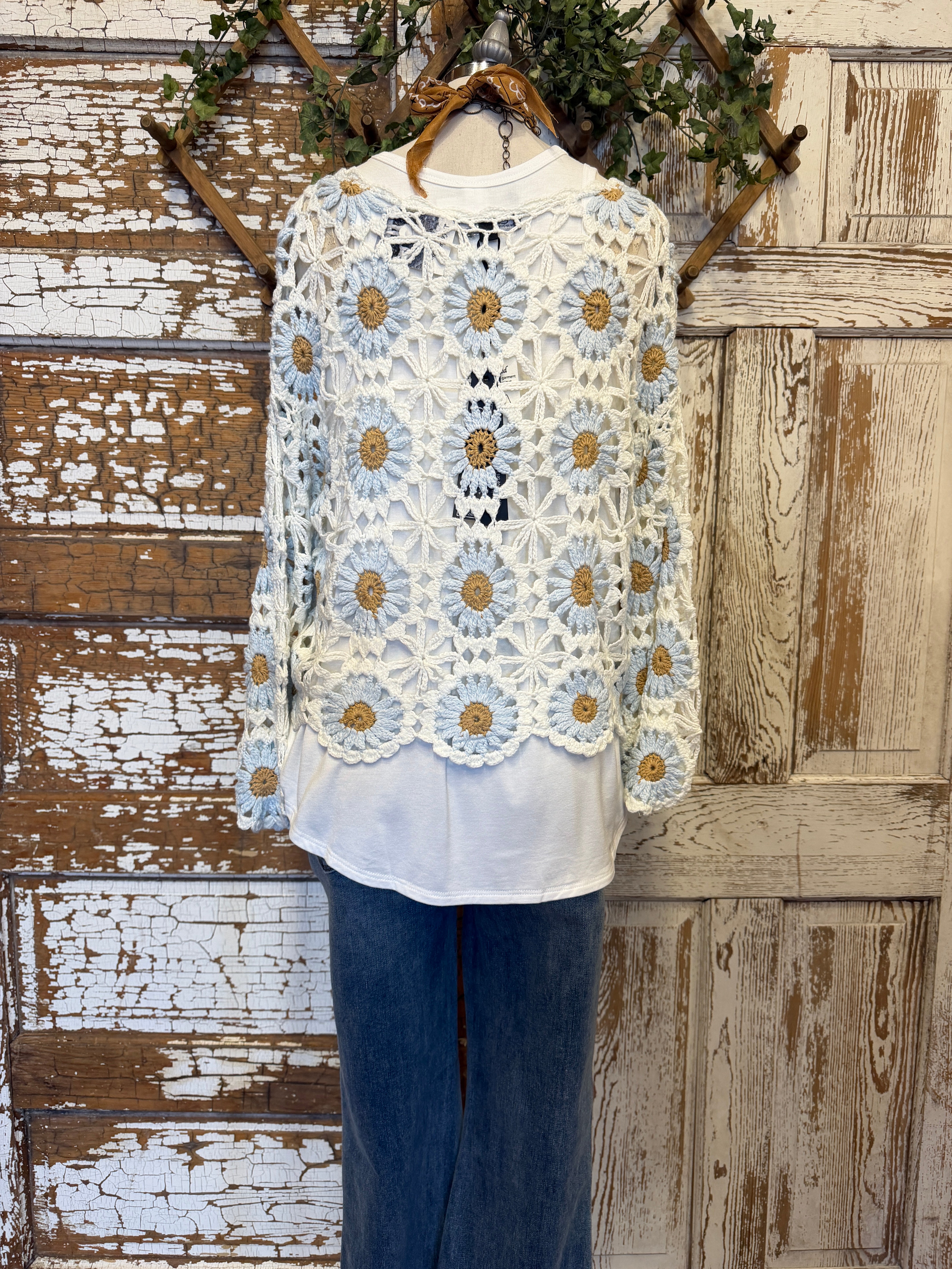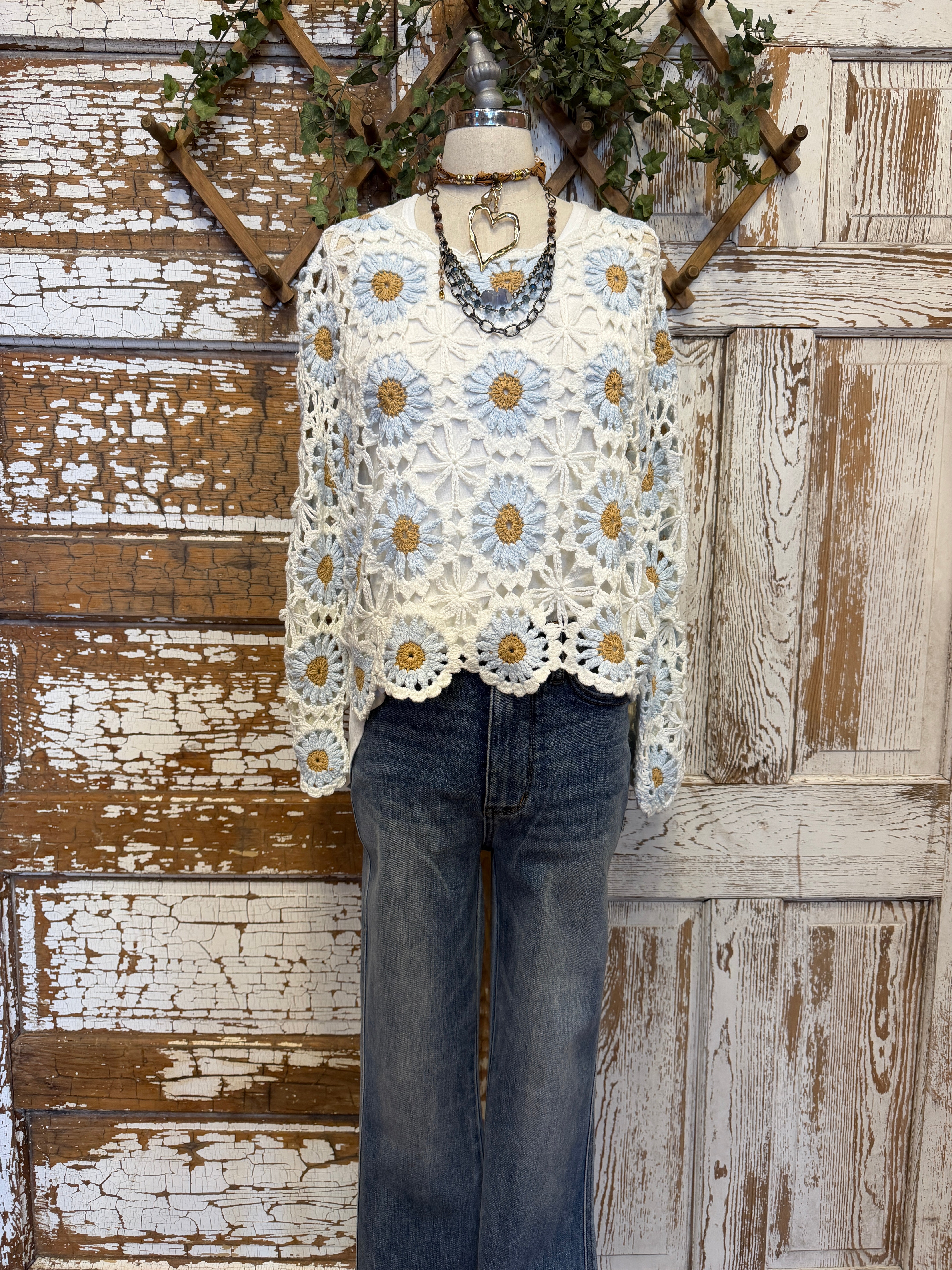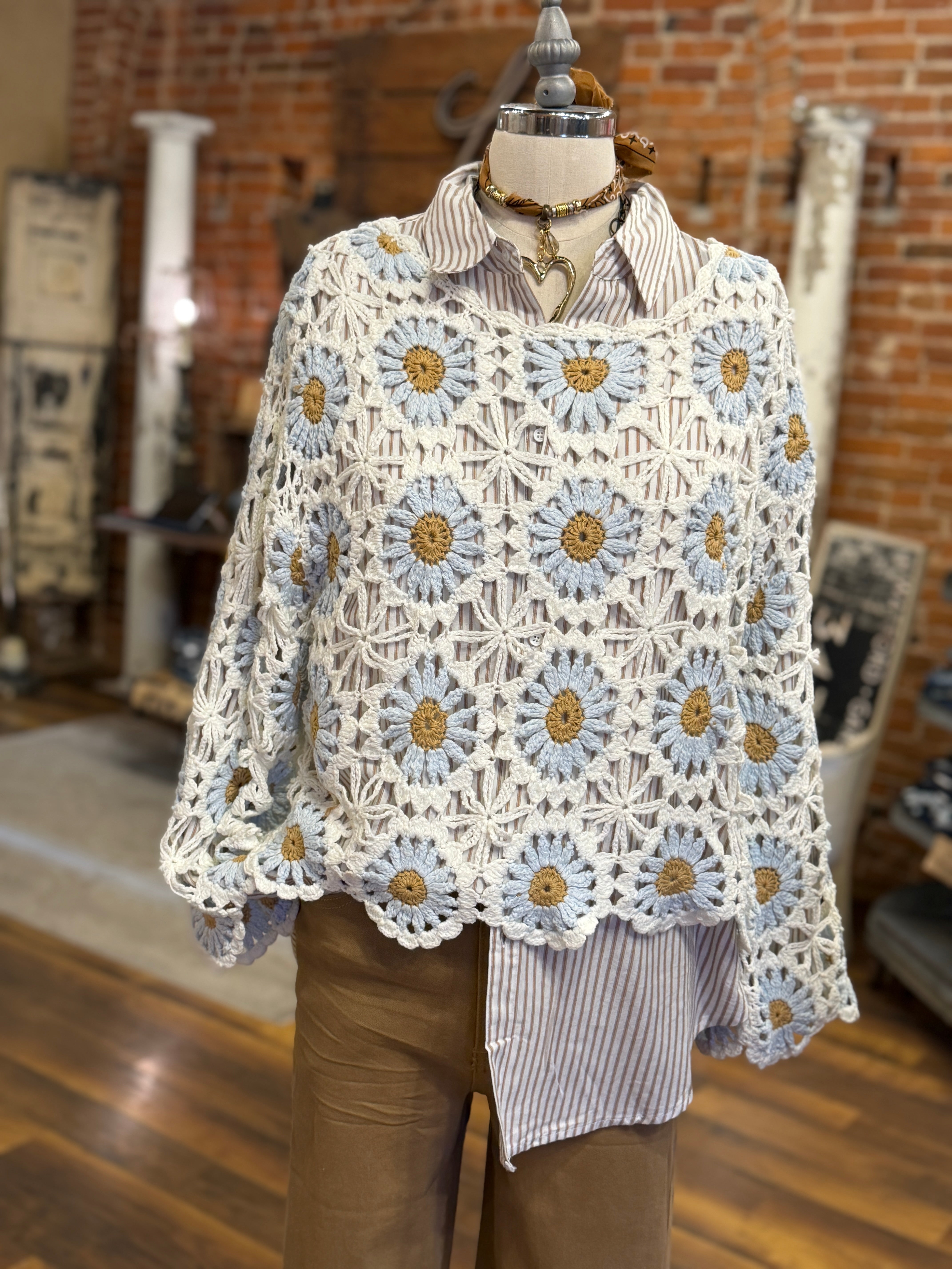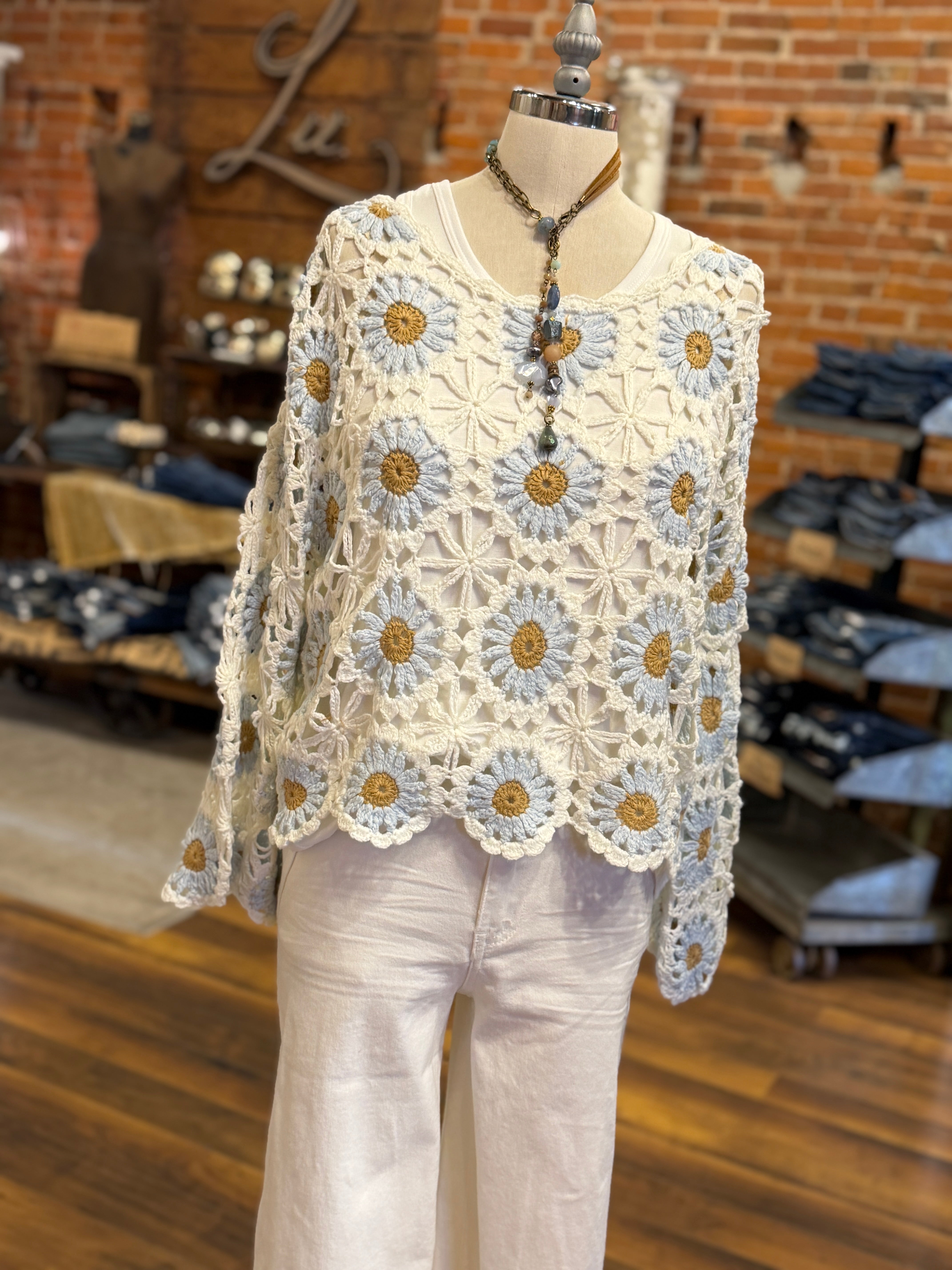 This is sunshine in sweater form. The dimensional crochet daisies in soft blue and warm honey tones give it that handcrafted, heirloom feel while the relaxed silhouette keeps it modern.