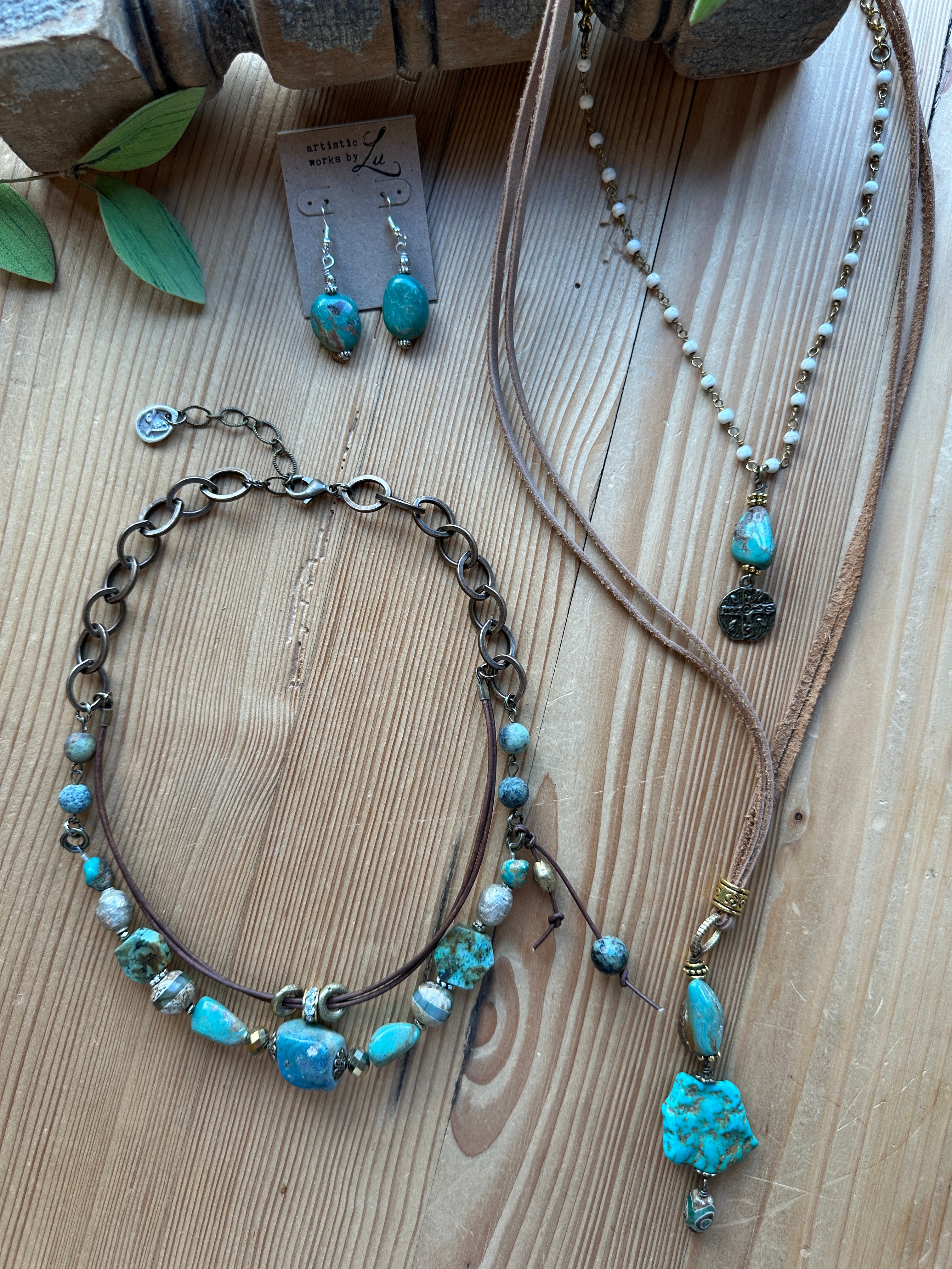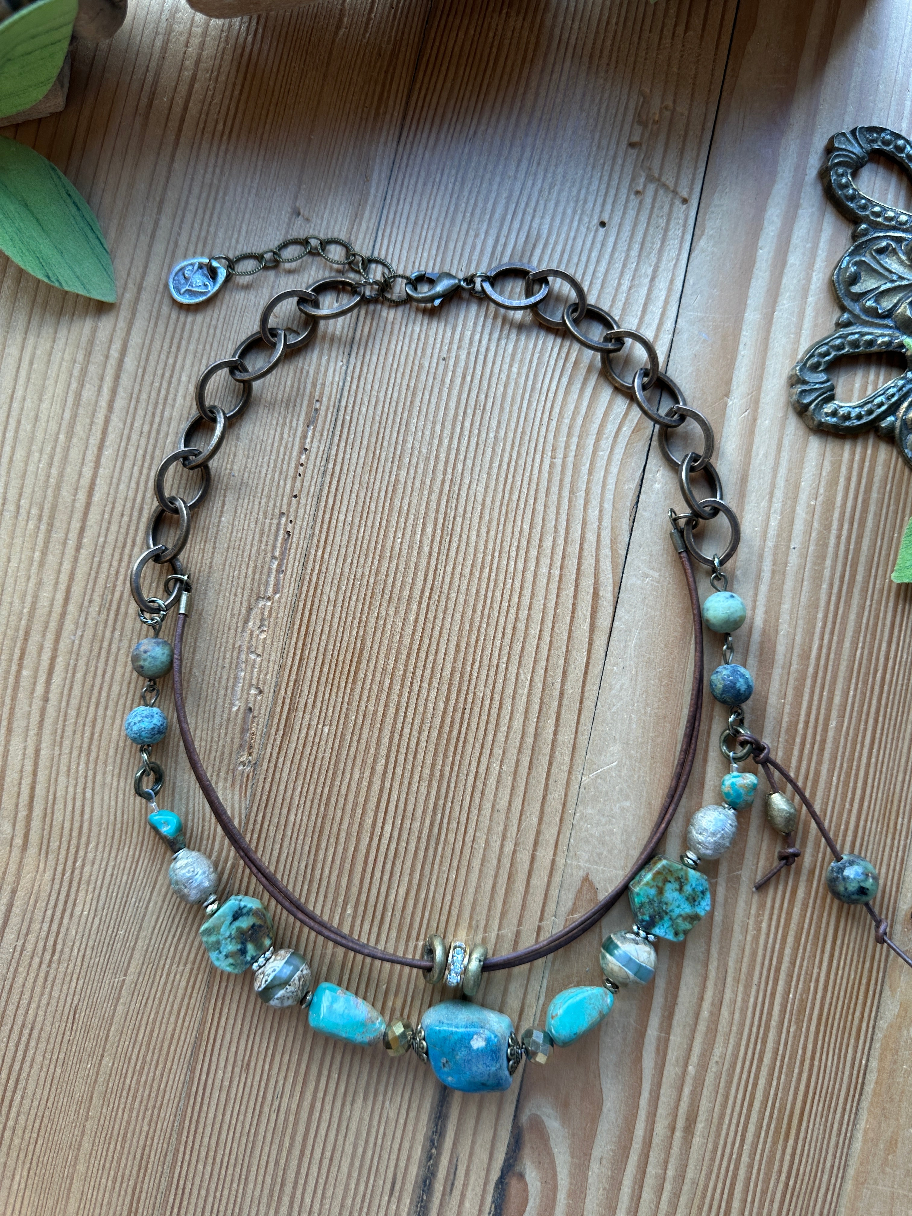 Each necklace is a testament to artisanal craftsmanship, showcasing a thoughtful arrangement of varying turquoise shades and textures alongside other natural stone beads. The dual-strand design, comprising a durable leather cord and a stylish linked chain, offers a beautiful interplay of materials and depths. The secure lobster clasp ensures comfortable wear, making this necklace as practical as it is stunning.