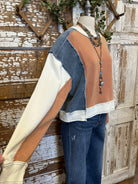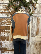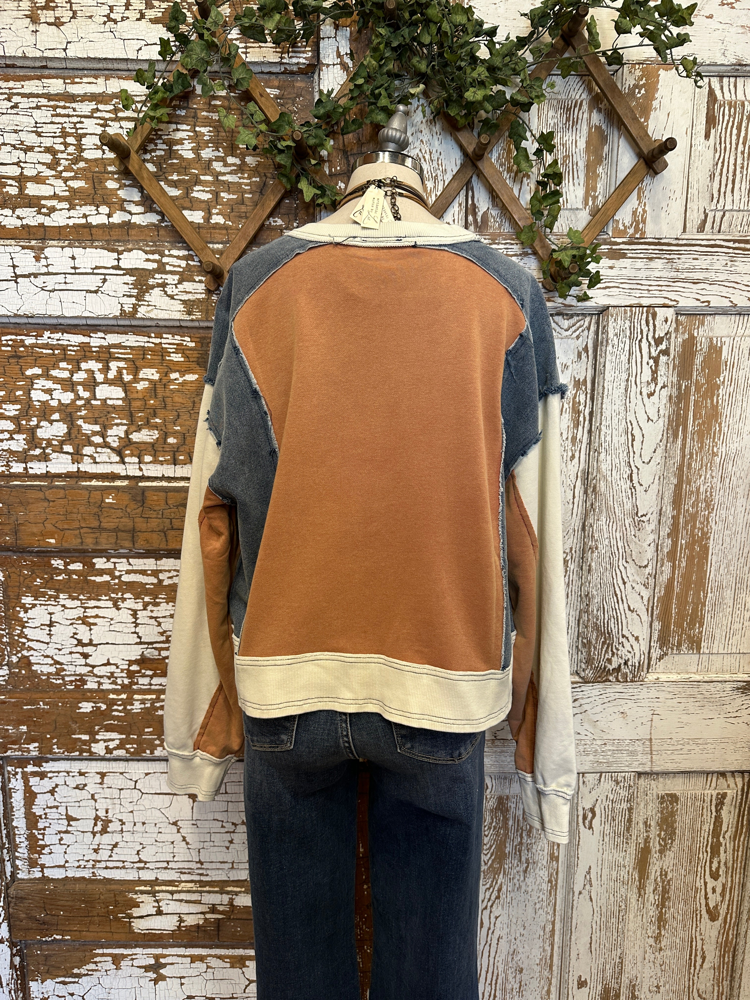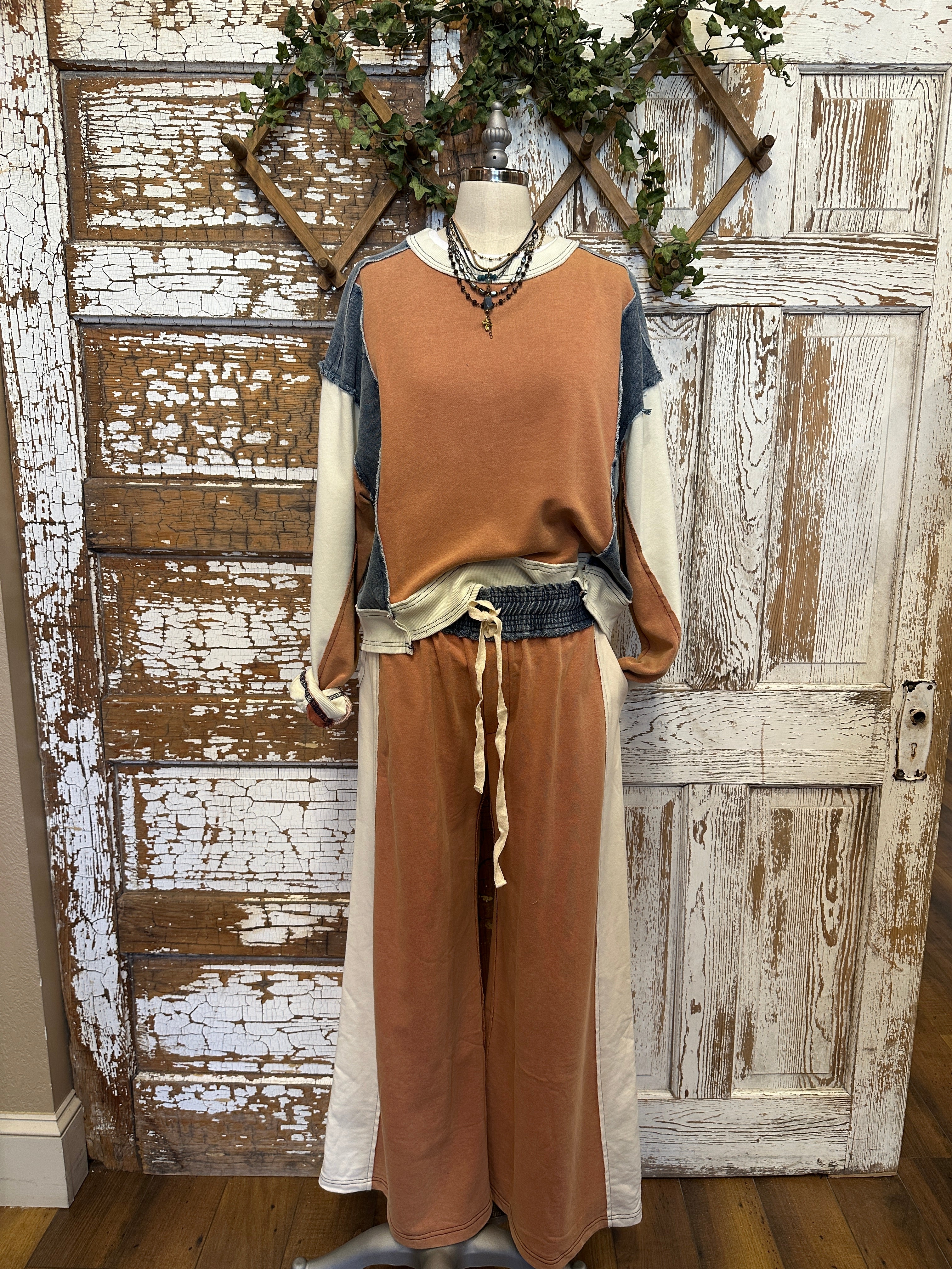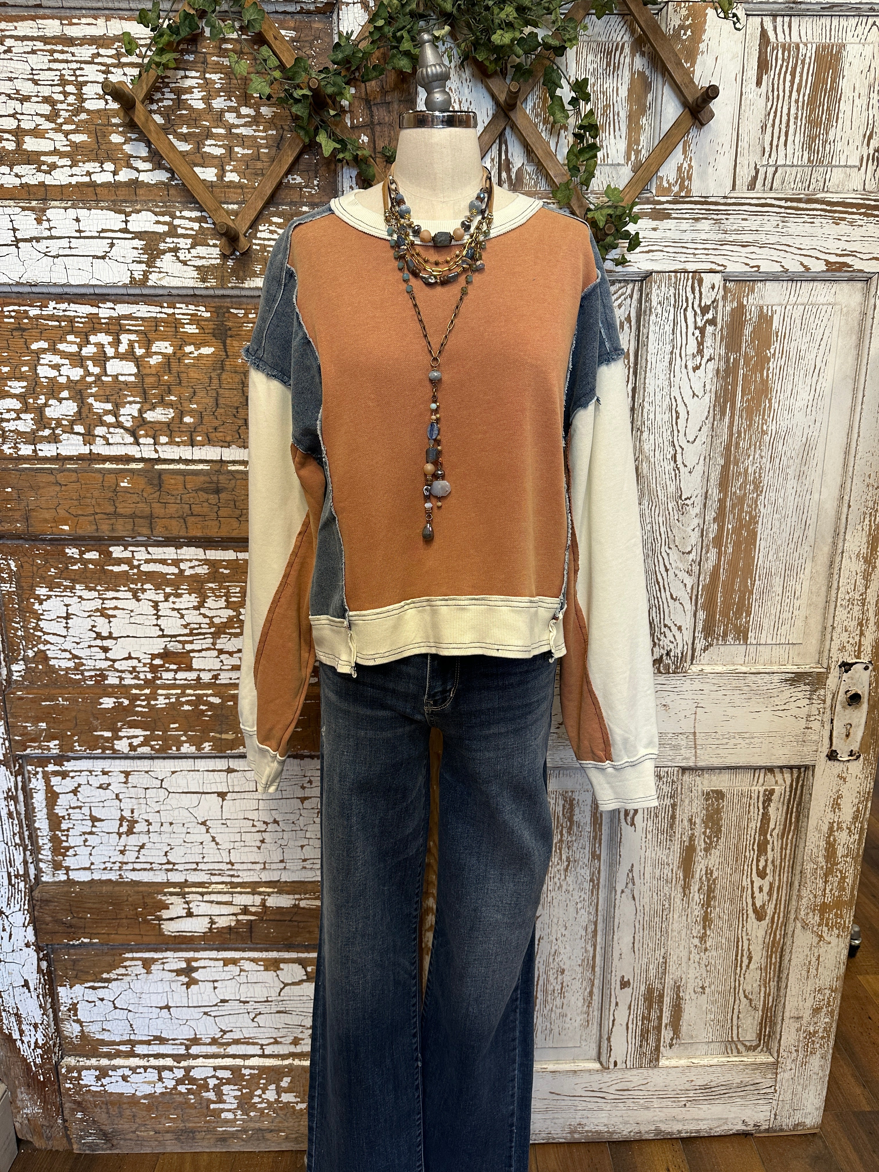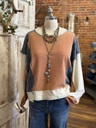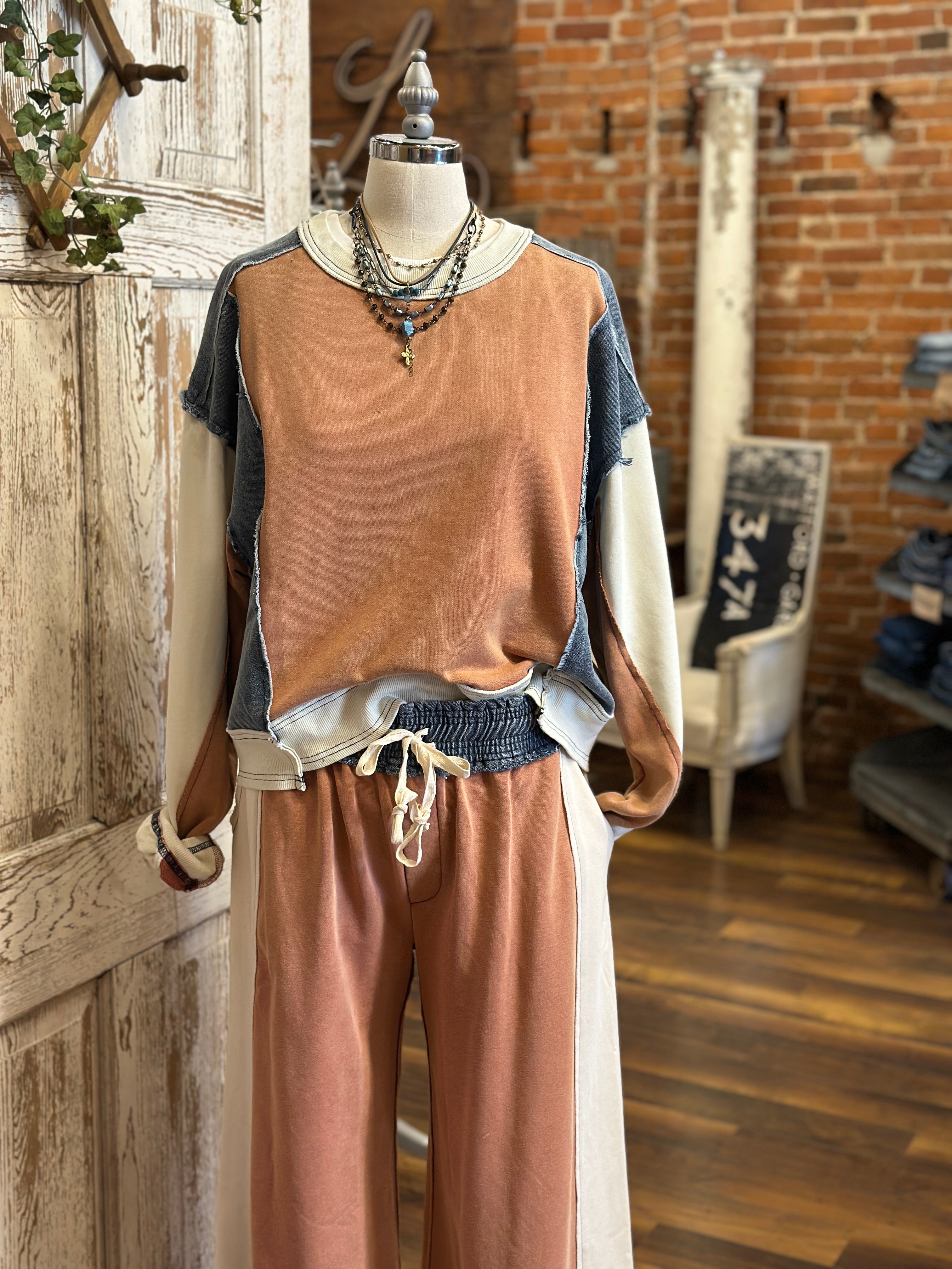 Turn heads with this Terracotta color block artistic sweatshirt featuring cream, denim, and terracotta panels for a modern boutique vibe. Paired with layered handmade necklaces from Artistic Works by Lu, this look perfectly blends cozy comfort with unique jewelry designs & matching pants!