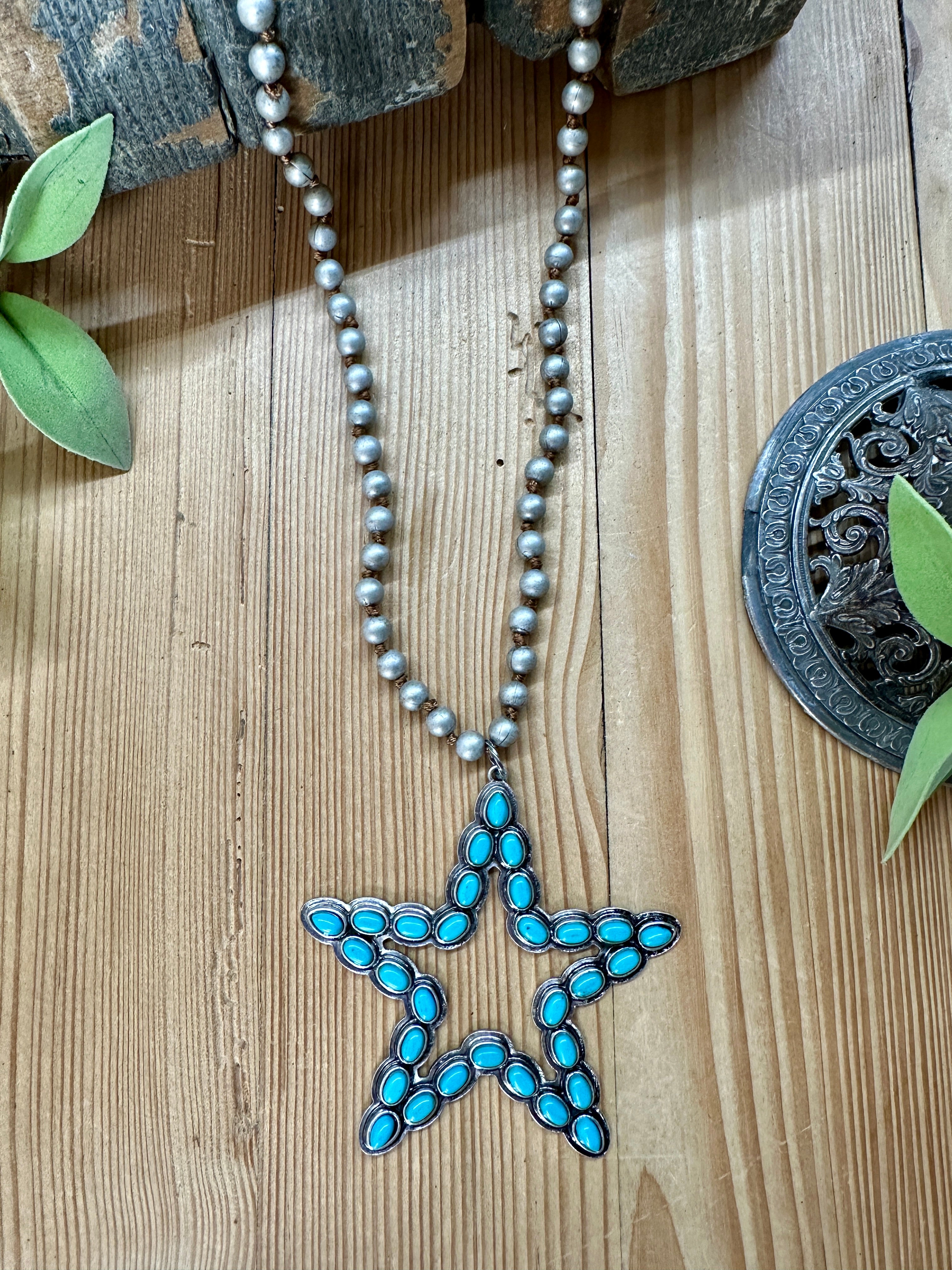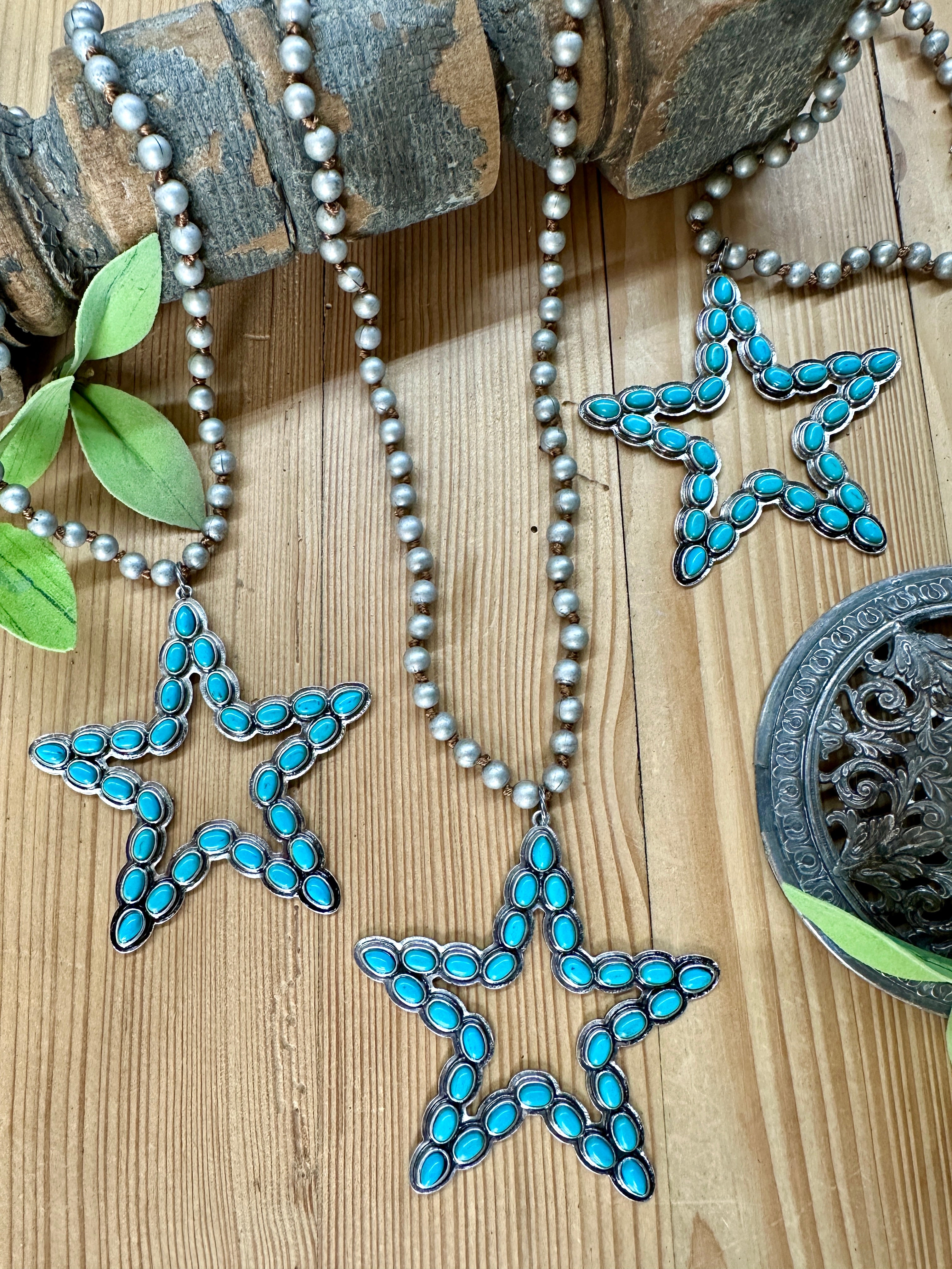 Add a pop of whimsy to your outfit with our Turquoise Star Necklace. The silver star pendant is adorned with vibrant turquoise colored beads, all on a knotted silver bead necklace. Perfect for those who love to stand out and embrace their playful side!
