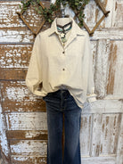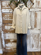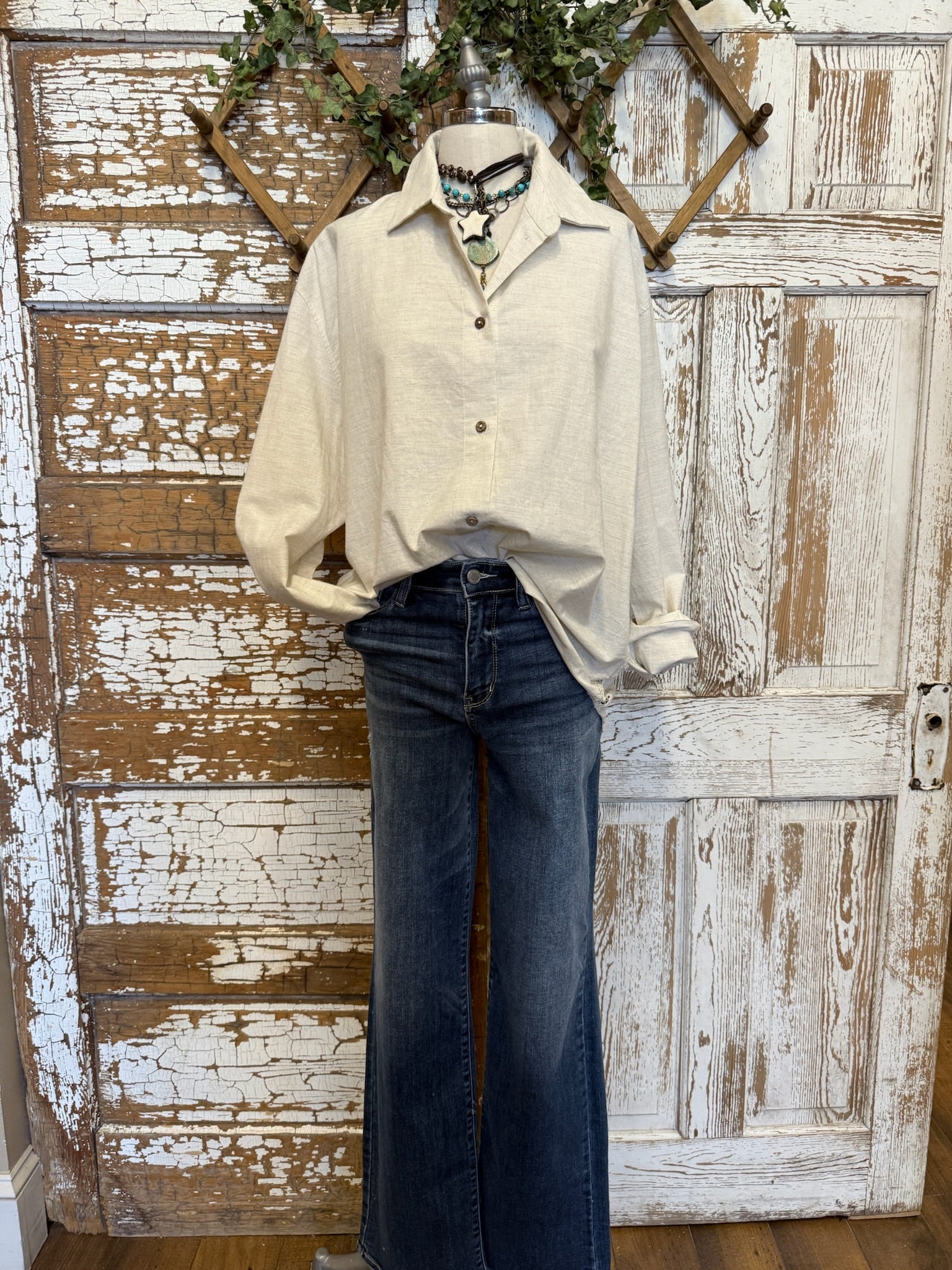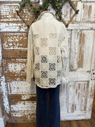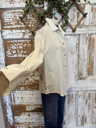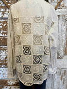 This elegant blouse features a refined button-down design crafted from 100% cotton with a linen-like texture for breathable comfort. Its standout detail is the intricate crochet panel on the back, adding a delicate, sophisticated touch. The high-low hemline enhances its graceful silhouette, making it a versatile piece for both casual and polished looks.