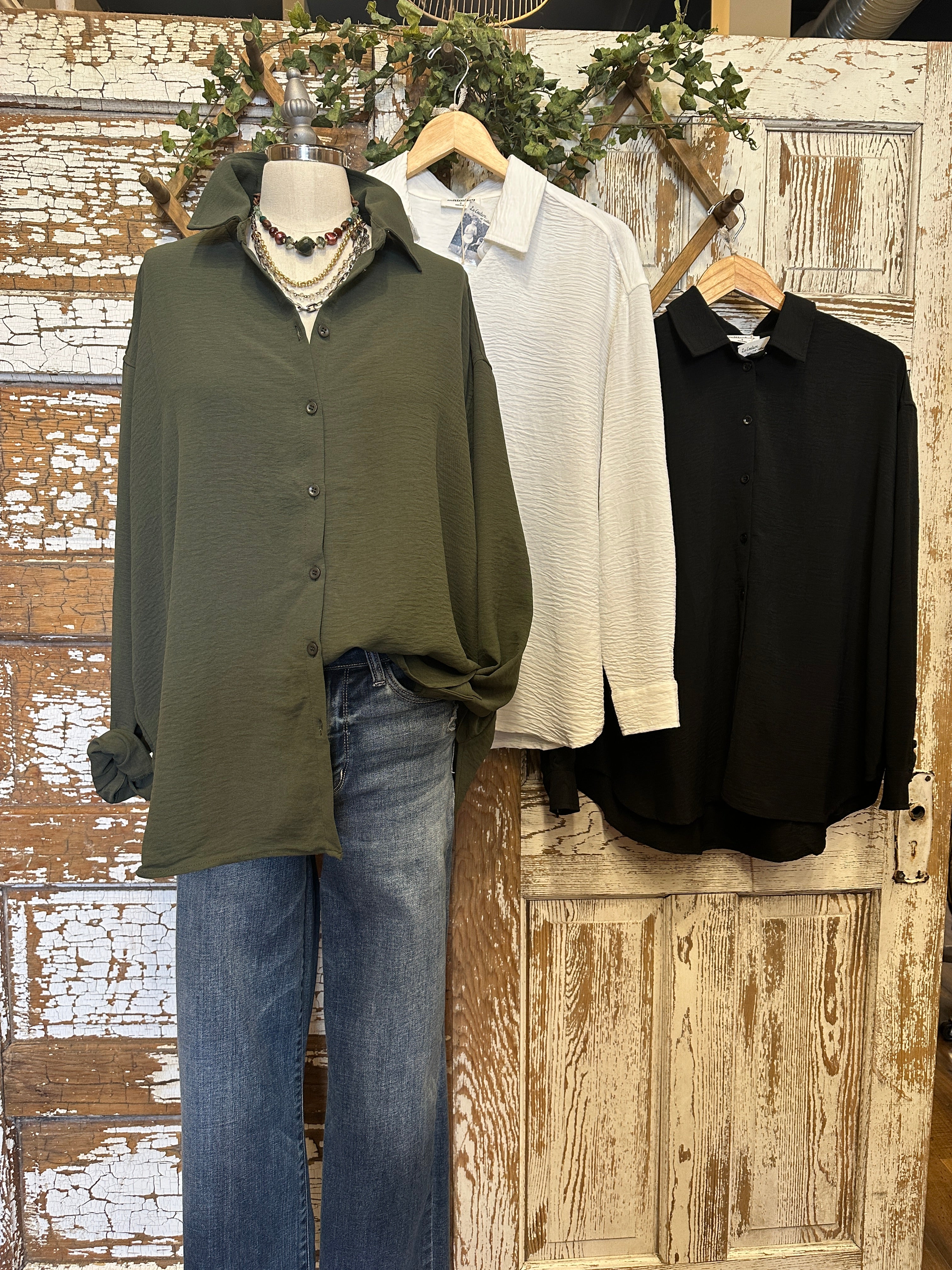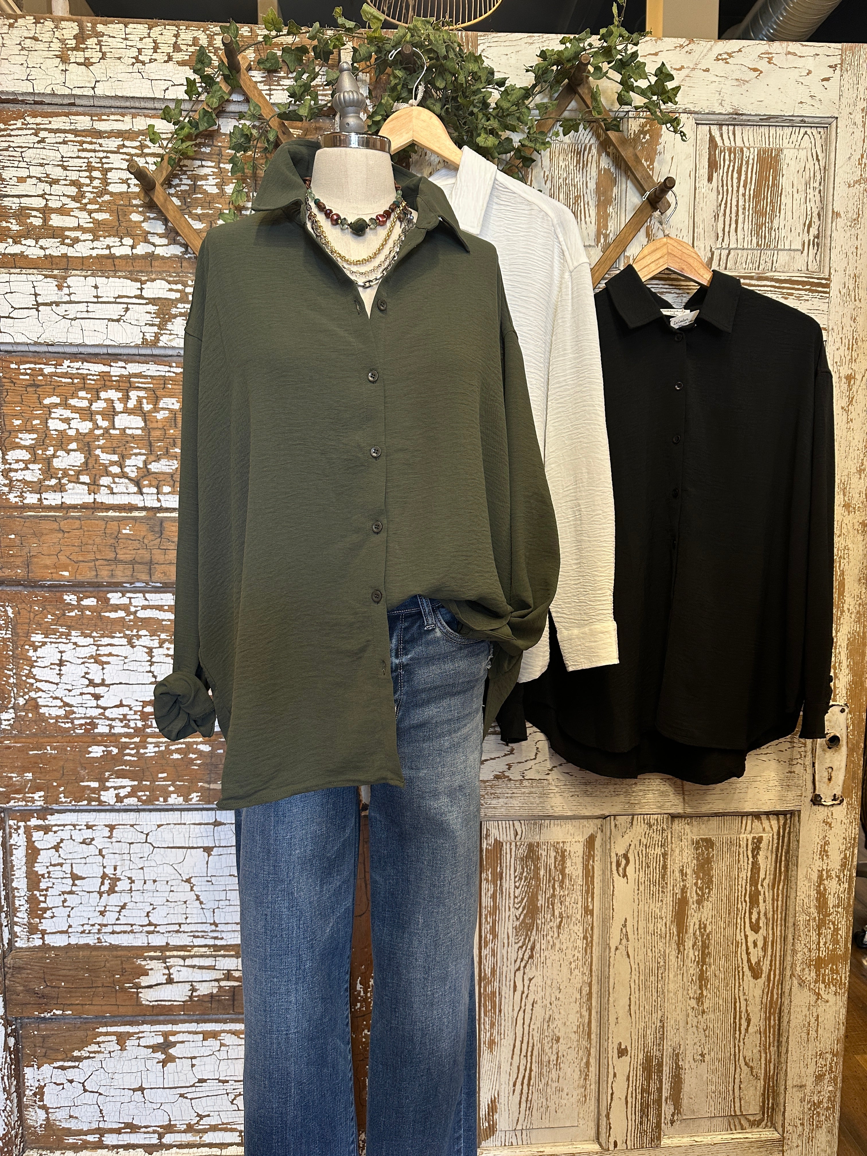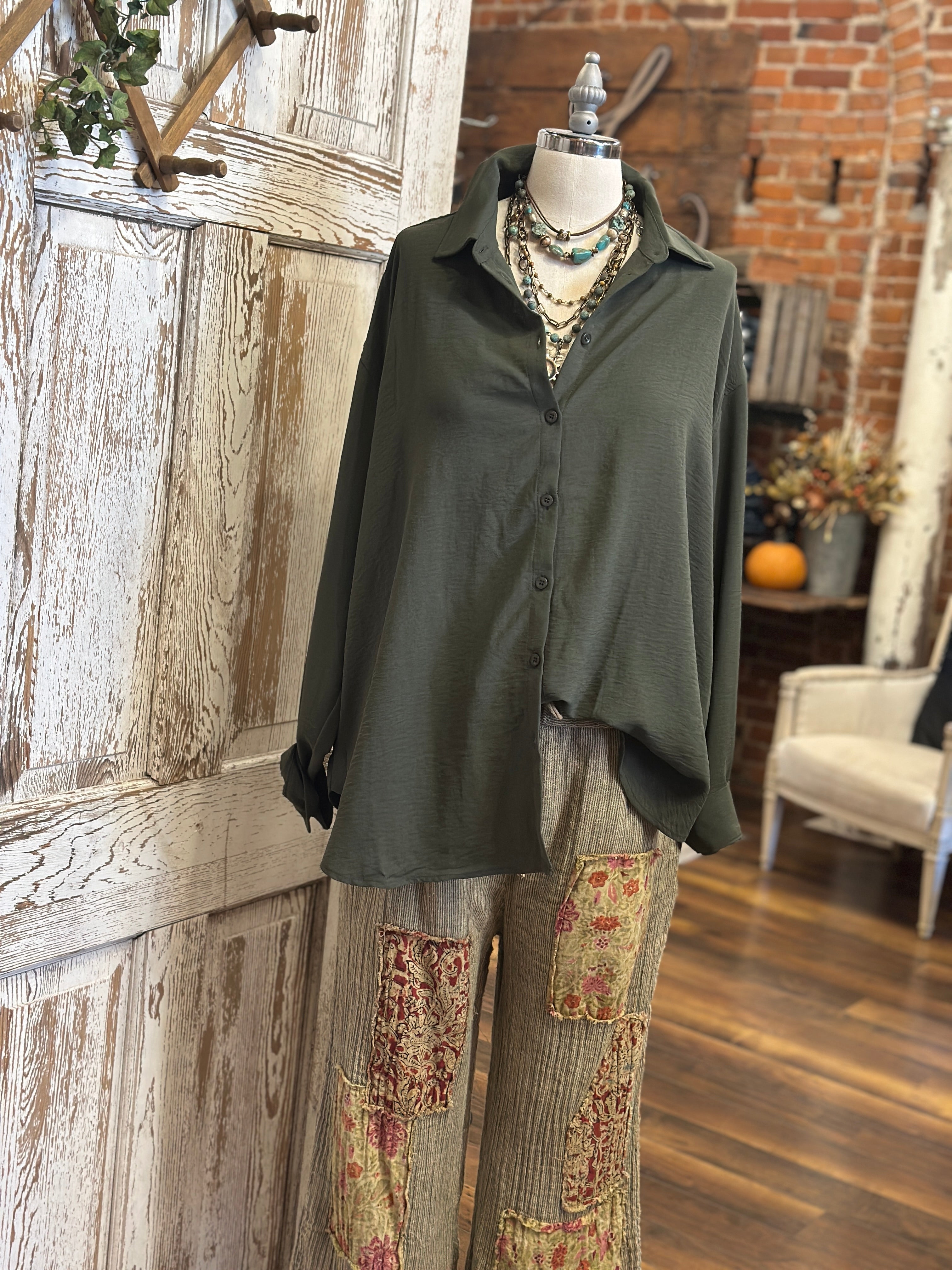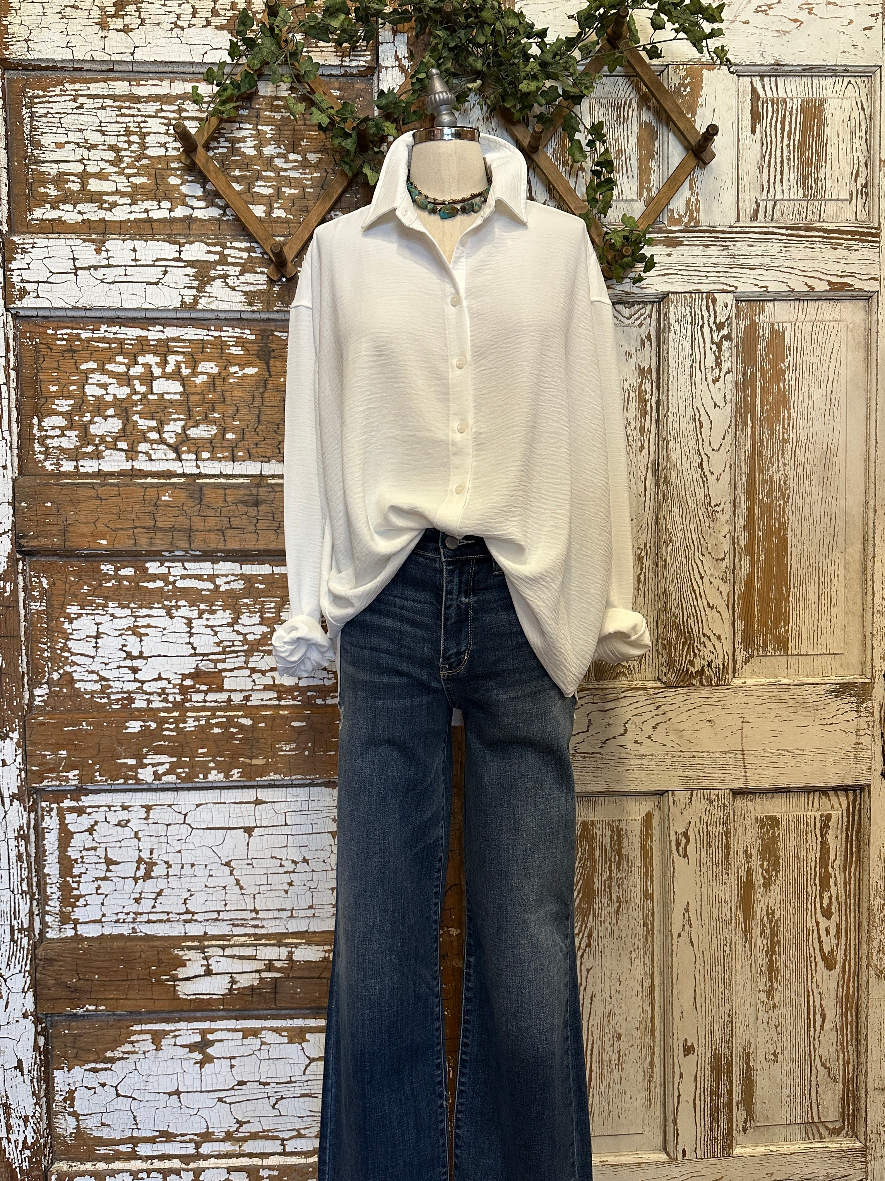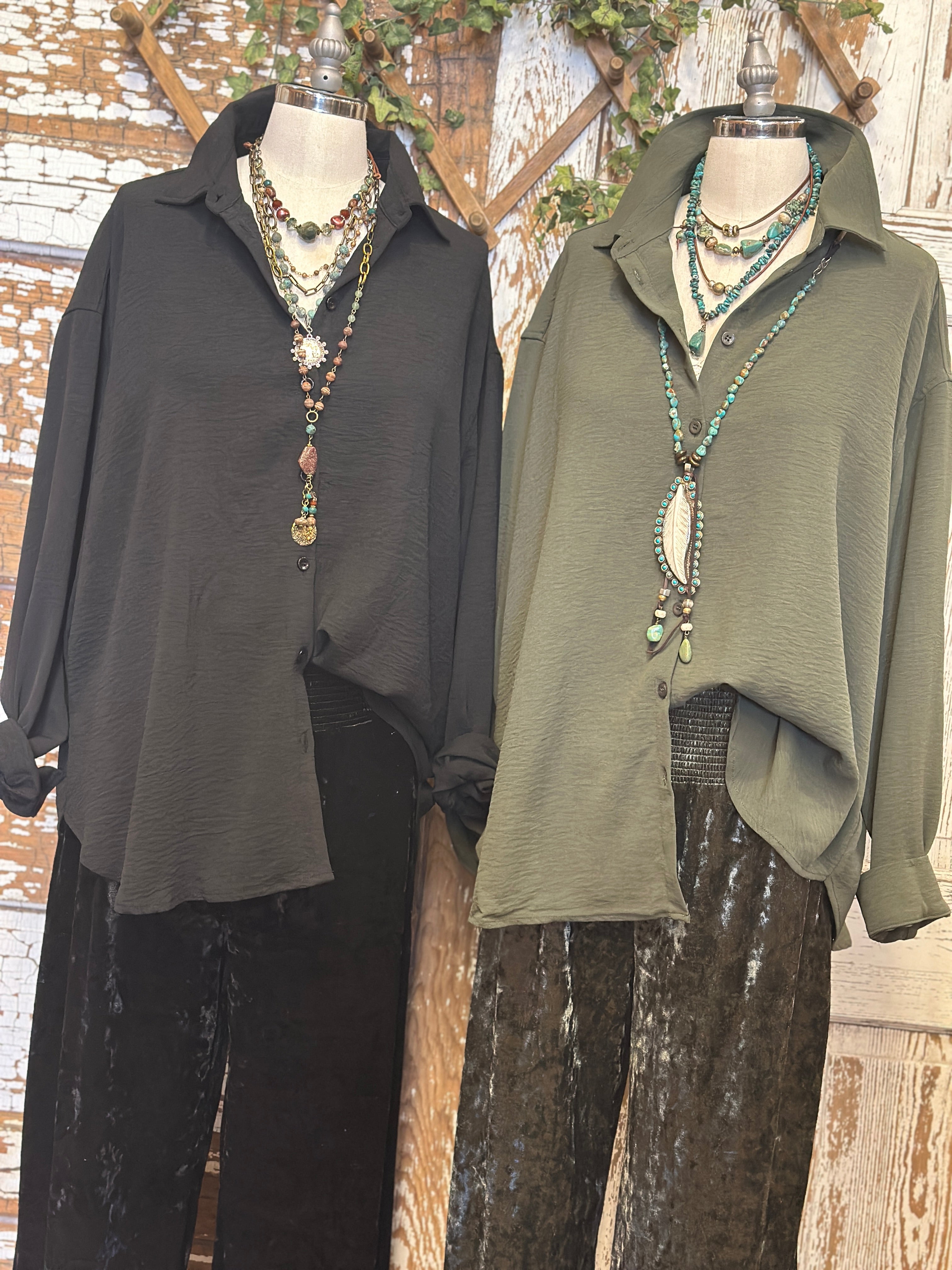 Timeless and versatile, this button-down blouse pairs perfectly with high-rise flare jeans or Lu Leisure for a look that blends effortless style with comfort. Finished with a statement handmade necklace and artisan jewelry, it’s the perfect foundation piece for endless outfits.