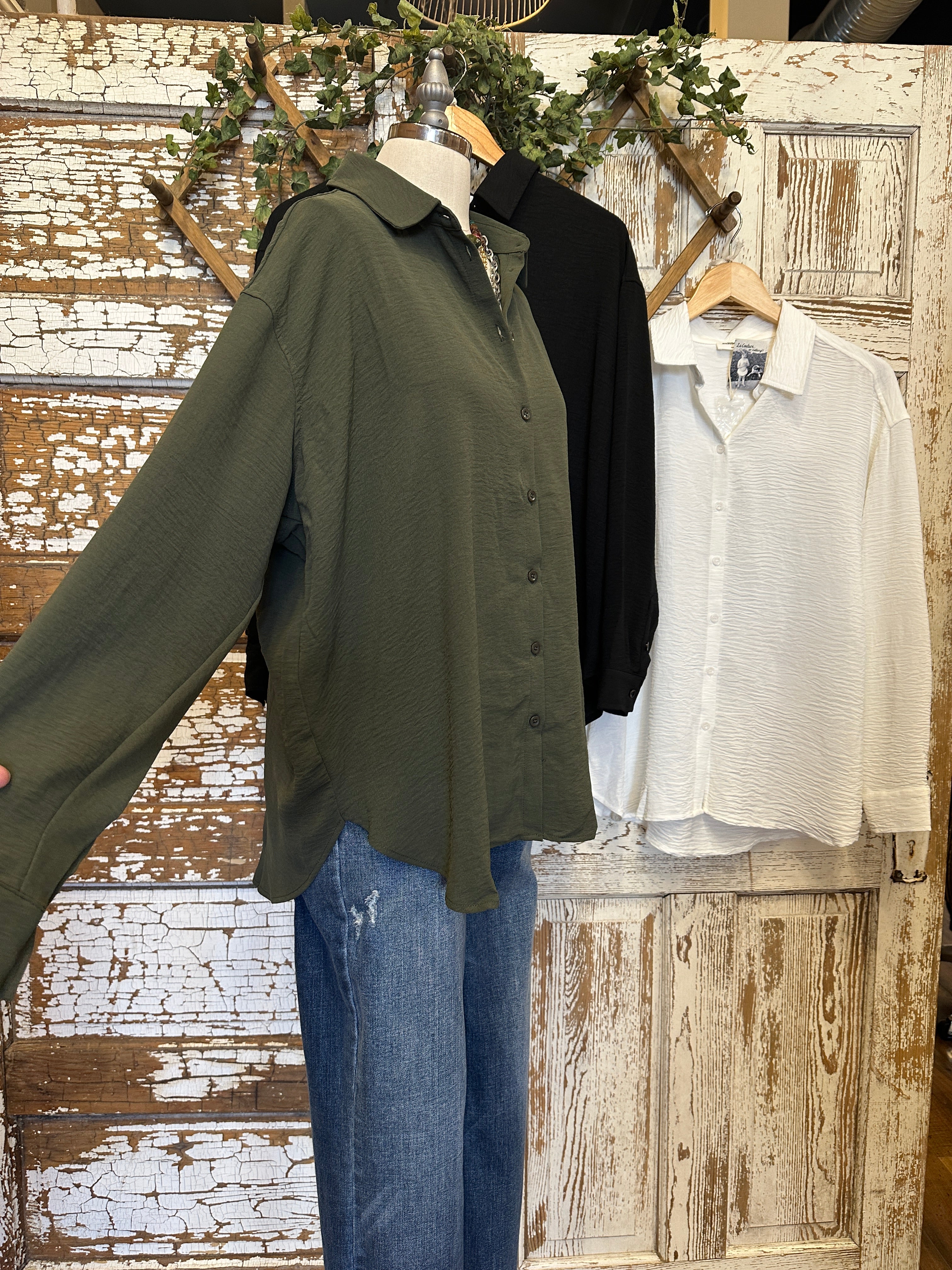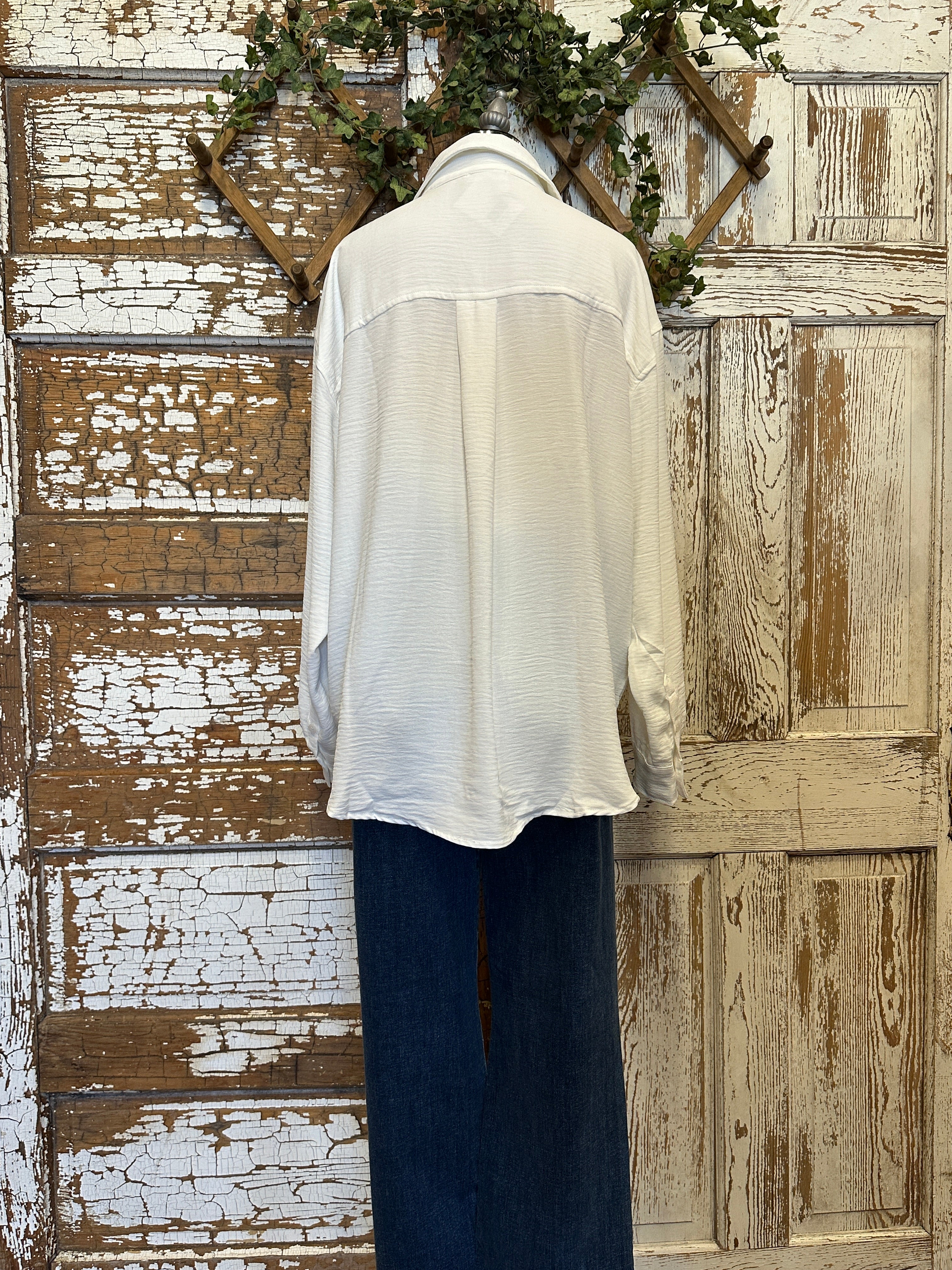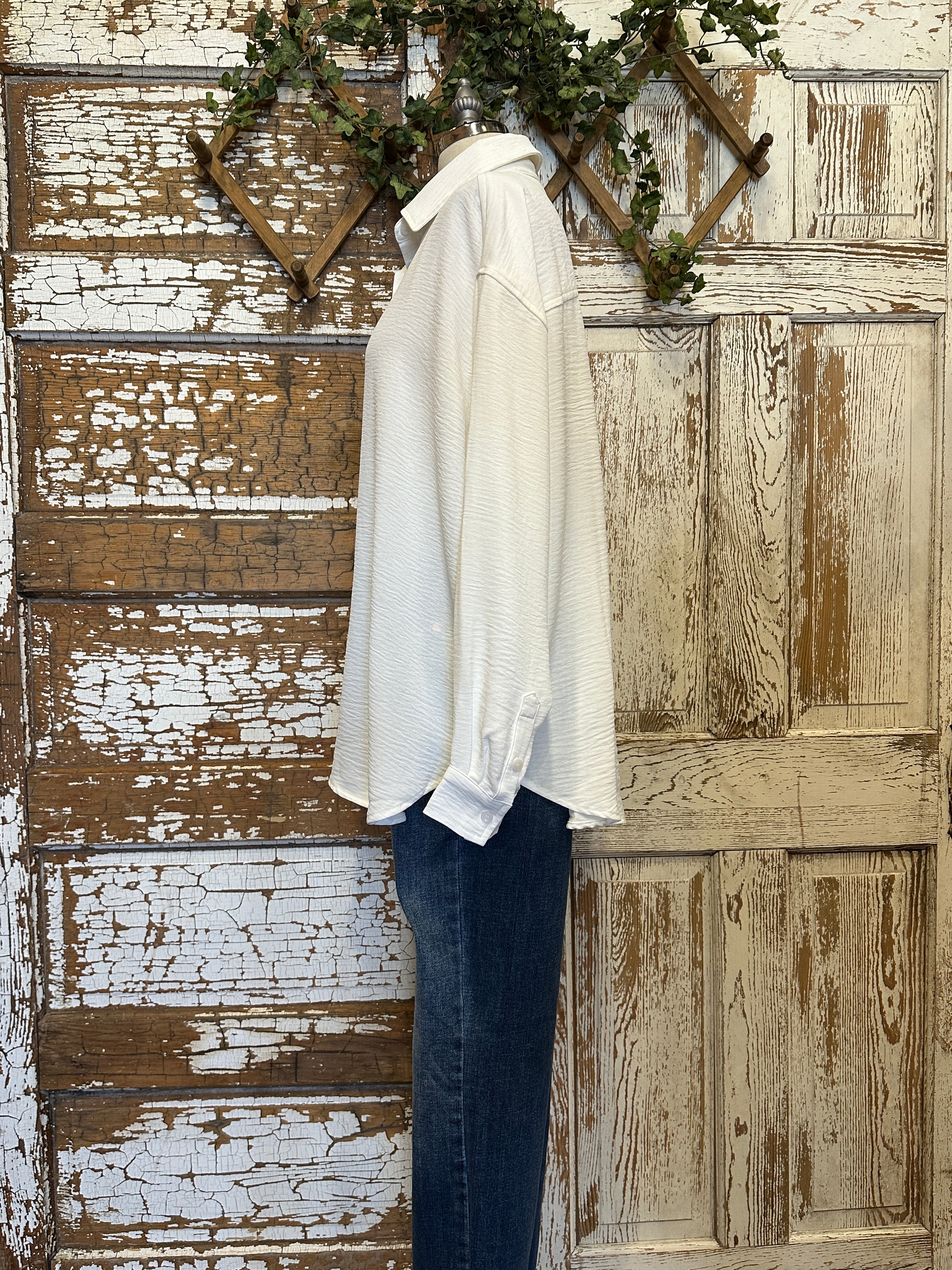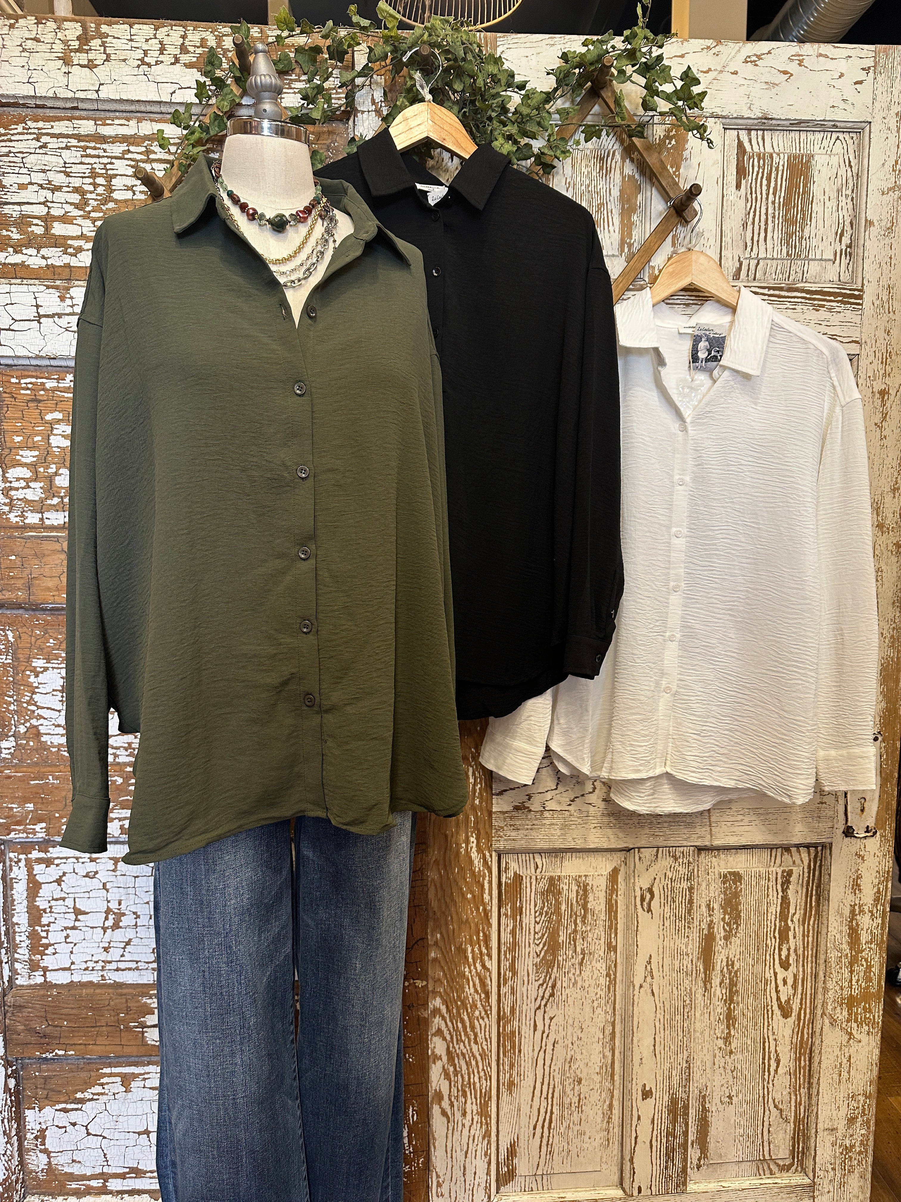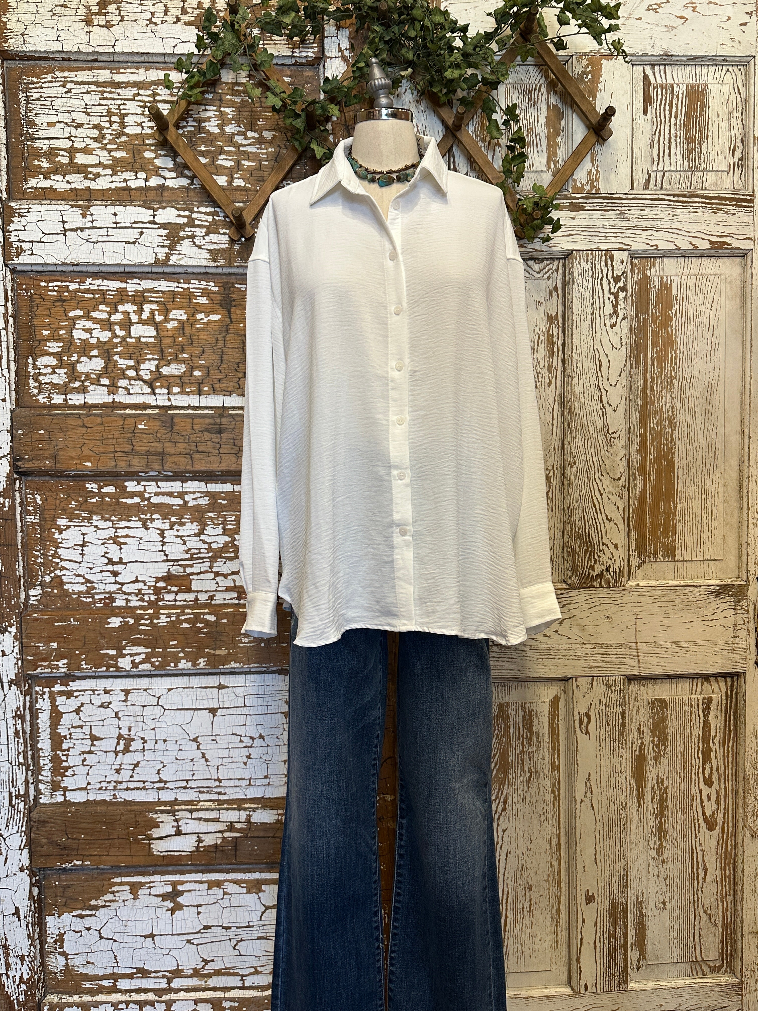 Timeless and versatile, this button-down blouse pairs perfectly with high-rise flare jeans or Lu Leisure for a look that blends effortless style with comfort. Finished with a statement handmade necklace and artisan jewelry, it’s the perfect foundation piece for endless outfits.