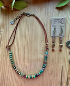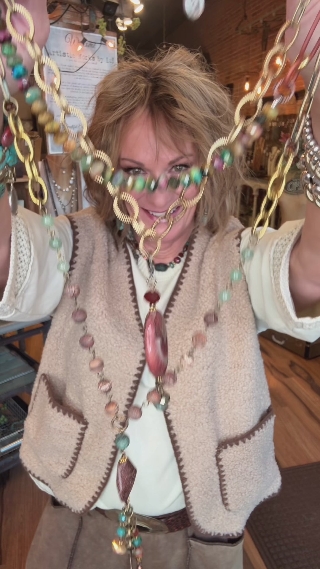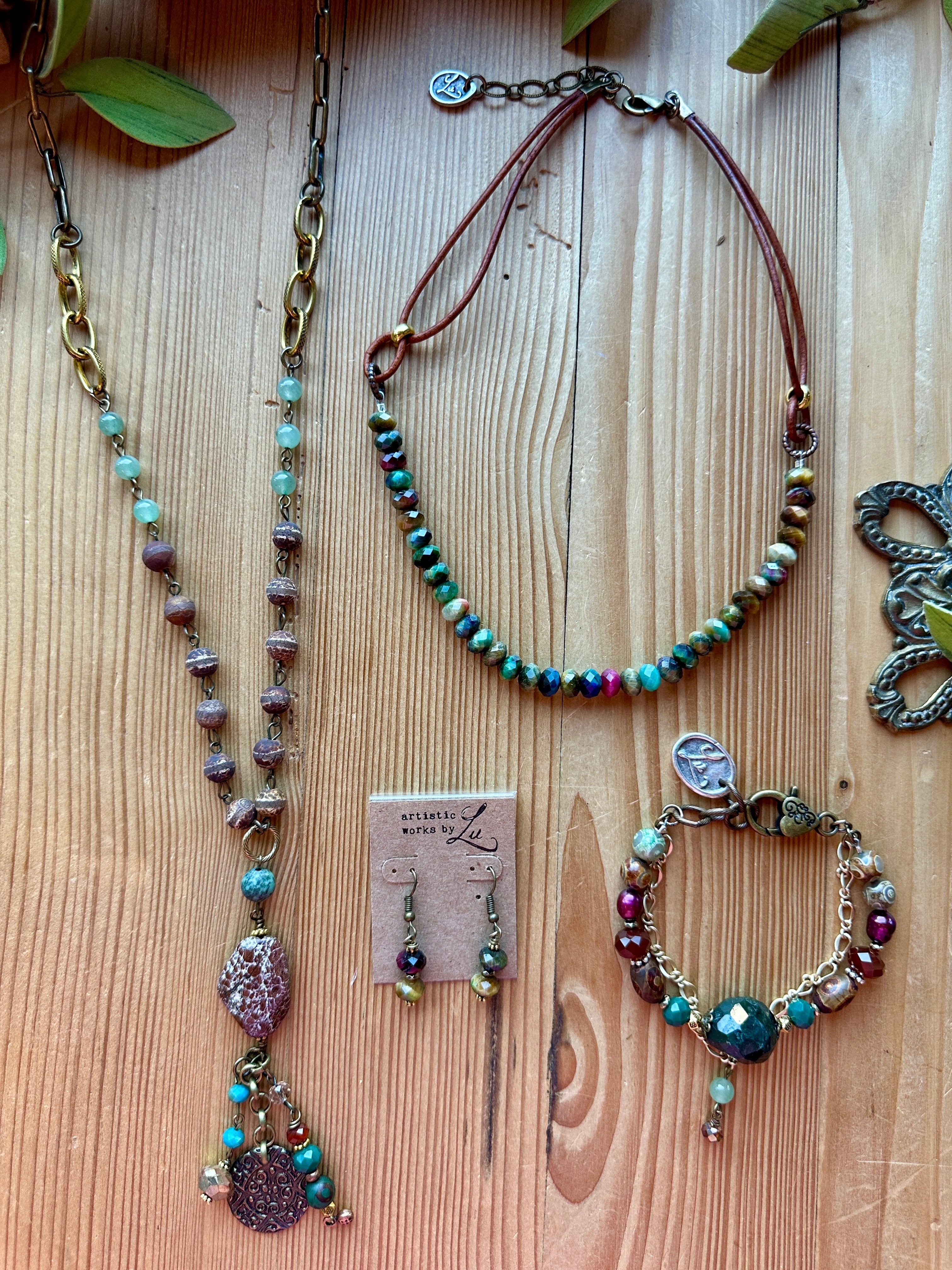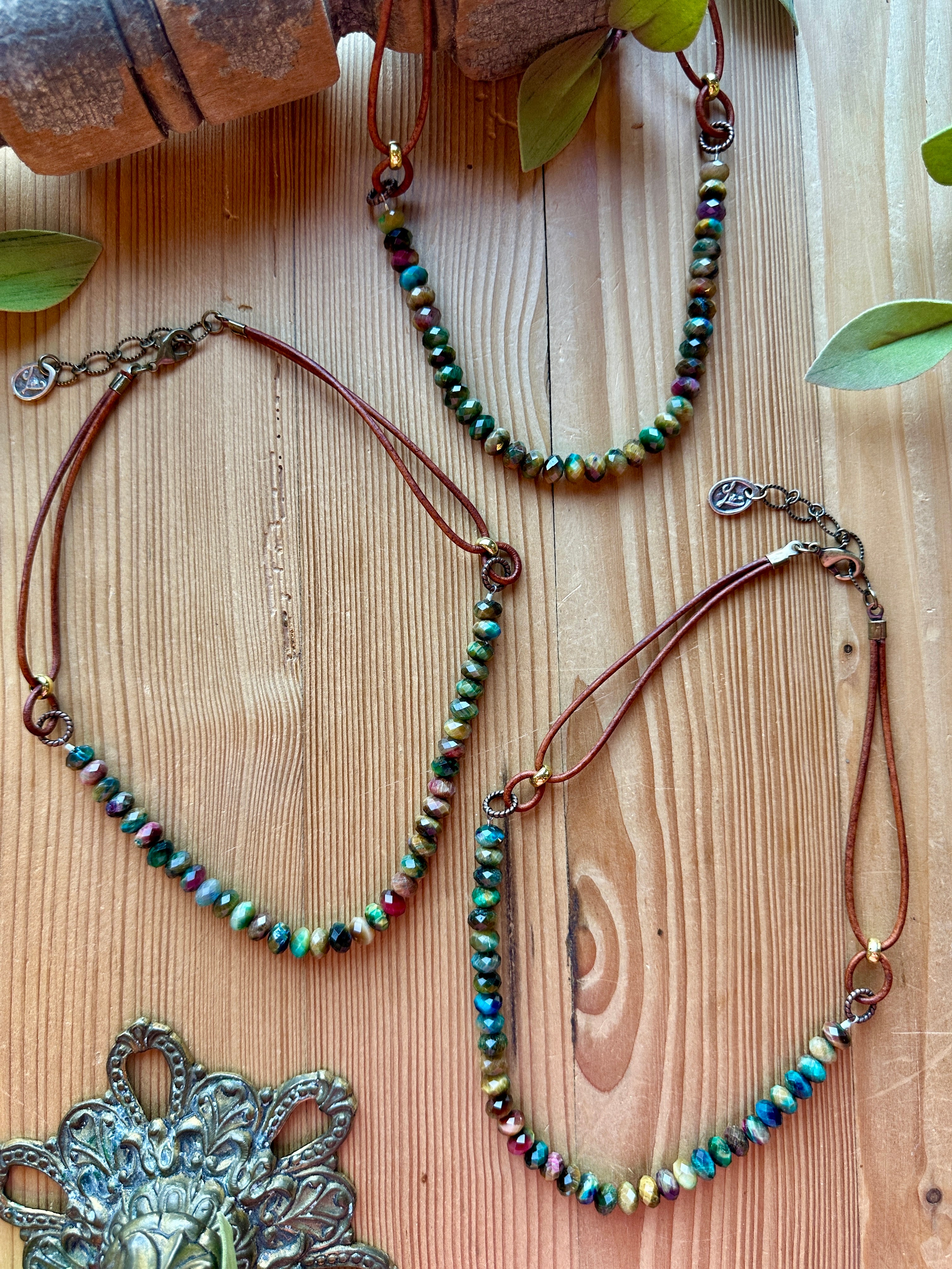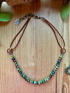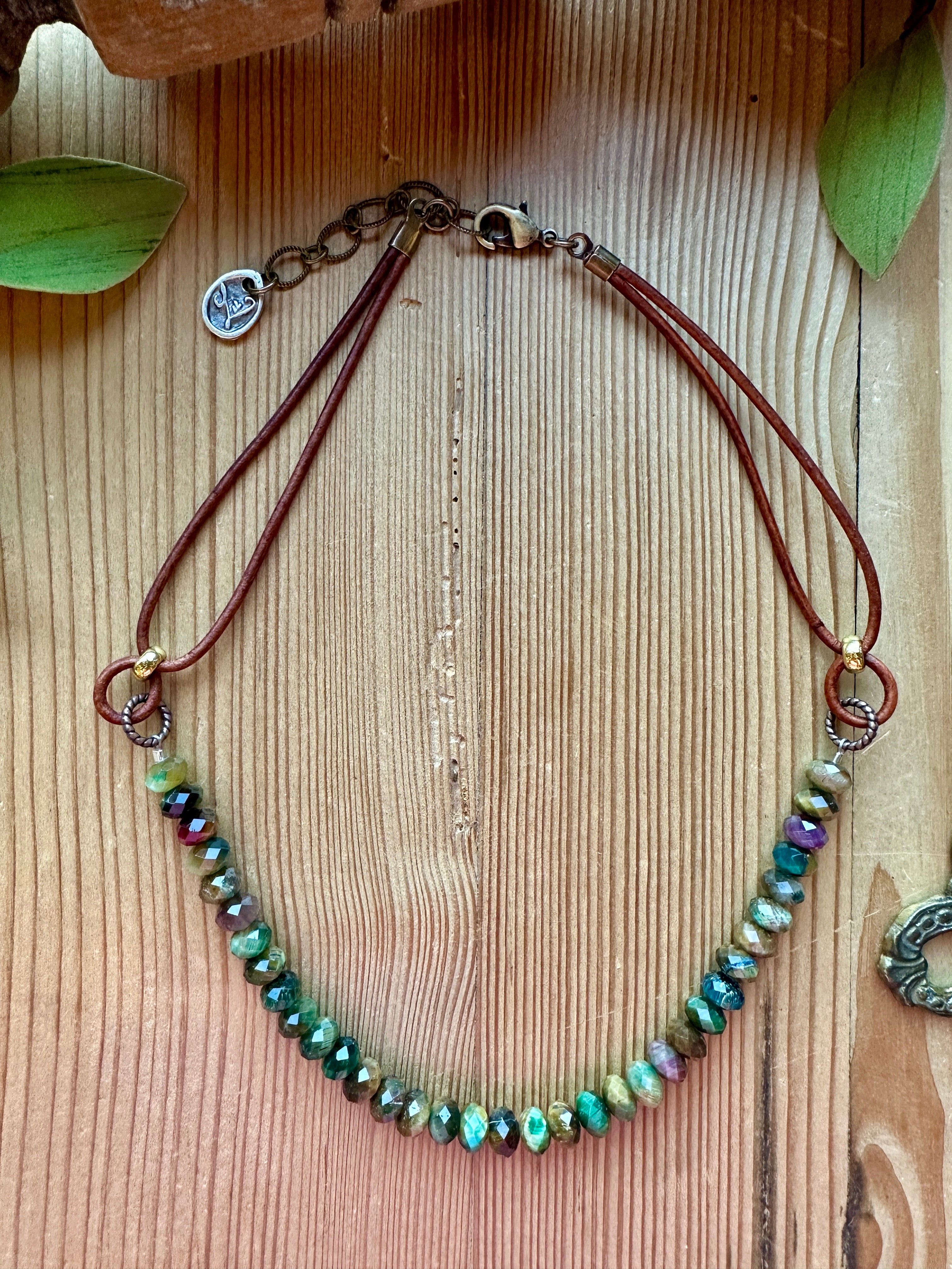 Measuring approximately 17 inches and extending to 19 inches, this necklace rests gracefully along the neckline. The warm brown leather cord adds an organic, boutique touch while antique brass hardware completes the handcrafted aesthetic. Its versatile style pairs perfectly with artistic clothing, boutique fashion, or handmade bracelets from the same collection.