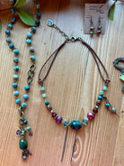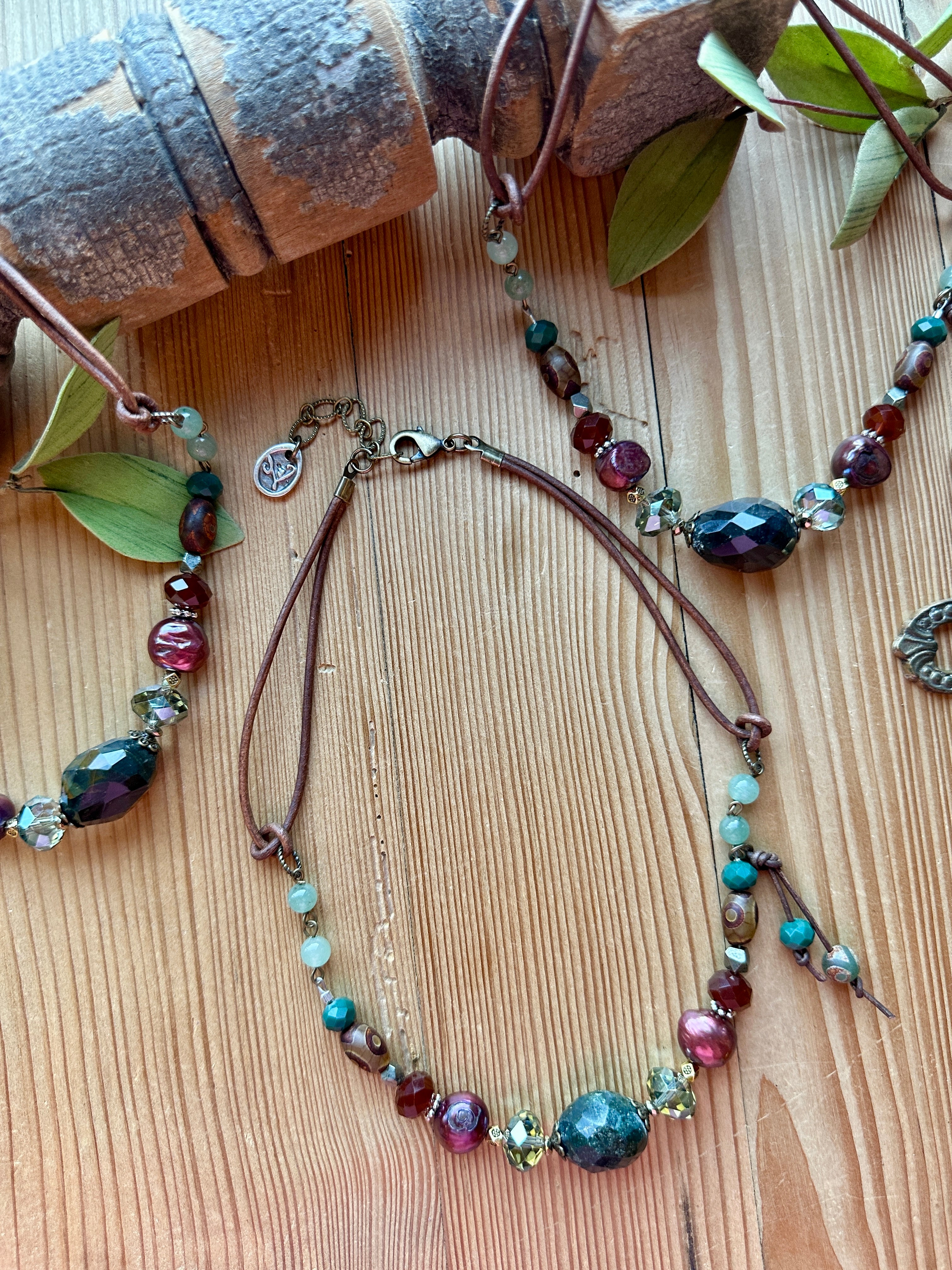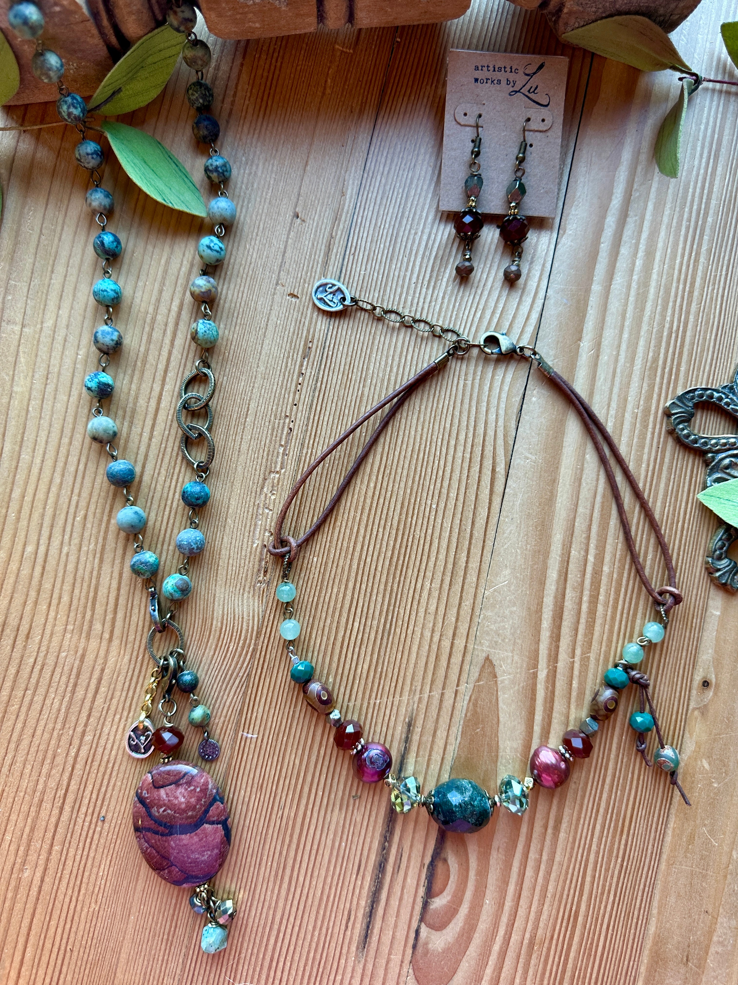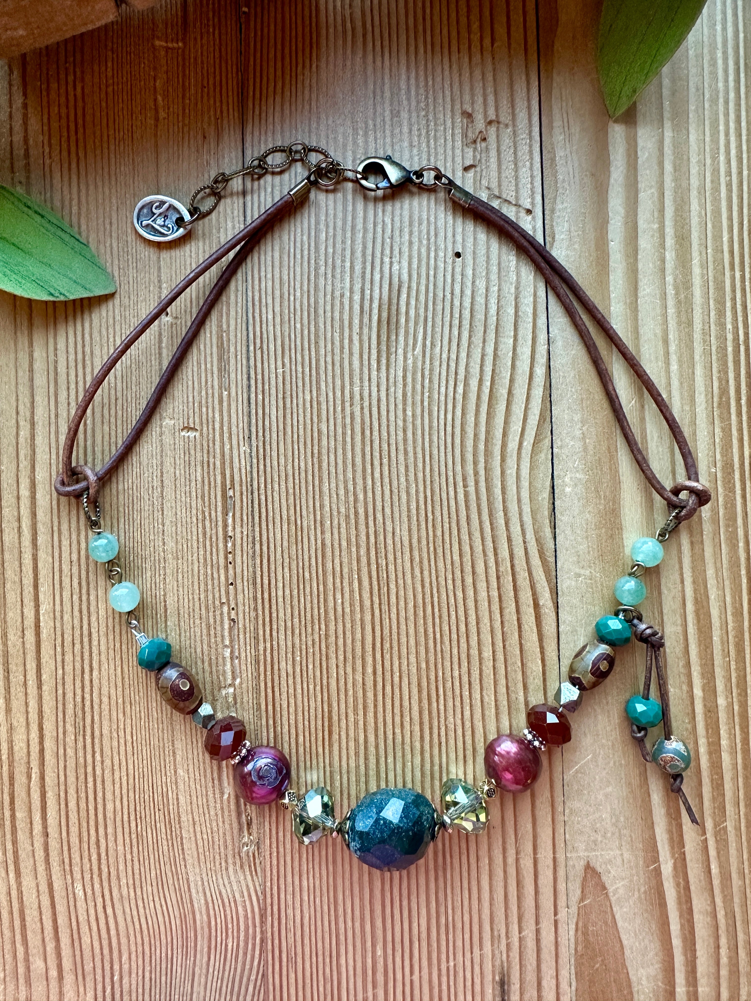 This handmade artisan necklace from Artistic Works by Lu showcases a stunning moss agate center stone surrounded by an artful mix of glass, crystal, and semi-precious beads. Each bead is chosen for its unique color and character, blending rich jewel tones with earthy greens and warm neutrals. The design rests on a soft brown leather cord, giving the piece an organic, grounded feel while maintaining an air of boutique sophistication.