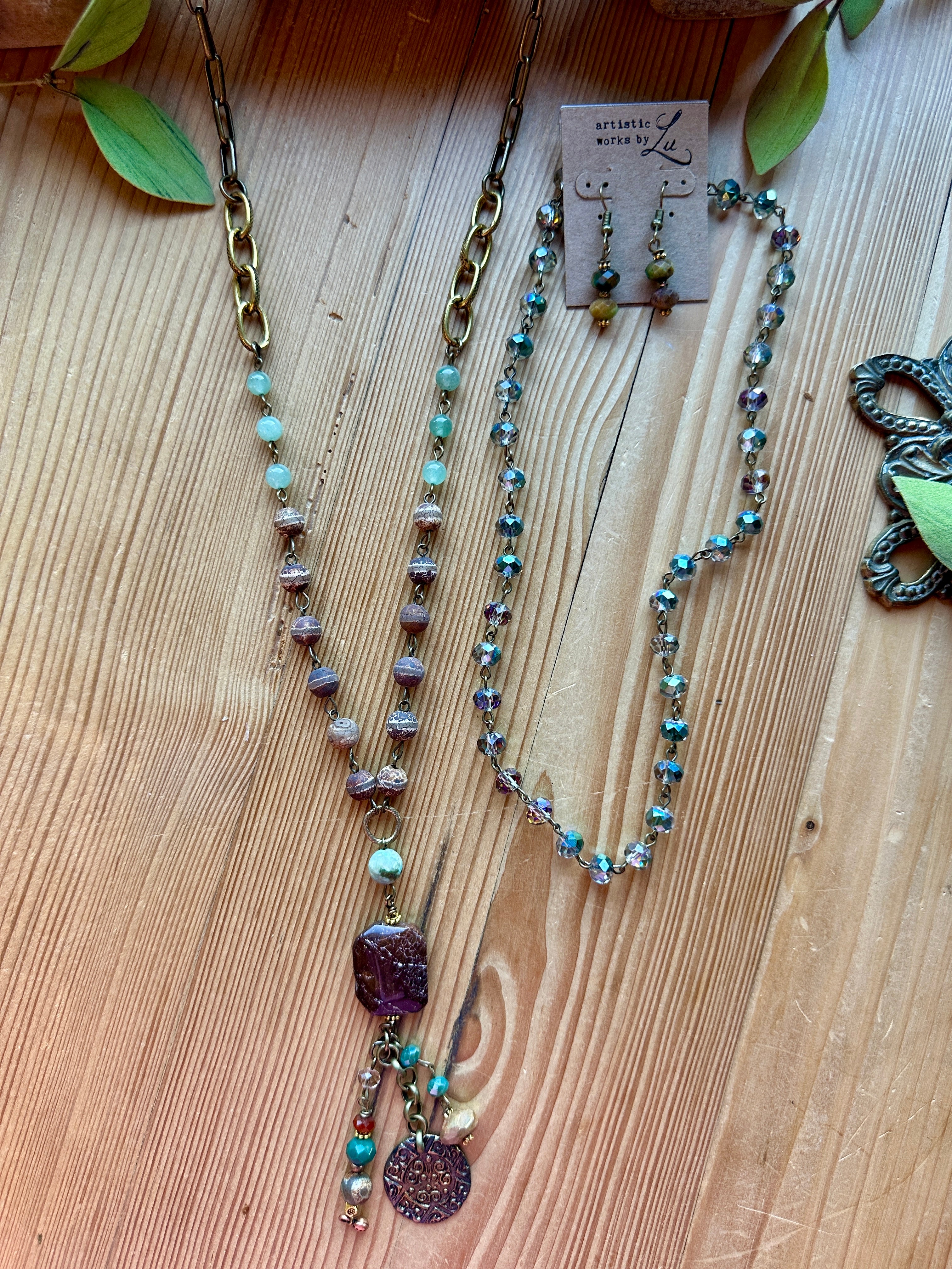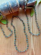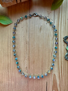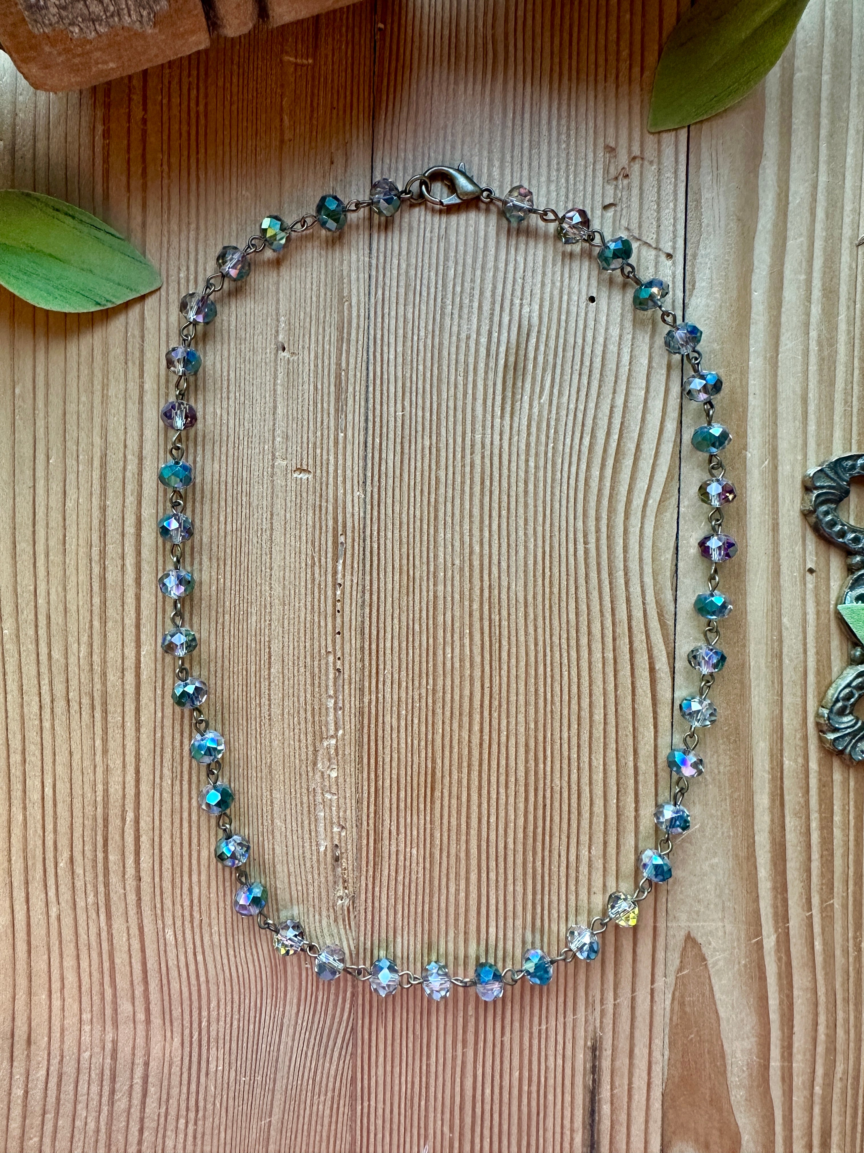 This handmade artisan necklace from Artistic Works by Lu captures light and movement with every turn. Designed with delicate faceted beads that shimmer with an iridescent finish, this piece radiates a subtle rainbow glow, shifting between soft hues of aqua, violet, and gold. Each bead is hand-linked in antique brass, creating a refined and timeless design that complements any outfit.