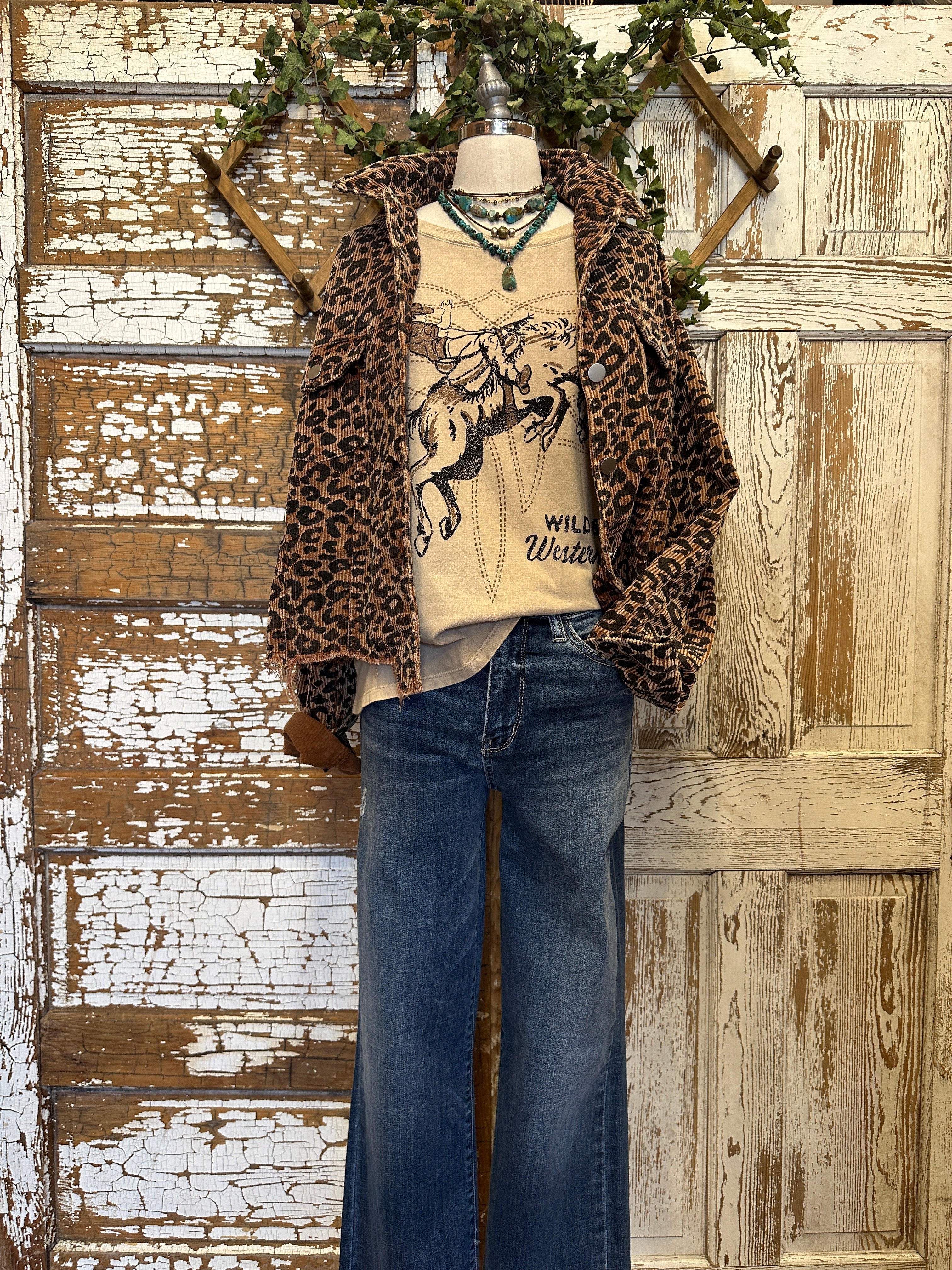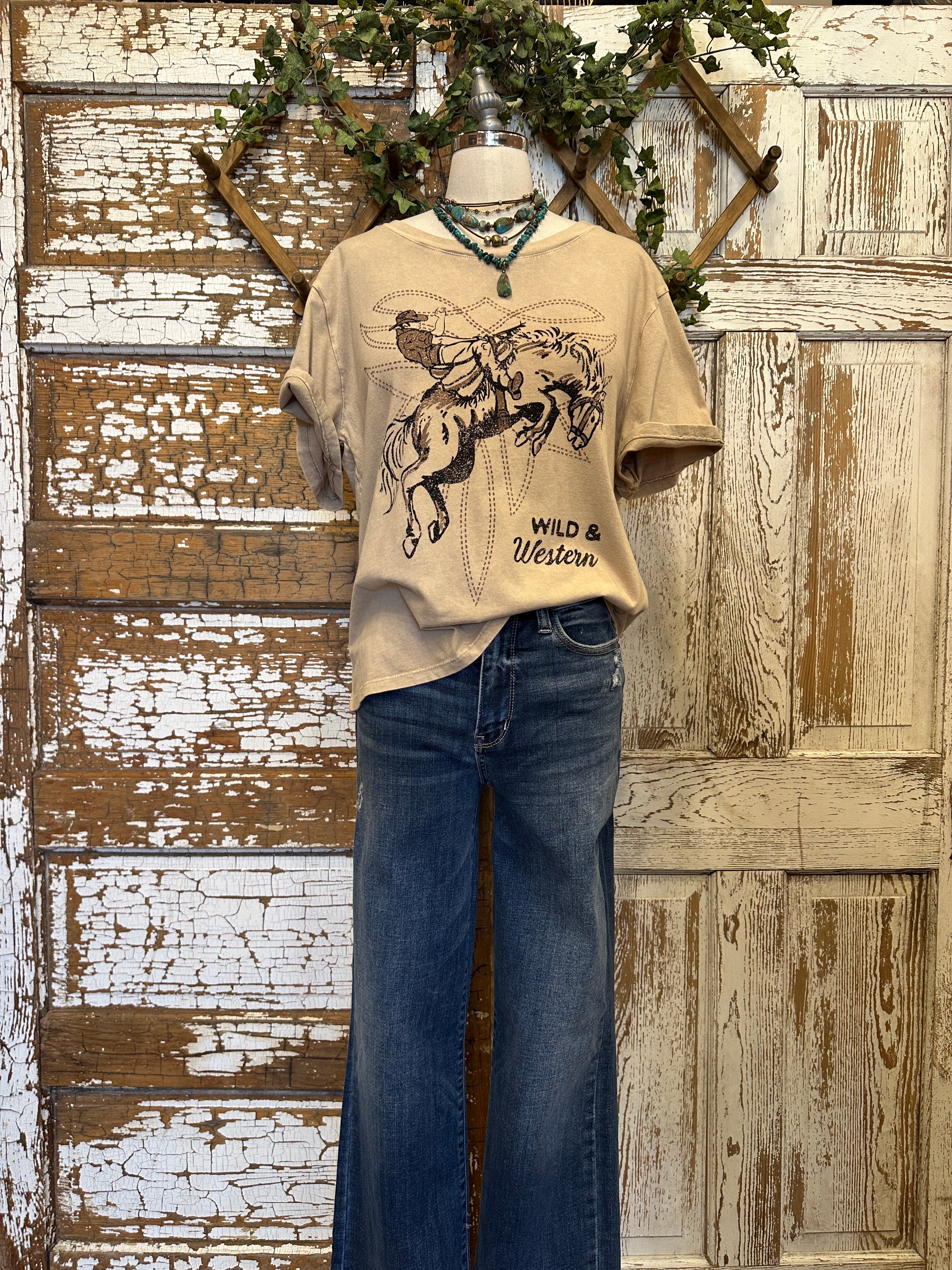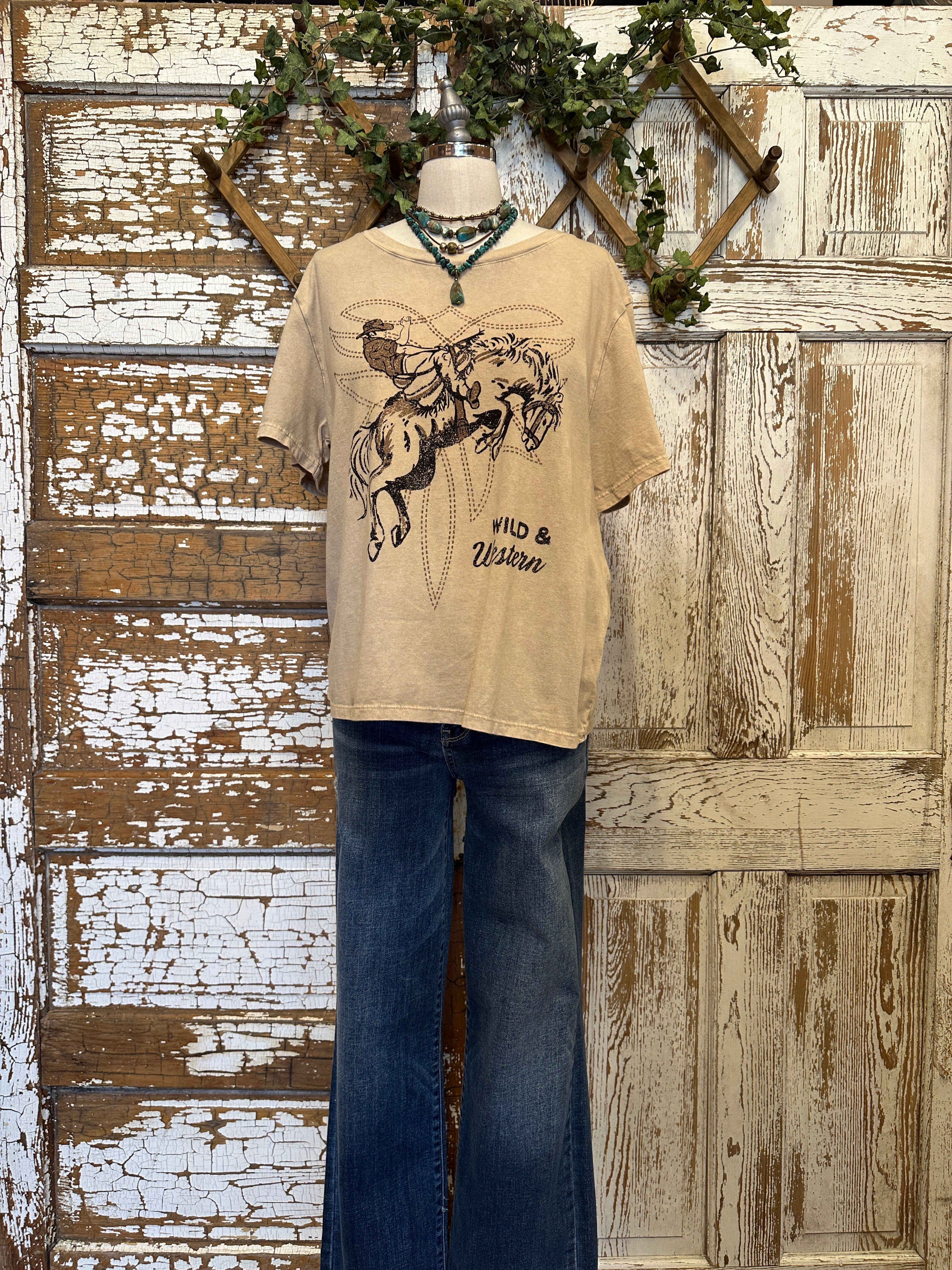 Saddle up in style with this Wild & Western graphic t-shirt! Featuring a vintage-inspired cowboy print, this boutique tee combines comfort with a little Western flair. Styled with handmade necklaces, it’s a casual staple you’ll wear on repeat.